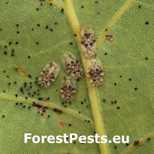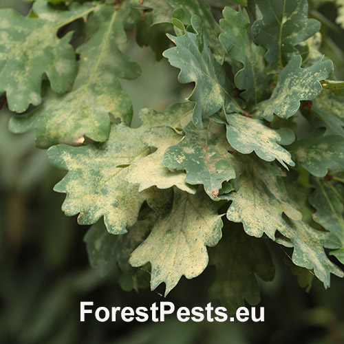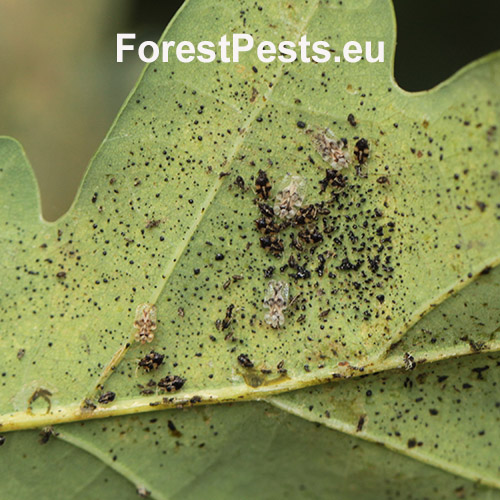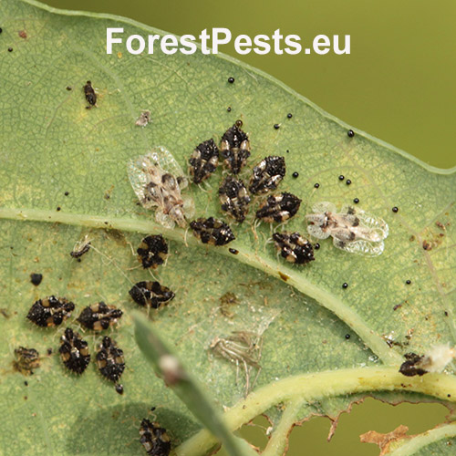 This North American species was first reported in Europe in 2000. The 3 mm long, bizarrely-shaped bugs overwinter in bark  crevices or in leaf litter. During spring the females attach clusters of 15 to several 100 black eggs on the underside of leaves. Upon hatching, the blackish spined larvae begin sucking on the leaves. There are 2–4 generations per year. Adults are usually present from June to September, and during this time they continue to feed on the leaves of oak trees. Feeding results in discoloured, pale, mottled leaves, which may, if the attack is heavy, drop prematurely. While the oak lace bug is considered a pest of oak trees, it typically does not cause significant harm to the trees. However, severe infestations can occur, particularly in areas where the bugs are abundant. In these cases, the oak lace bug can cause defoliation, weaken the tree, and make it more susceptible to other pests and diseases. Control measures for the oak lace bug include biological control with natural predators and parasites, as well as physical removal and chemical treatments in severe cases. It is important to monitor for infestations and take action if necessary to prevent the spread of the bug and protect the health of oak trees. Past experience with a similar insect (Corythucha ciliata) shows that it could become more harmful in the near future. It inhabits forests, parks and gardens.