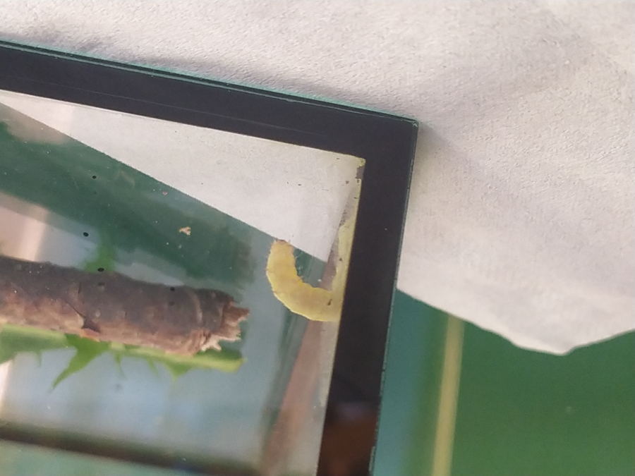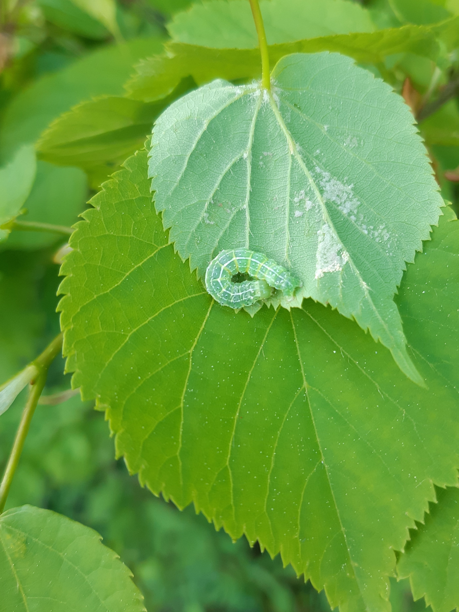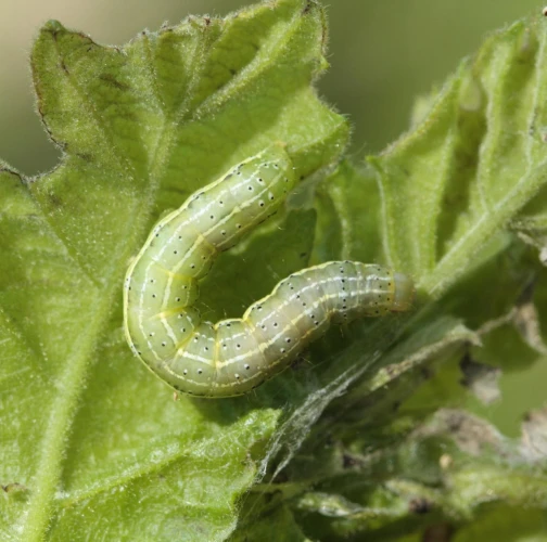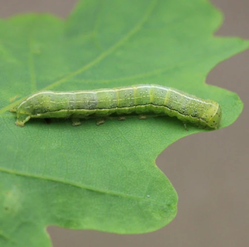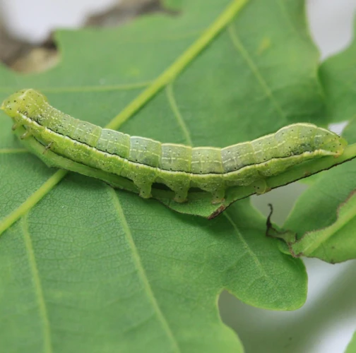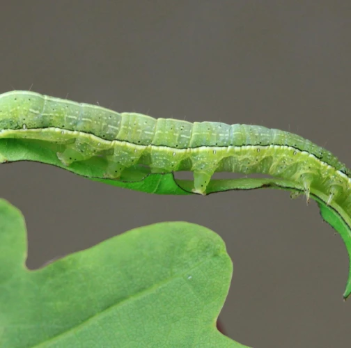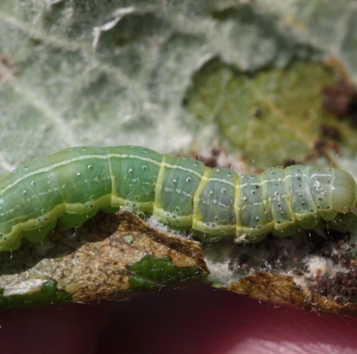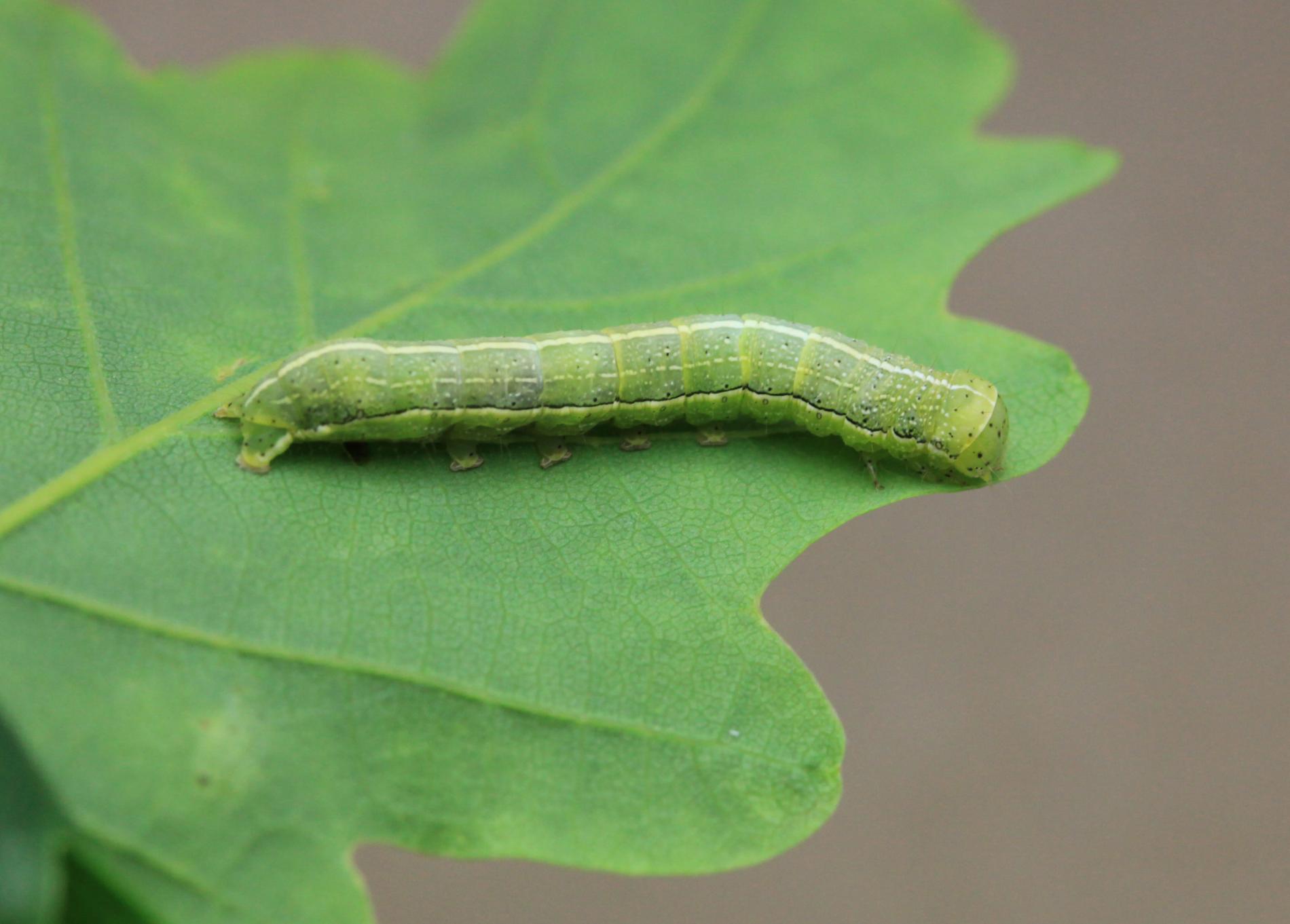 A green caterpillar with a series of tiny black dots and a characteristic white stripe on the sides that distinguishes it from several similar species.