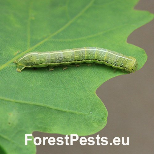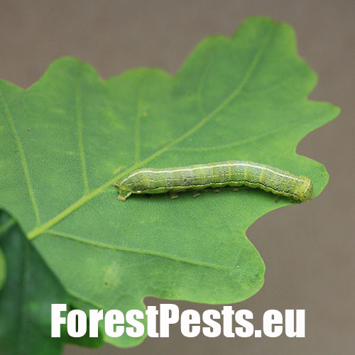 Wingspan is 30–35 mm, ground colour yellow-brown to reddish-brown with conspicuous two lines which divide forewings to thirds, when medium third is darker. Larva is up to 35 mm long, mature yellow-green to grass-green. Dorsal line is wider than subdorsal one, yellow-white in colour. Lateral line is very wide, greenish-yellow, yellowish on margins lies above the spiracles and goes to anal legs. Dark and inconspicuous narrow line is above that lateral line. Spiracles are greyish, with brown circle and white centre. Pinnacles are small, but conspicuous, dark. Setae are small, dark and conspicuous. Head green with dark-brown mouthpart and black eyes. Larva feeds polyphagously on broadleaved trees, such as Quercus spp., Ulmus spp. etc., facultative entomophagous. The dun-bar prefers deciduous forests, orchards, gardens. Abundant and widespread in oak stands, in warmer regions often not rare.