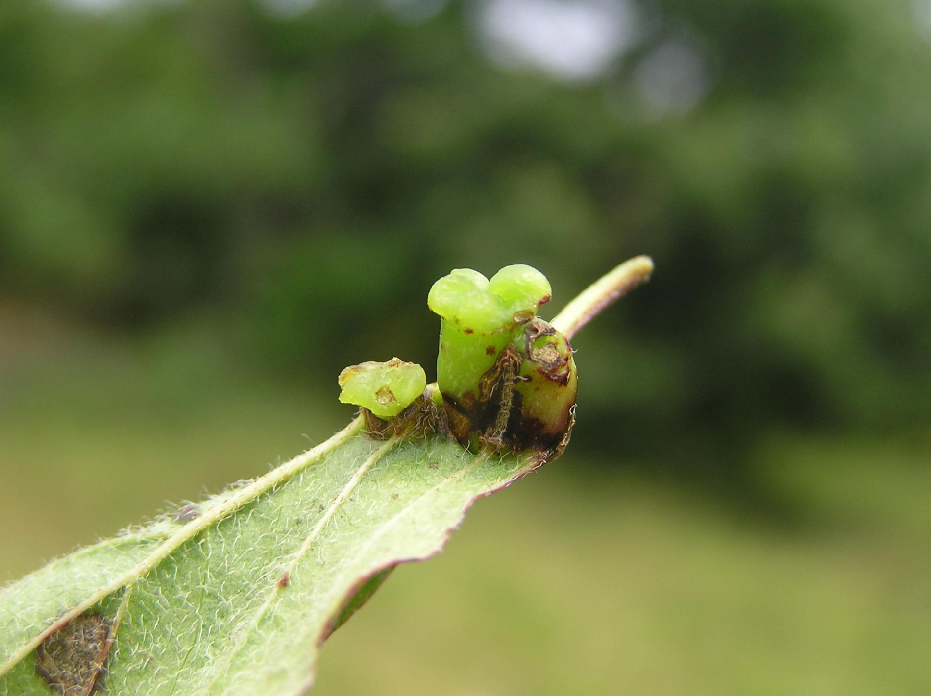 On leaves are found massive galls. On the upperside of the leaf they look like relatively regular, smooth, conical outgrowths, about 5-6 mm tall, on the underside of the leaf they are like irregular ‘roots’ of the same shape, about 8-15 mm long.