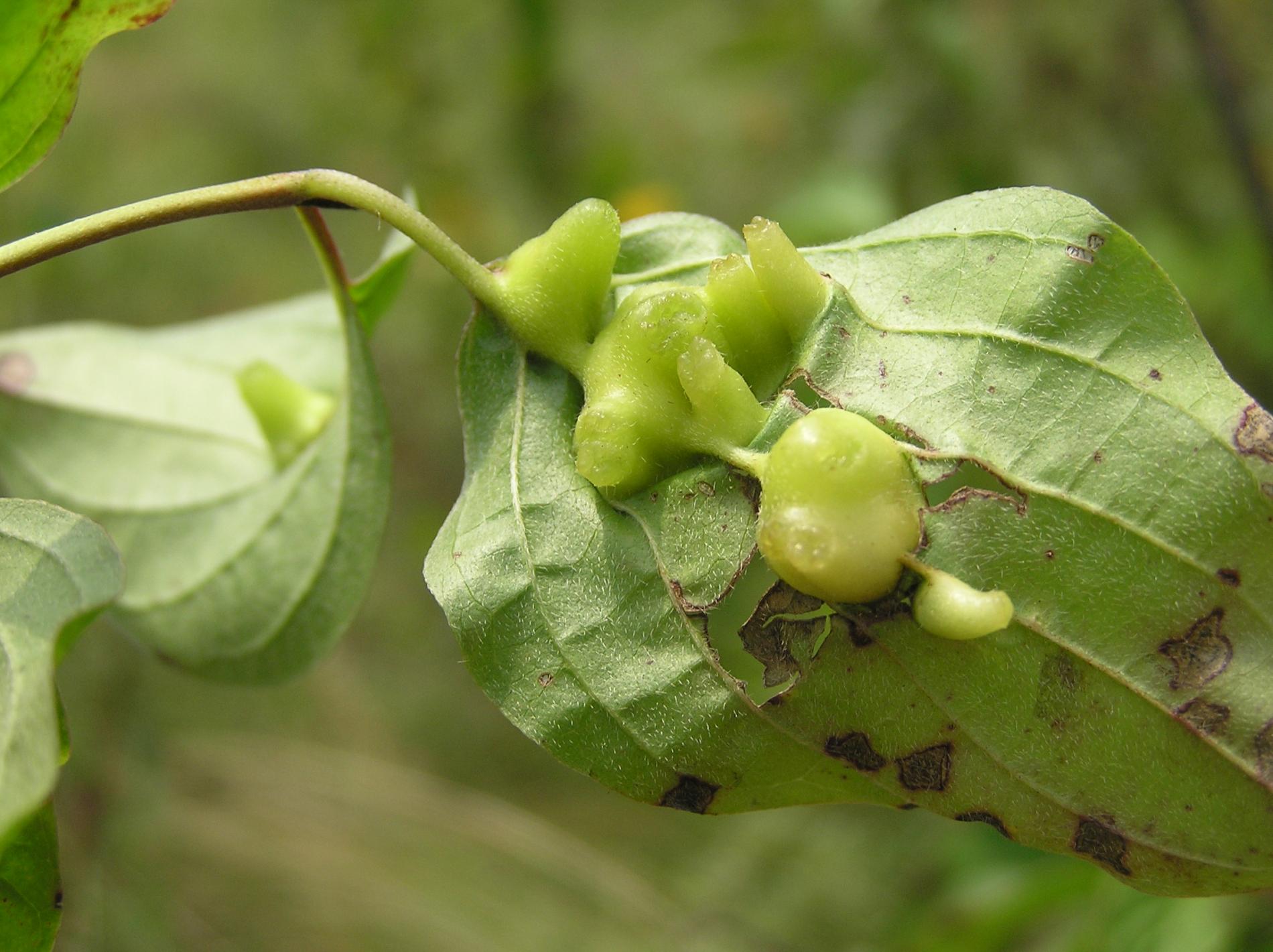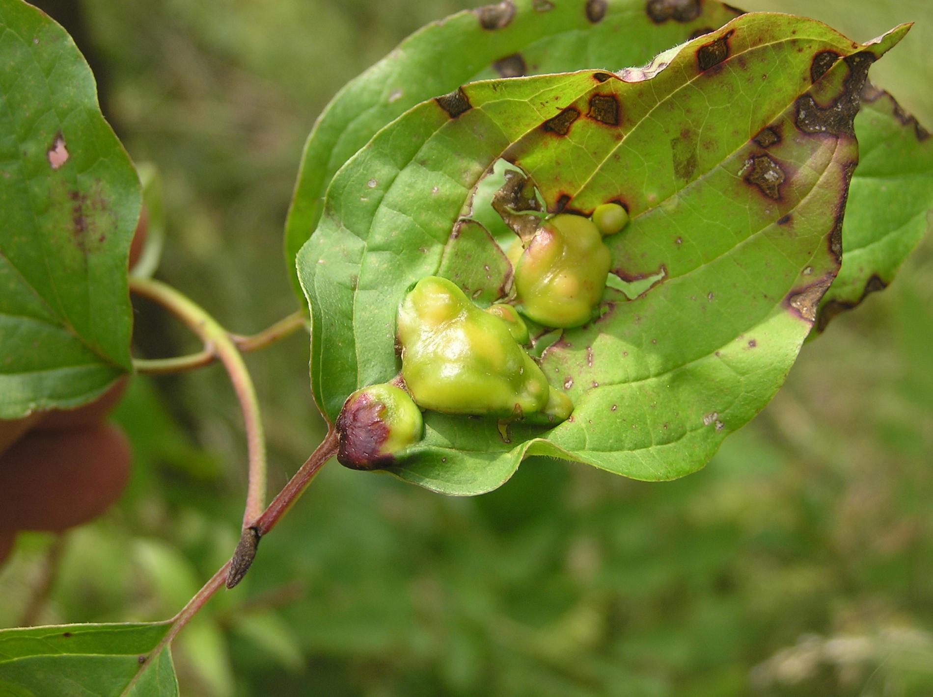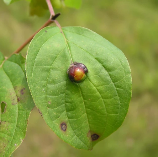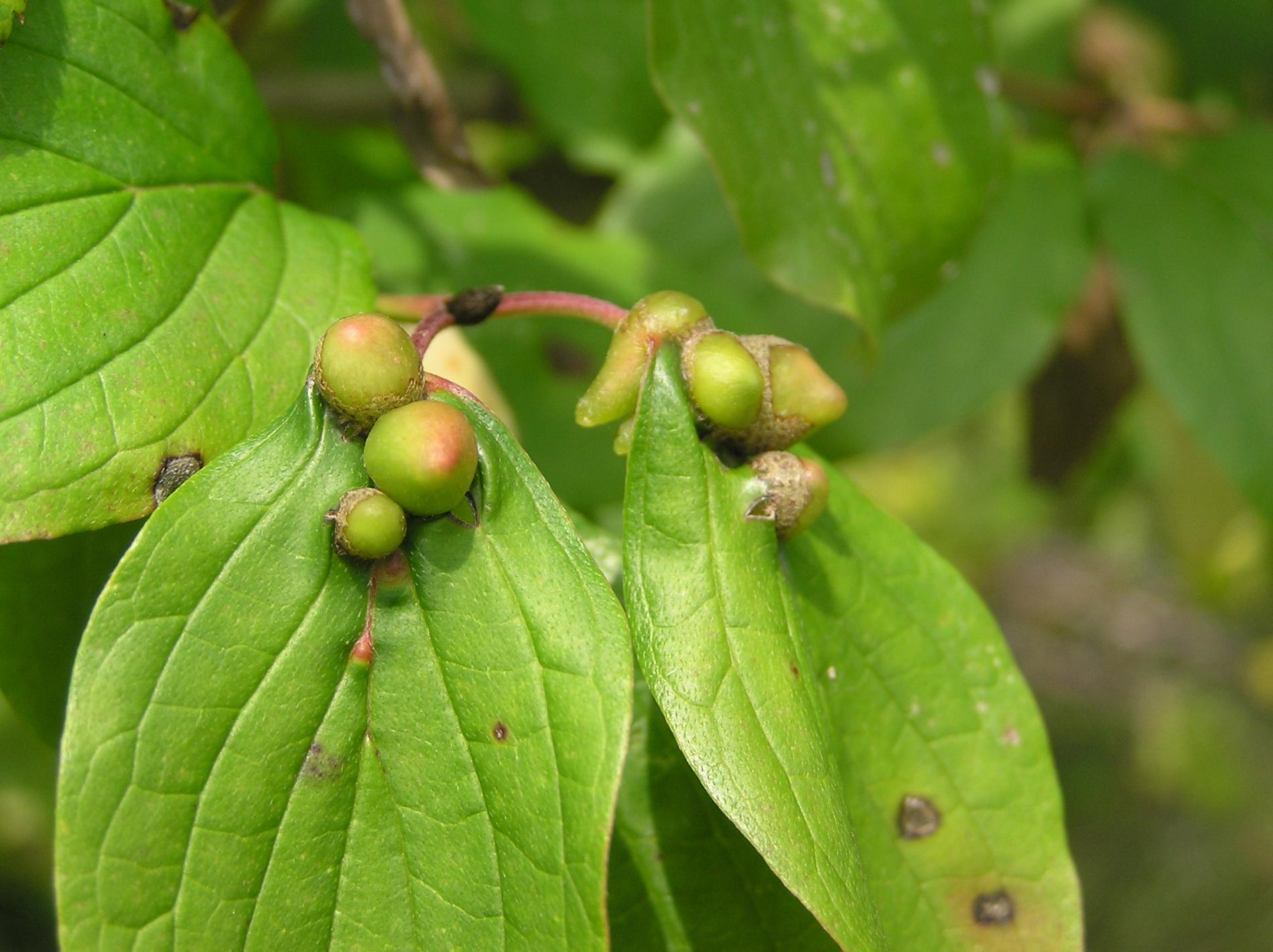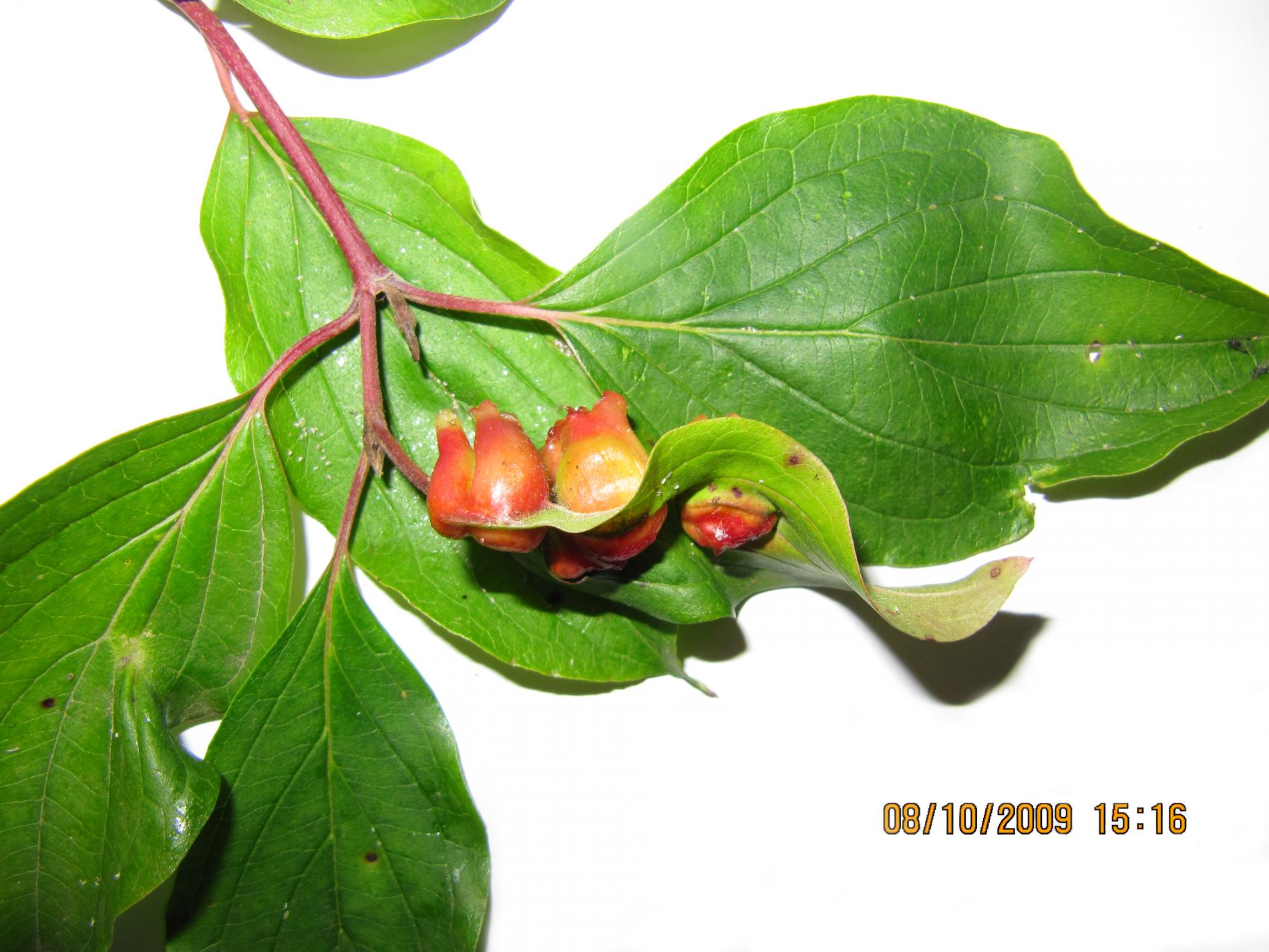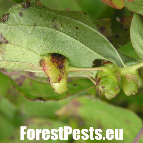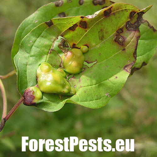 On leaves of Cornus are found massive galls. On the top side they look like relatively regular, smooth, conical outgrowths, about 5-6 mm tall, on the bottom side of the leaf they are like irregular ‘roots’ of the same shape, about 8-15 mm long. The colour of the gall is from green to reddish-brown. Massive occurrence of the species is relatively common and often almost all leaves of the tree are attacked. Larvae hibernate in the soil and pupate in the spring.