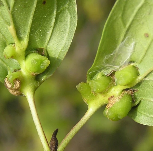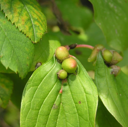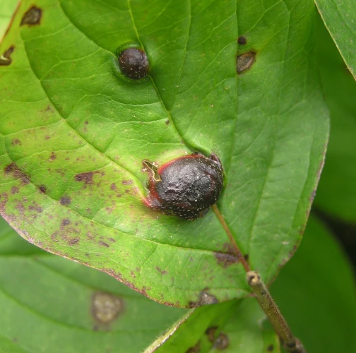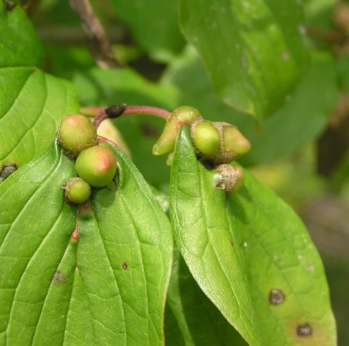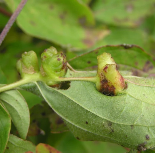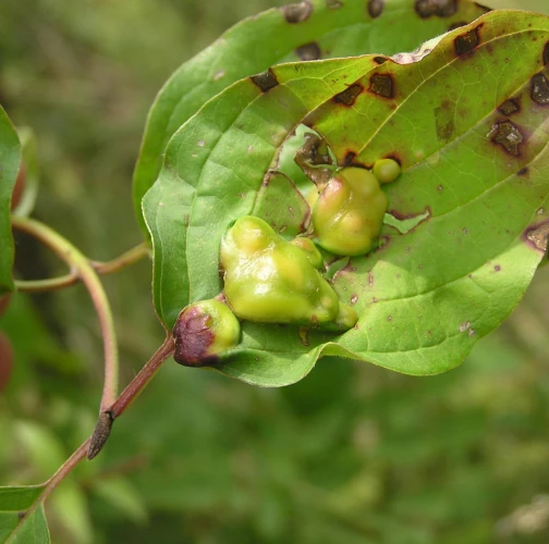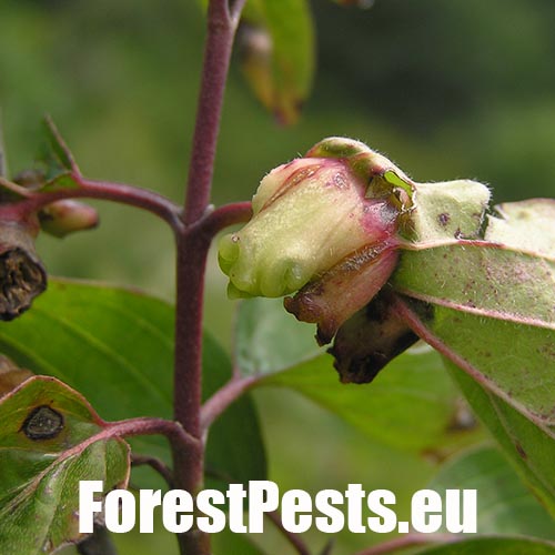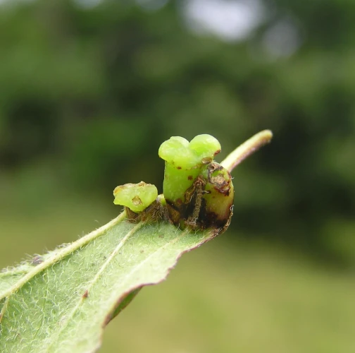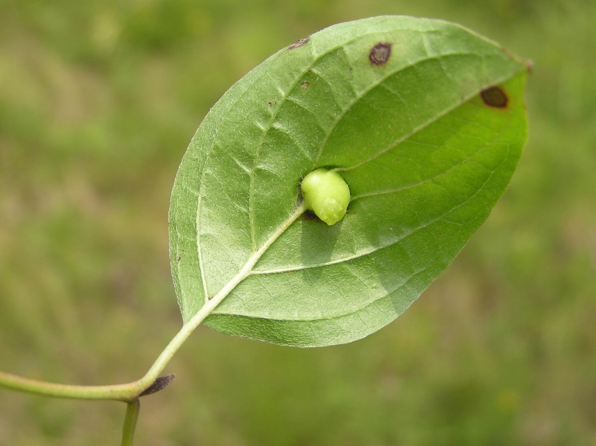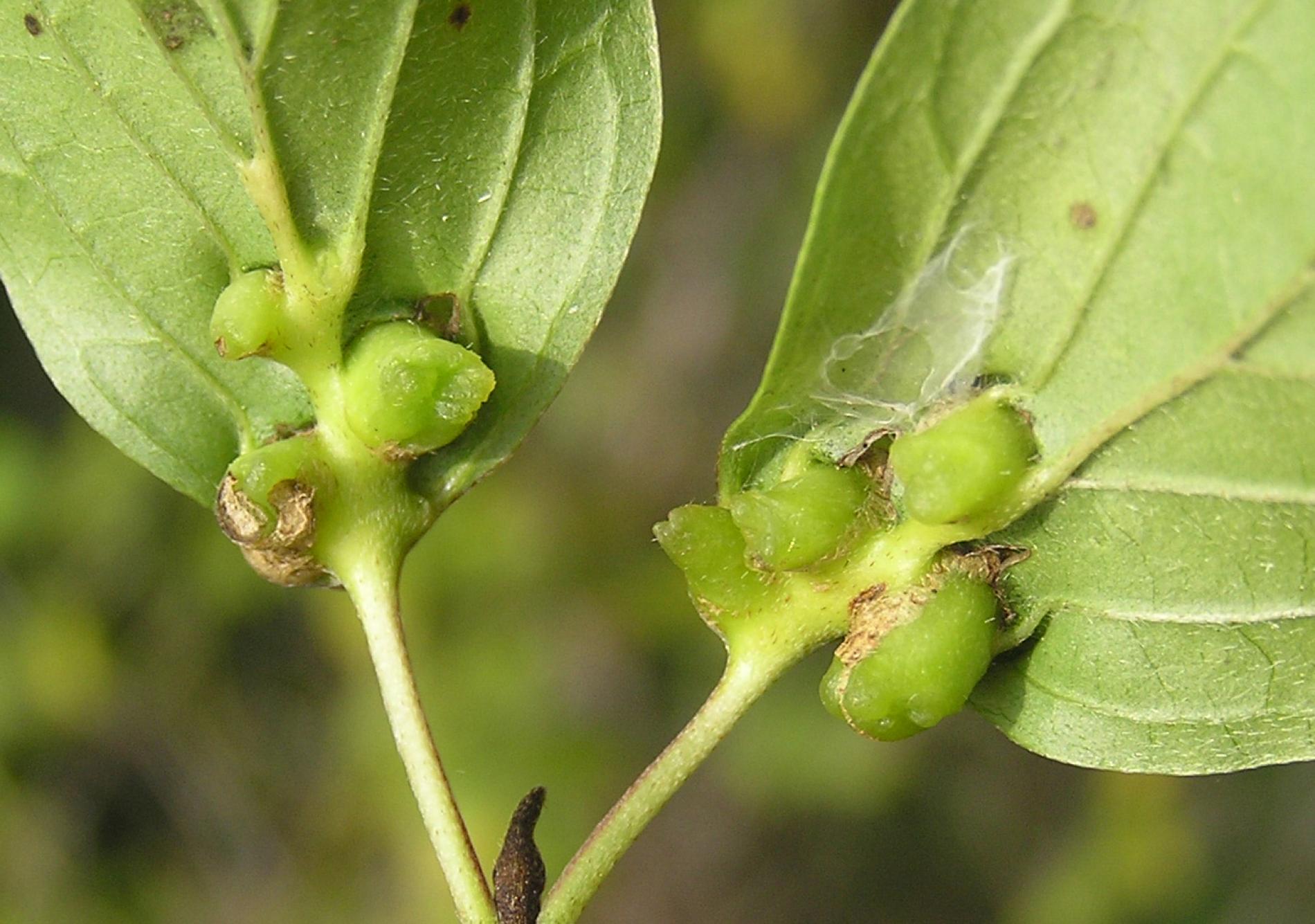 On leaves of Cornus are found massive galls. On the top side they look like relatively regular, smooth, conical outgrowths, about 5-6 mm tall, on the bottom side of the leaf they are like irregular ‘roots’ of the same shape, about 8-15 mm long. The colour of the gall is from green to reddish-brown. Massive occurrence of the species is relatively common and often almost all leaves of the tree are attacked. Larvae hibernate in the soil and pupate in the spring.