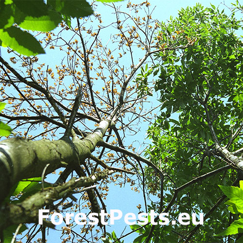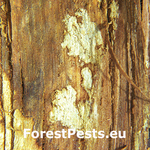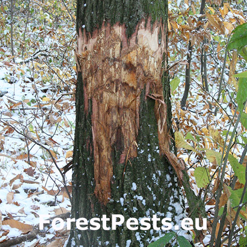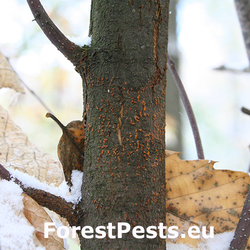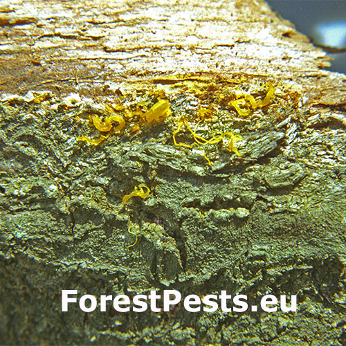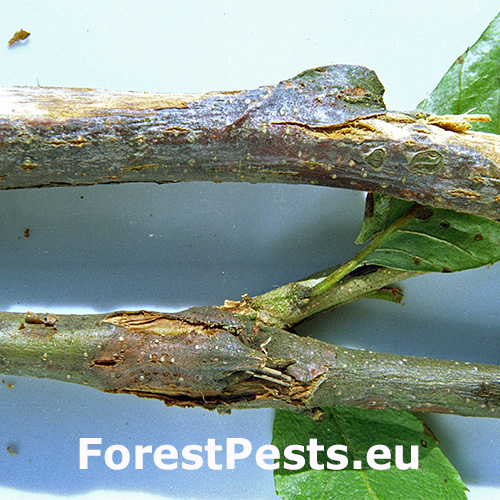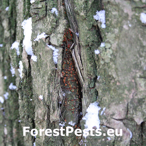 Bark is infected through wounds. With time, ochre to orange pillows of pycnidia are formed at the site of infection from which arise conidia stalks. Then, sexual perithecia of the same colour to red are formed. Infected bark cracks and typical canker wounds are created. Under the bark there is an ochre-white fan-shaped syrrocium. The part of the branch or the trunk above the  infection site dies back. In the USA, the fungus was discovered for the first time in 1904 and by the 1950’s American chestnuts (Castanea dentata) were nearly extinct in almost 100% of the area of its autochthonous distribution. In Europe, the disease was found for the first time in 1925 in Belgium and in England, later it was also found in Central Europe – former Yugoslavia, Hungary, Czech Republic, Slovakia, and other countries. This fungus is one of the most serious pests of chestnuts tree in Europe.