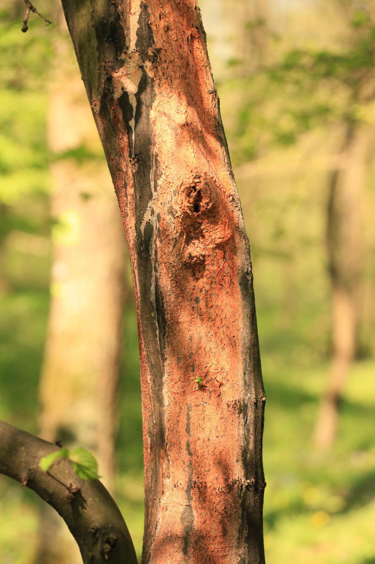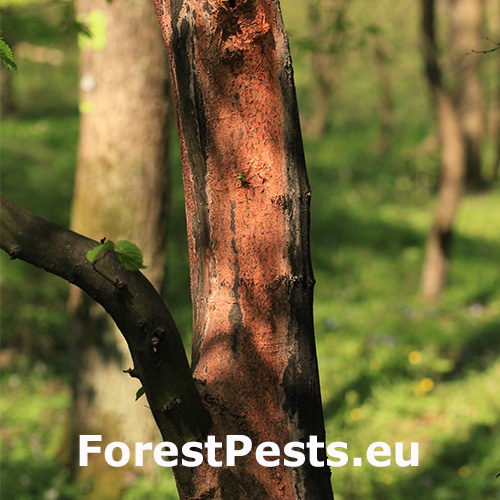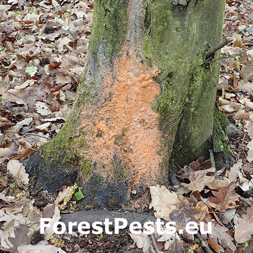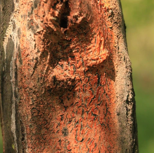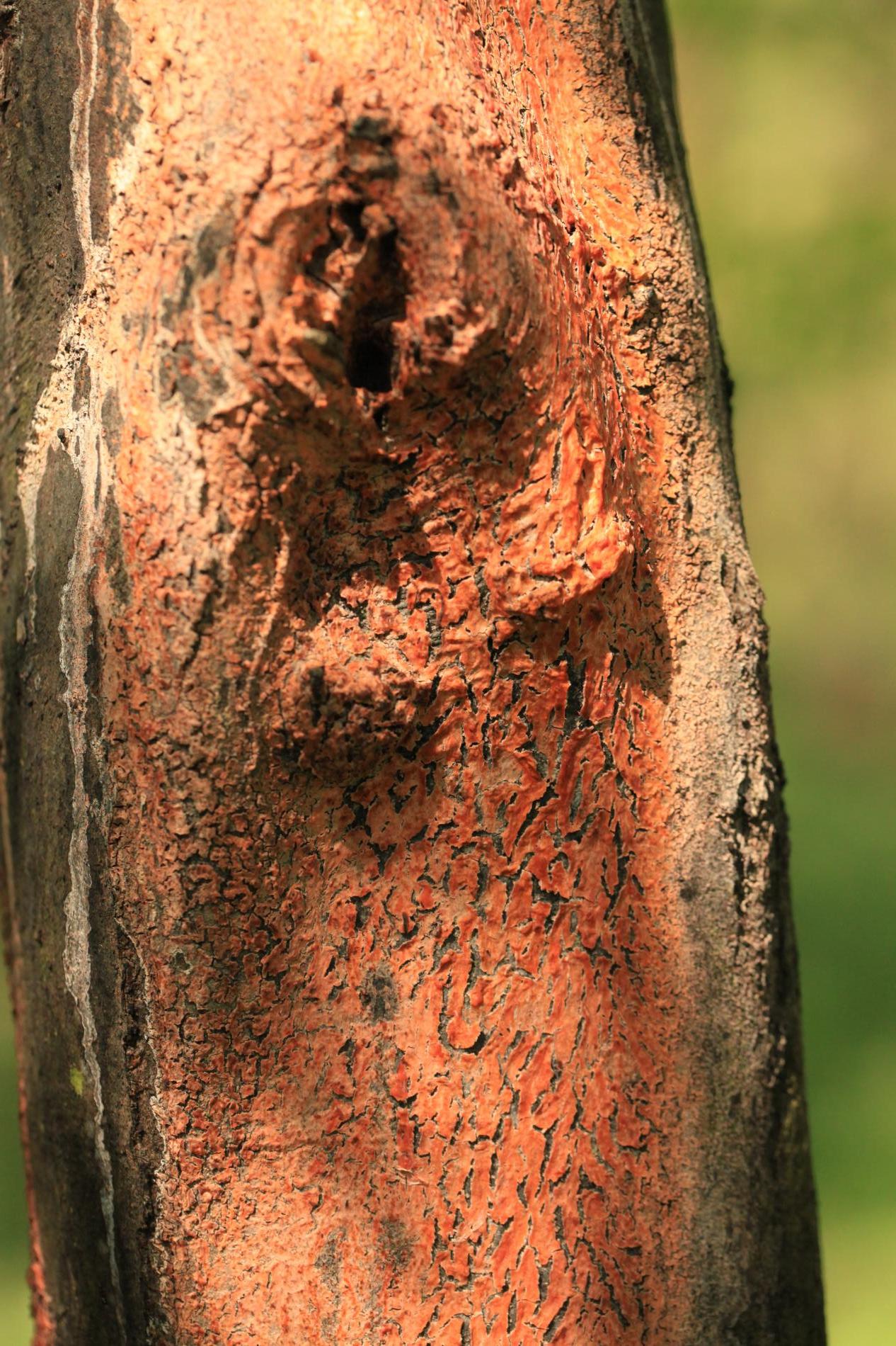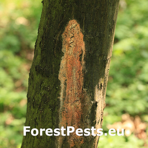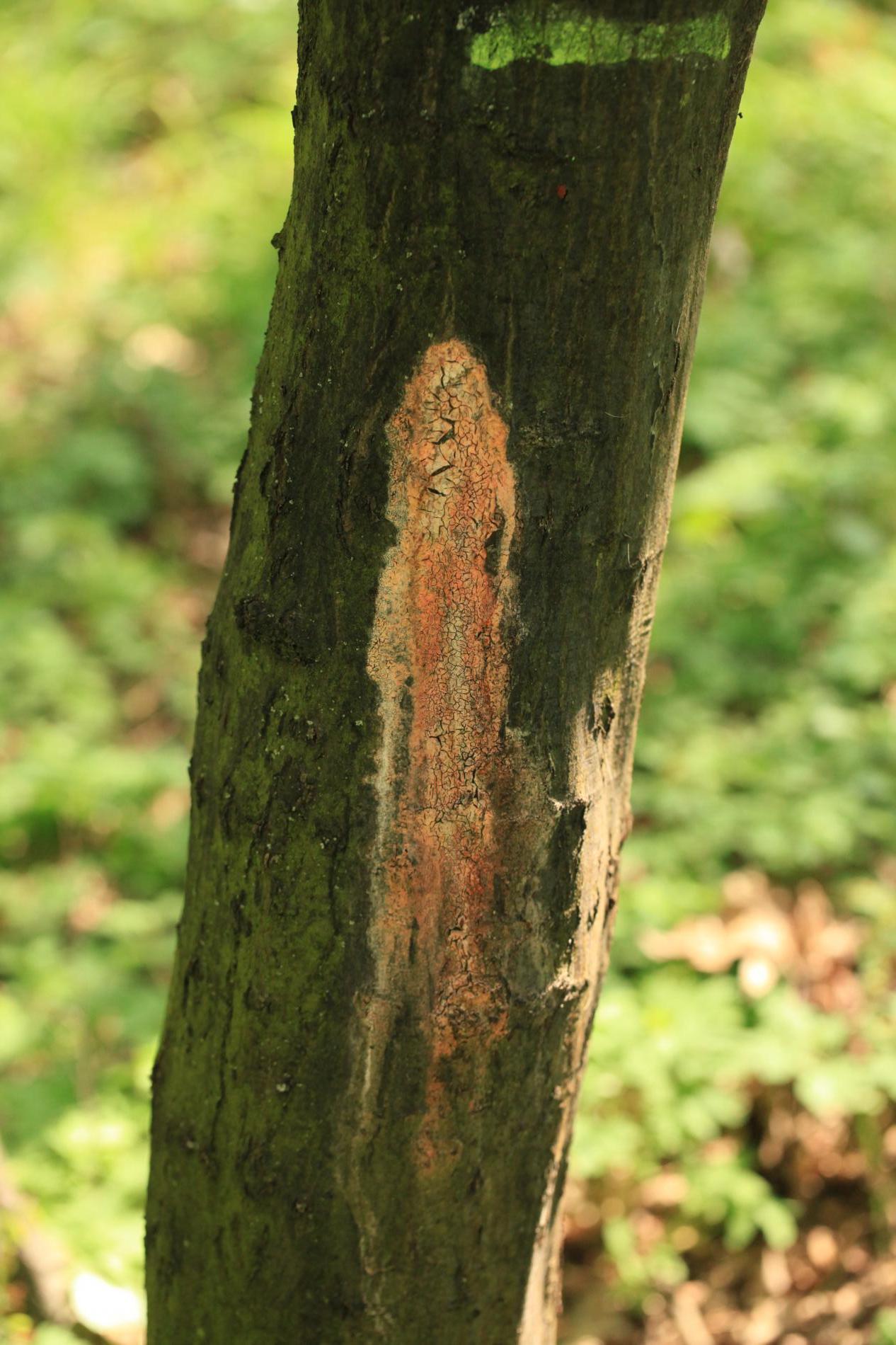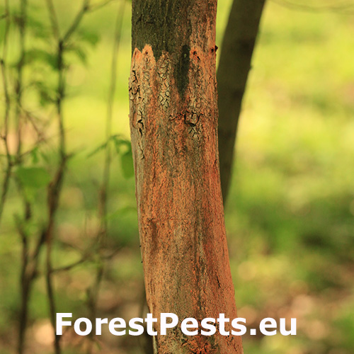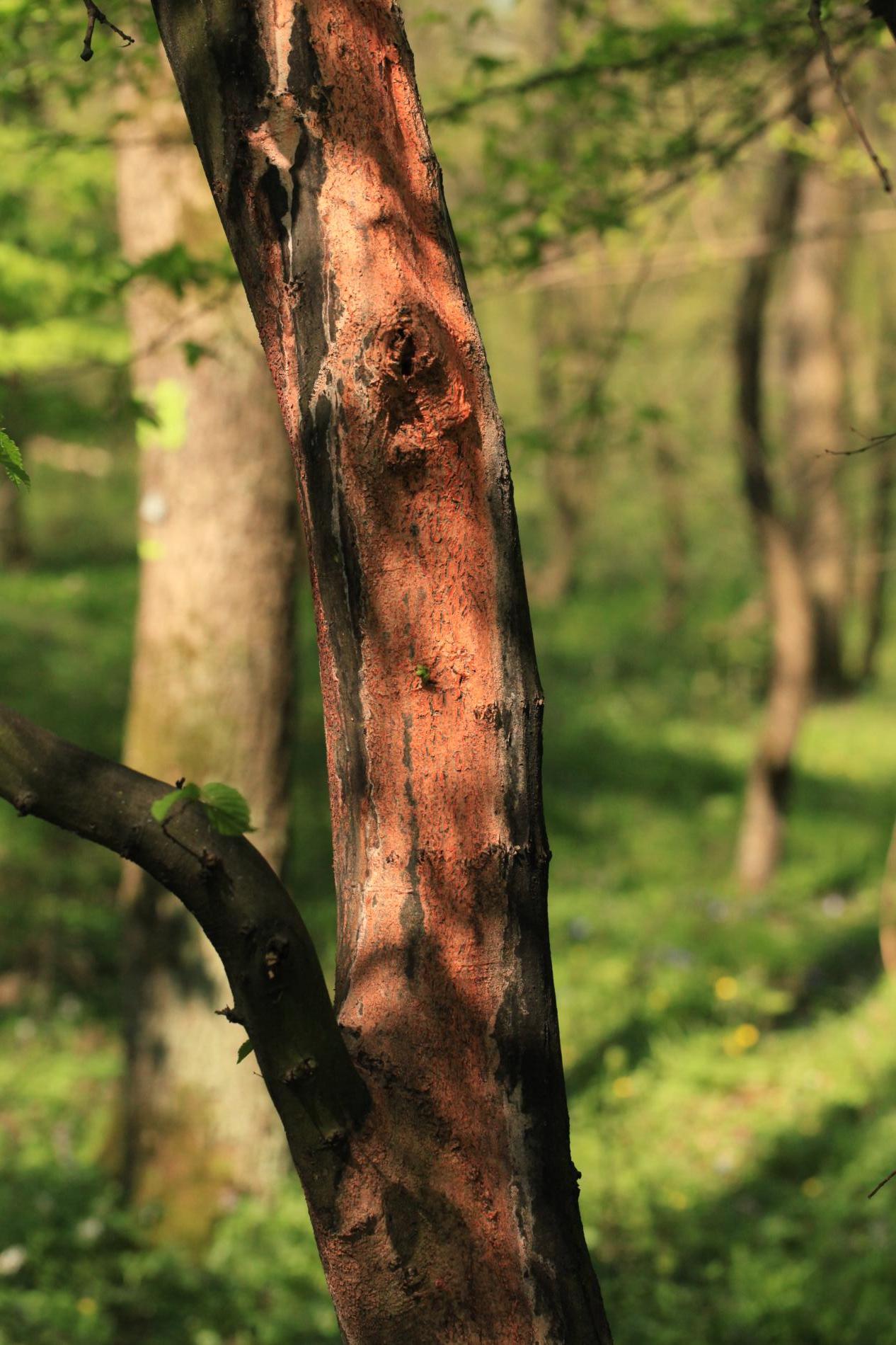 The orange-colored bark of some trees, a very common phenomenon on the trunk of the hornbeam trees, is caused by bacteria of the genus Cryptococcus spp. These bacteria attack the pulp that trees sow after injuring various types. Pulp rushes the trees, especially in the spring months, when they begin to sprout. The sap contains a number of substances, sugars, etc., which ferment and change with the help of the mentioned bacteria, often into an orange coating on the tree trunks. Injuries to the sapling tree can have various causes, with the count often damaging the bark by woodpeckers. This phenomenon disappears as soon as the wound from which the pulp flows out heals.