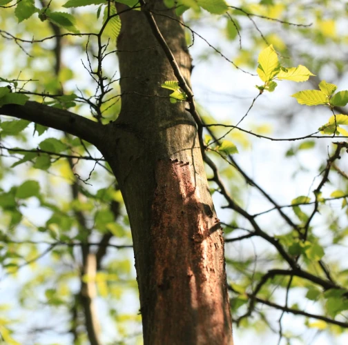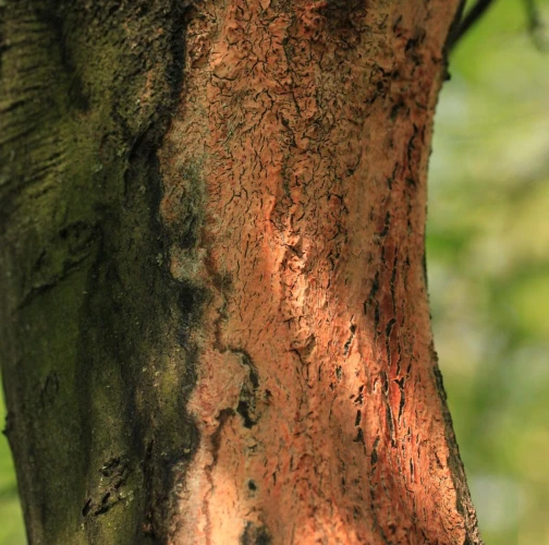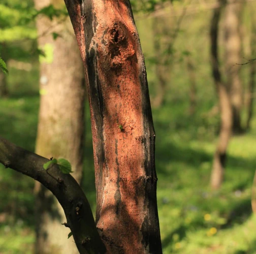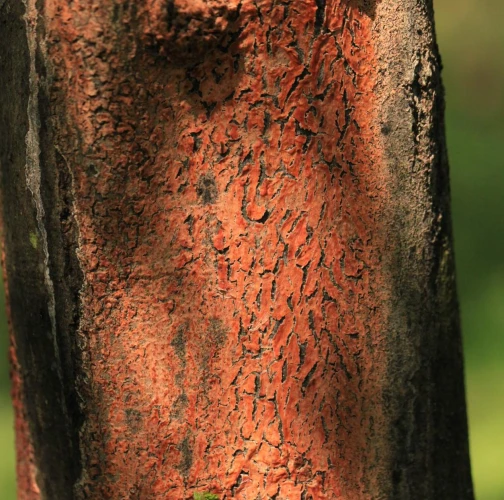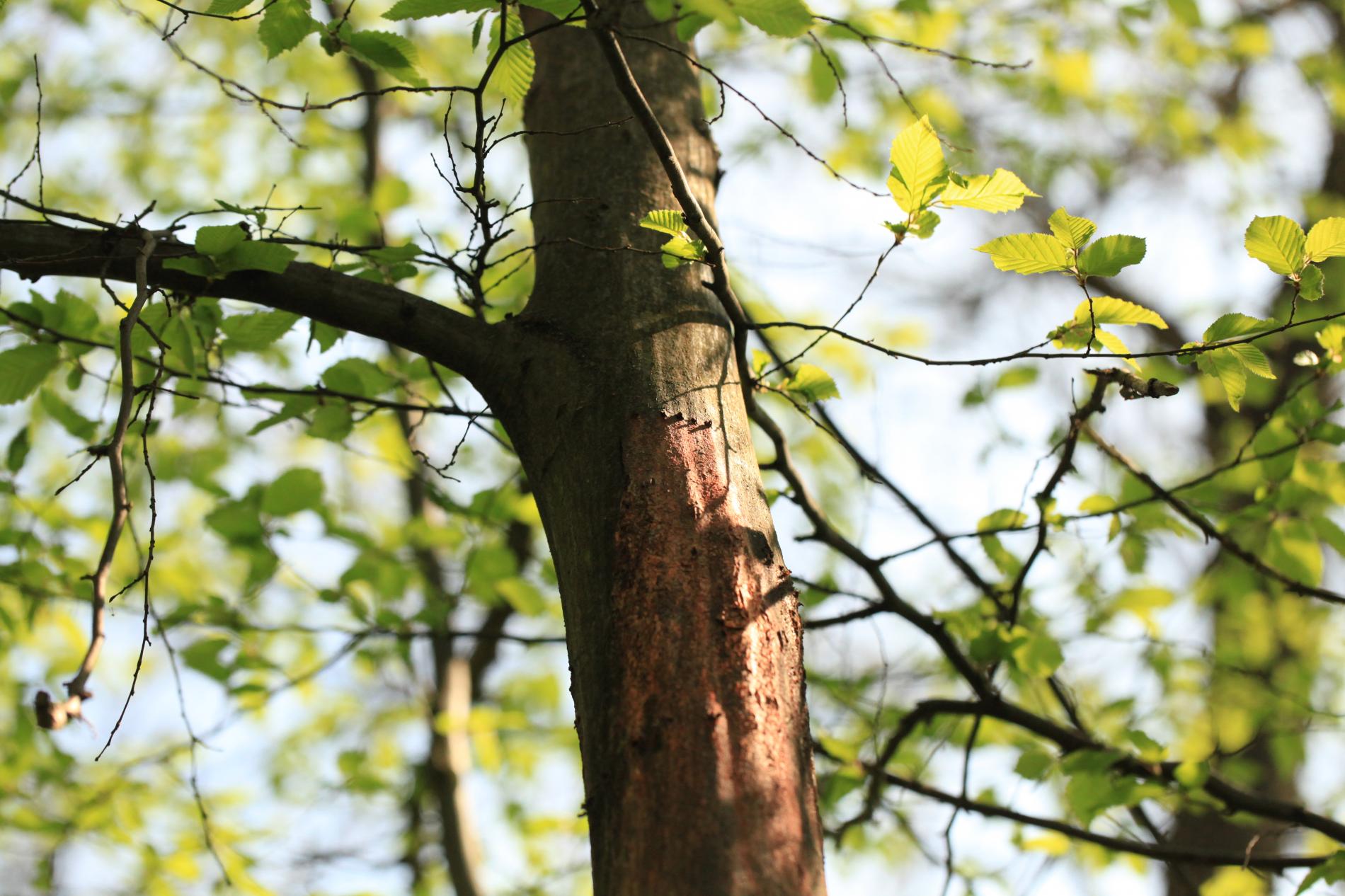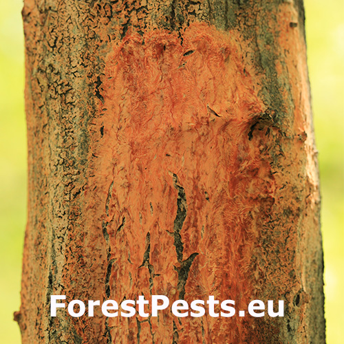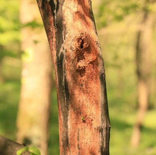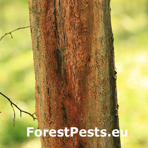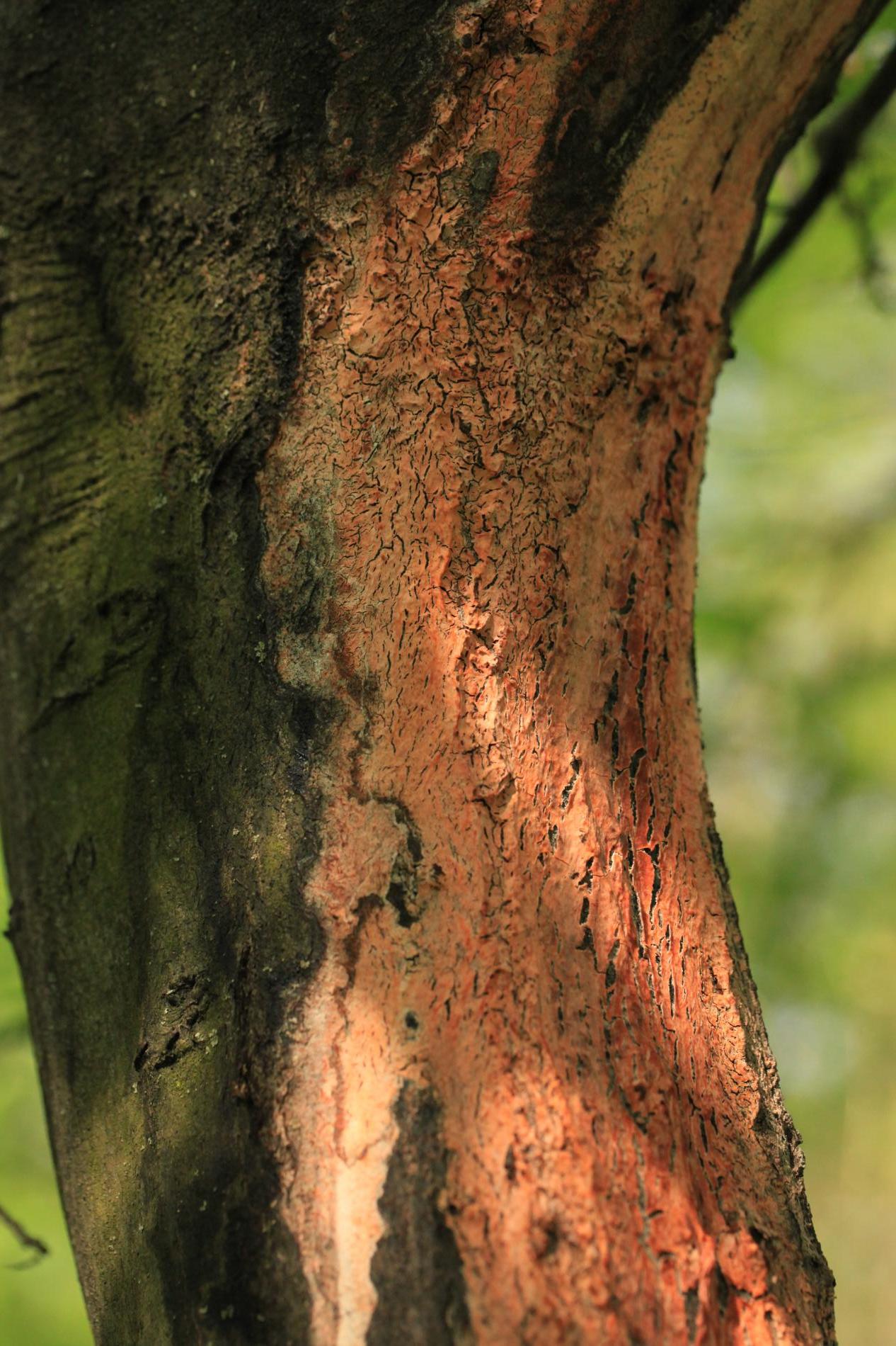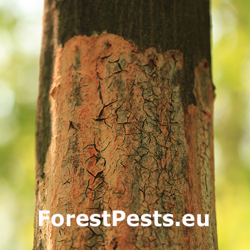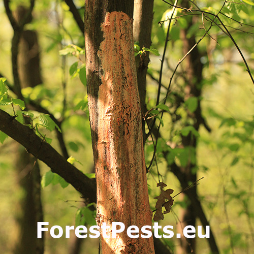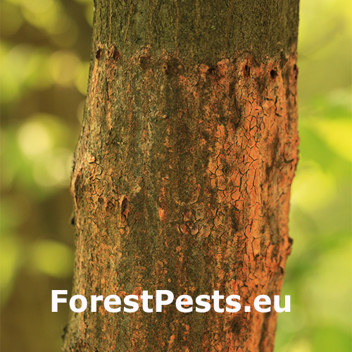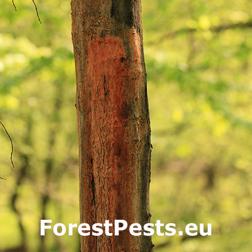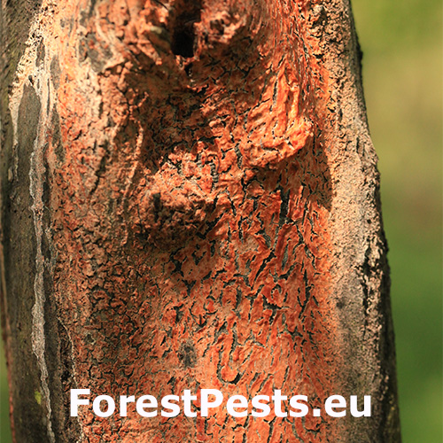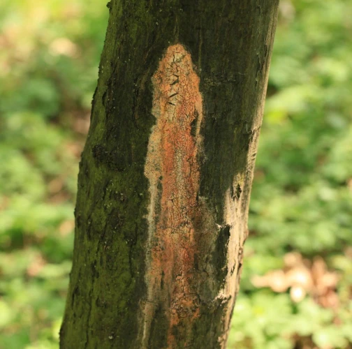 The orange-colored bark of some trees, a very common phenomenon on the trunk of the hornbeam trees, is caused by bacteria of the genus Cryptococcus spp. These bacteria attack the pulp that trees sow after injuring various types. Pulp rushes the trees, especially in the spring months, when they begin to sprout. The sap contains a number of substances, sugars, etc., which ferment and change with the help of the mentioned bacteria, often into an orange coating on the tree trunks. Injuries to the sapling tree can have various causes, with the count often damaging the bark by woodpeckers. This phenomenon disappears as soon as the wound from which the pulp flows out heals.