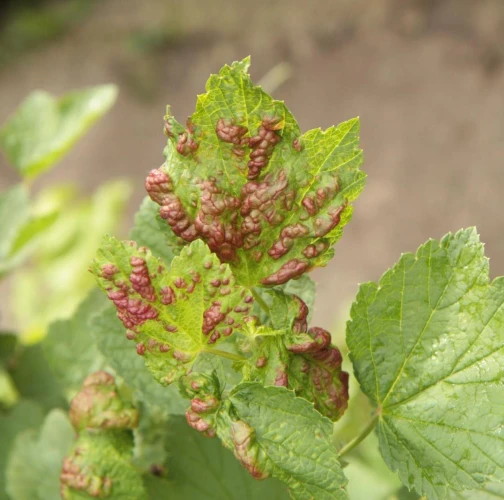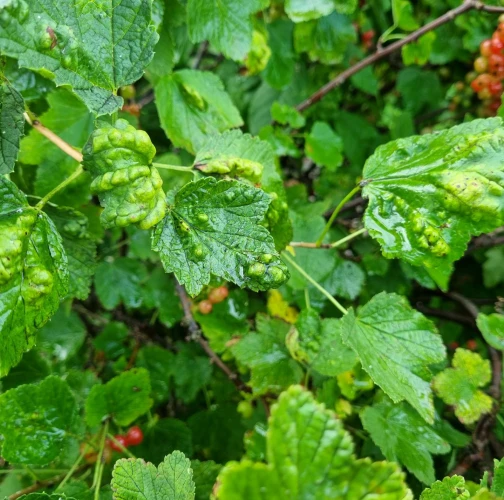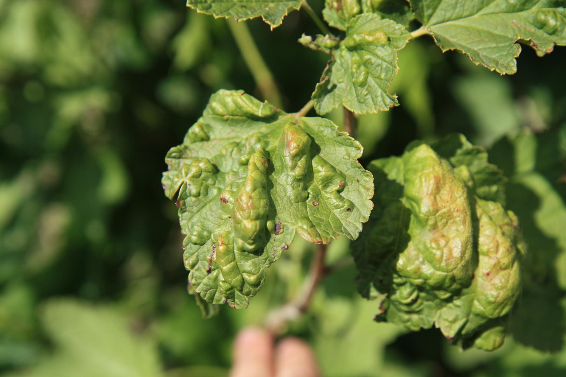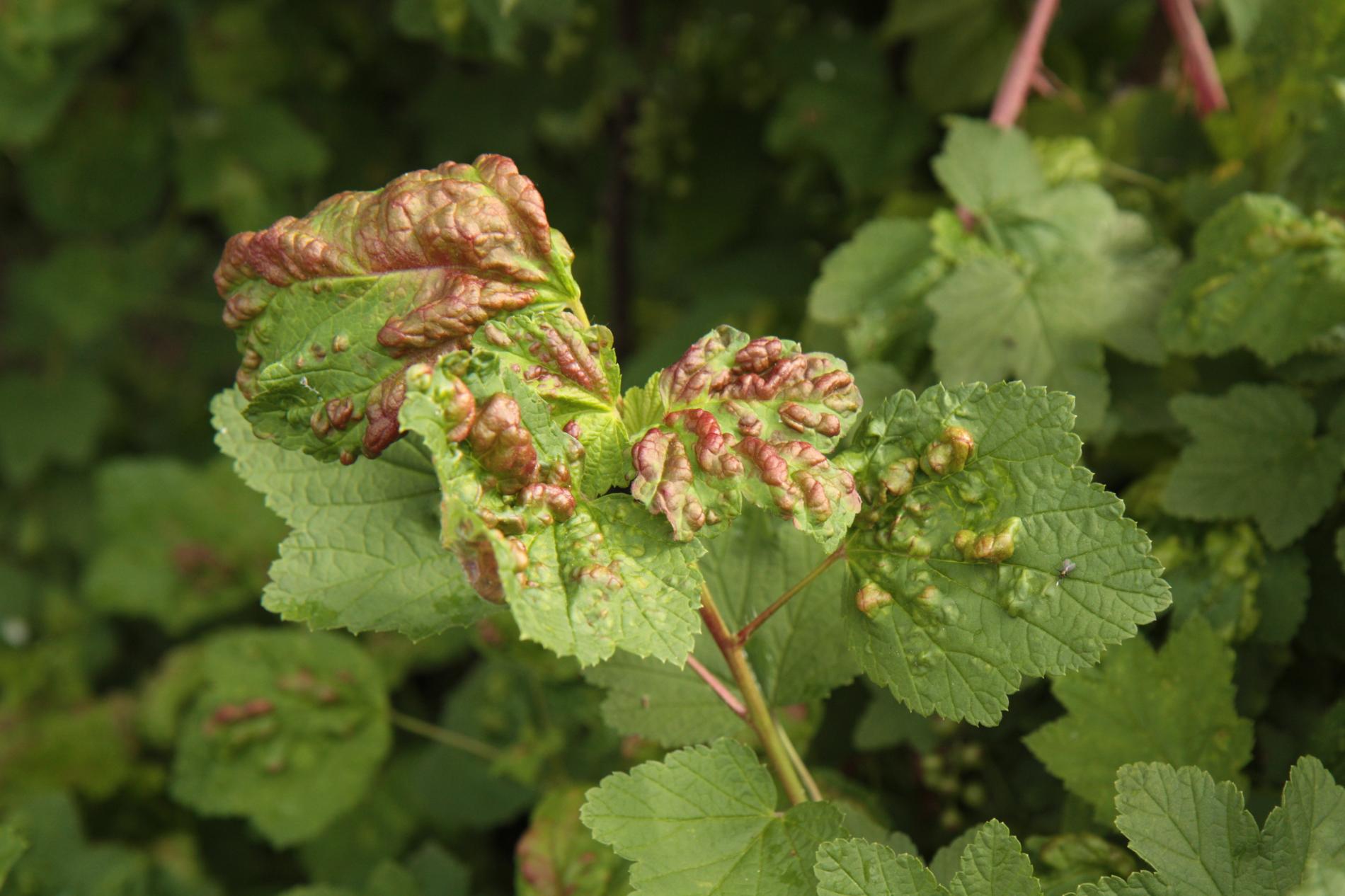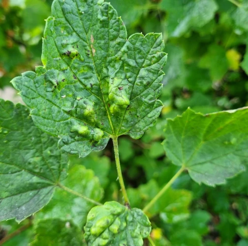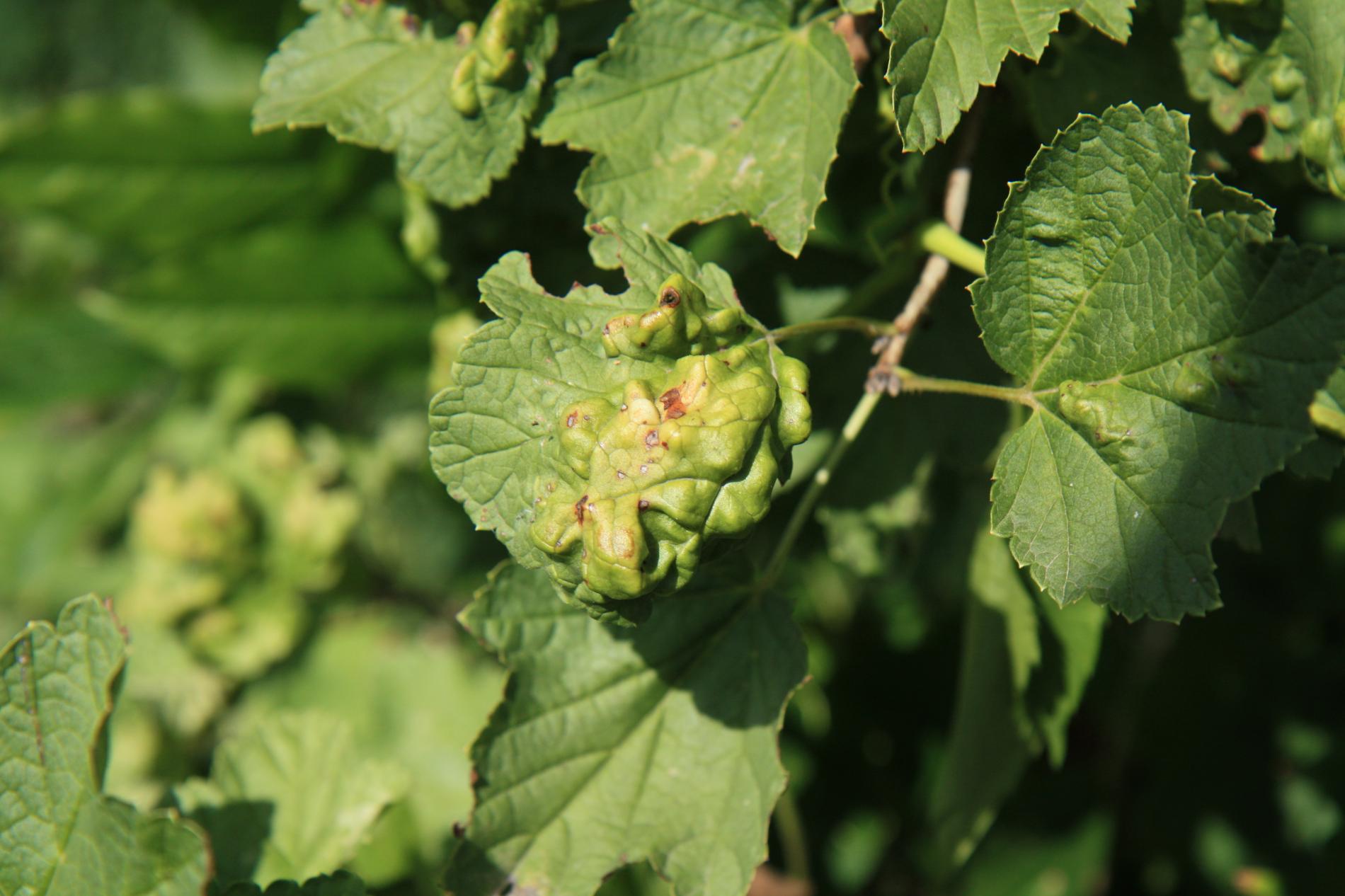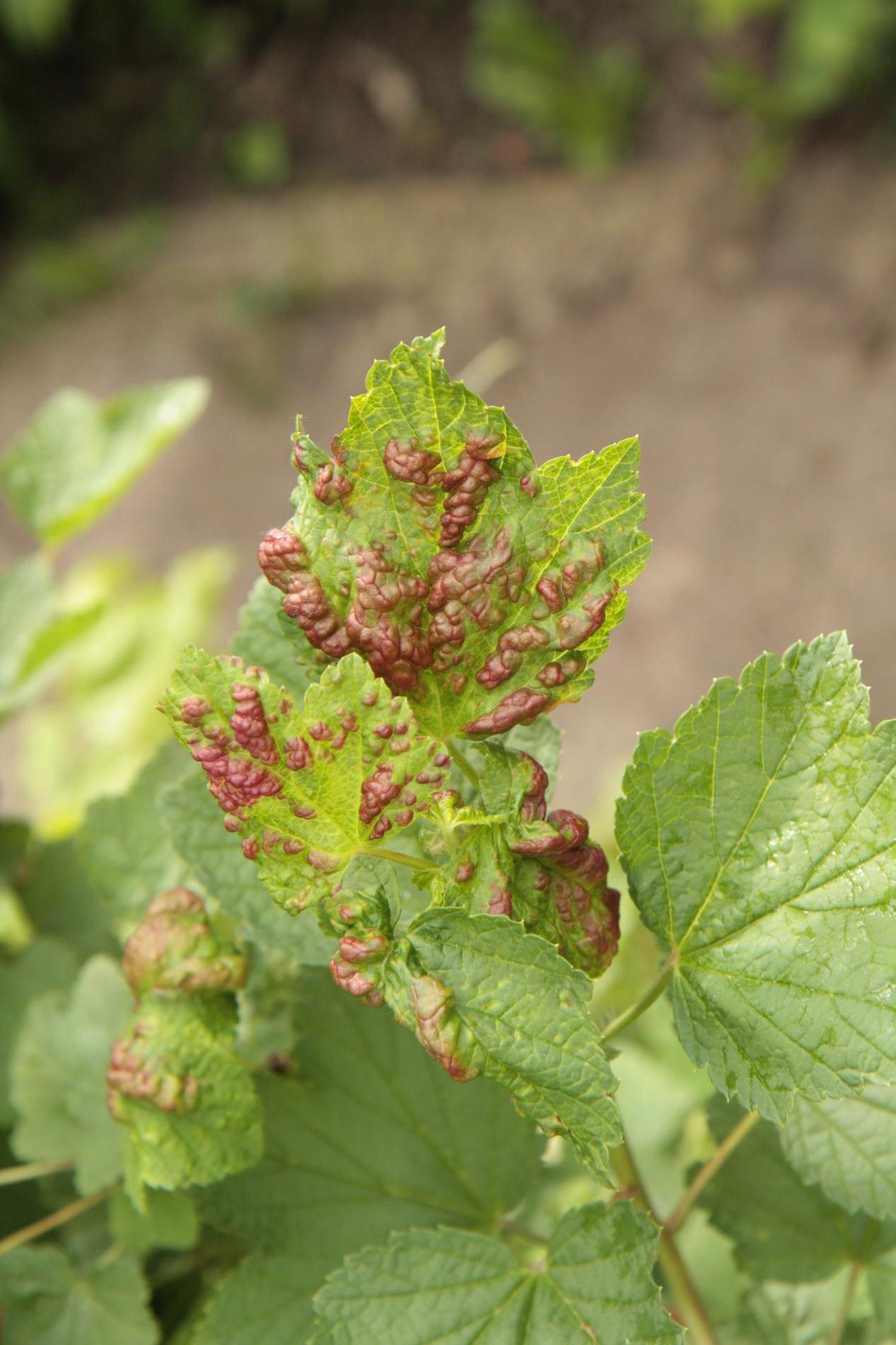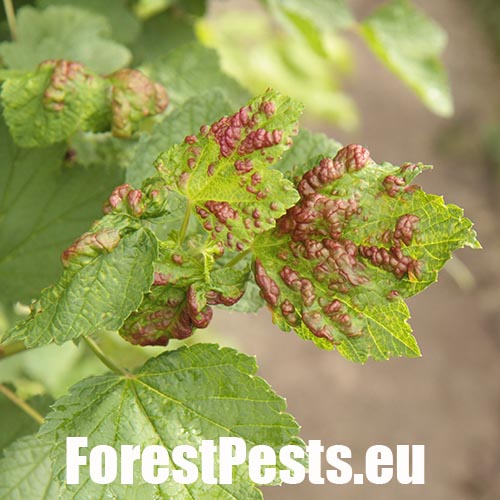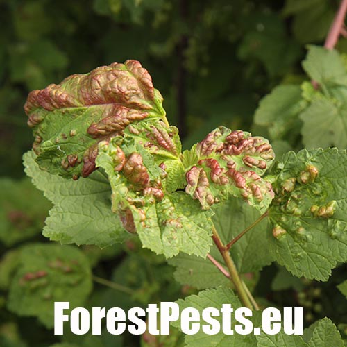 There are blisters or pseudo-galls formed on the infested leaves. The leaves take on very characteristic coloration. On black currant, the blisters are yellowish green, on red currant and white currant wine-red. The adults are 1.0-2.0 mm long, elongated, pale yellow to bright orange in colour. The females lay eggs during the autumn on the shoots of currant. The eggs overwinter. They hatch in the spring and aphid colonies then become established on the underside of the leaves. During the summer some individuals migrate to the secondary hosts (Lamium spp., Stachys spp.). The red currant cultivars are preferred.