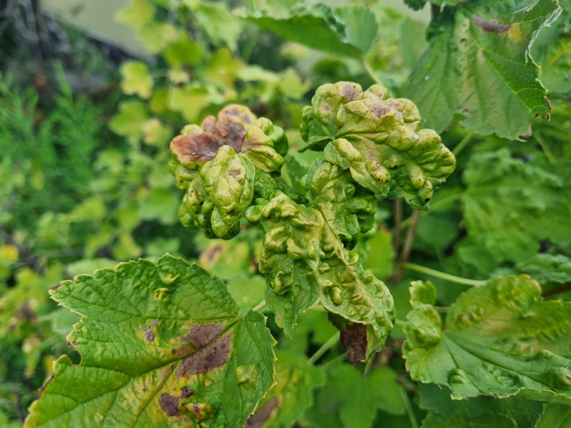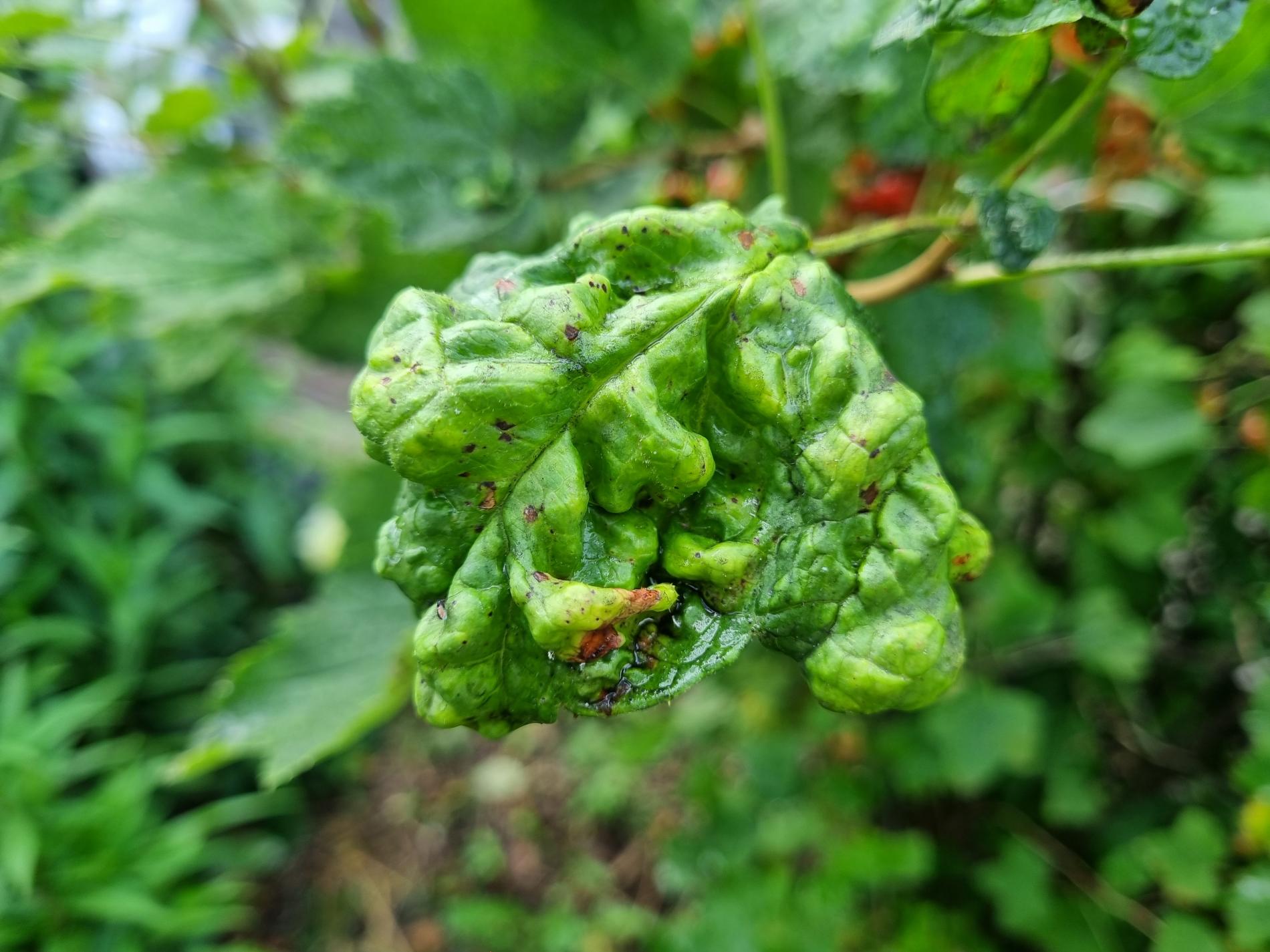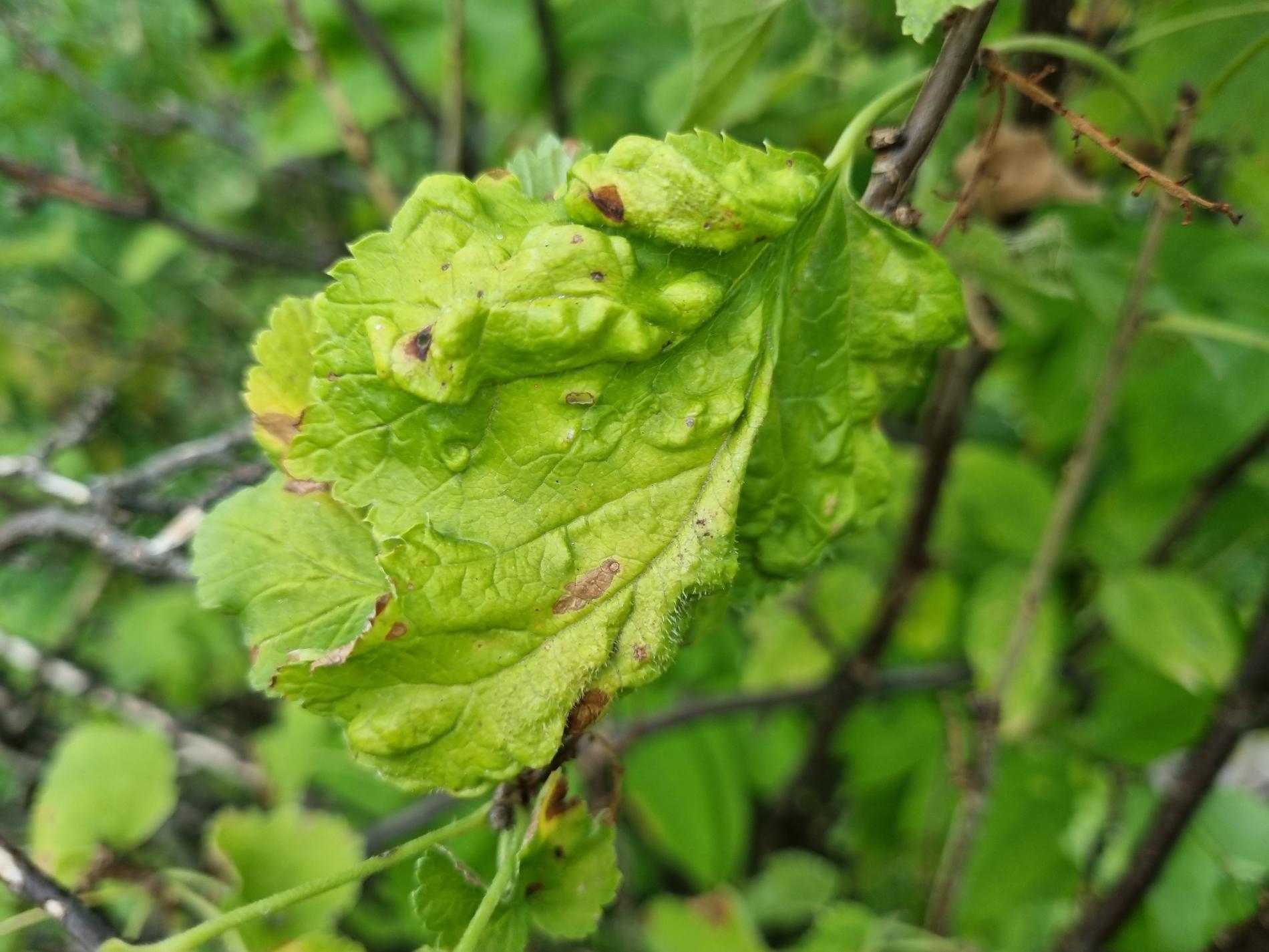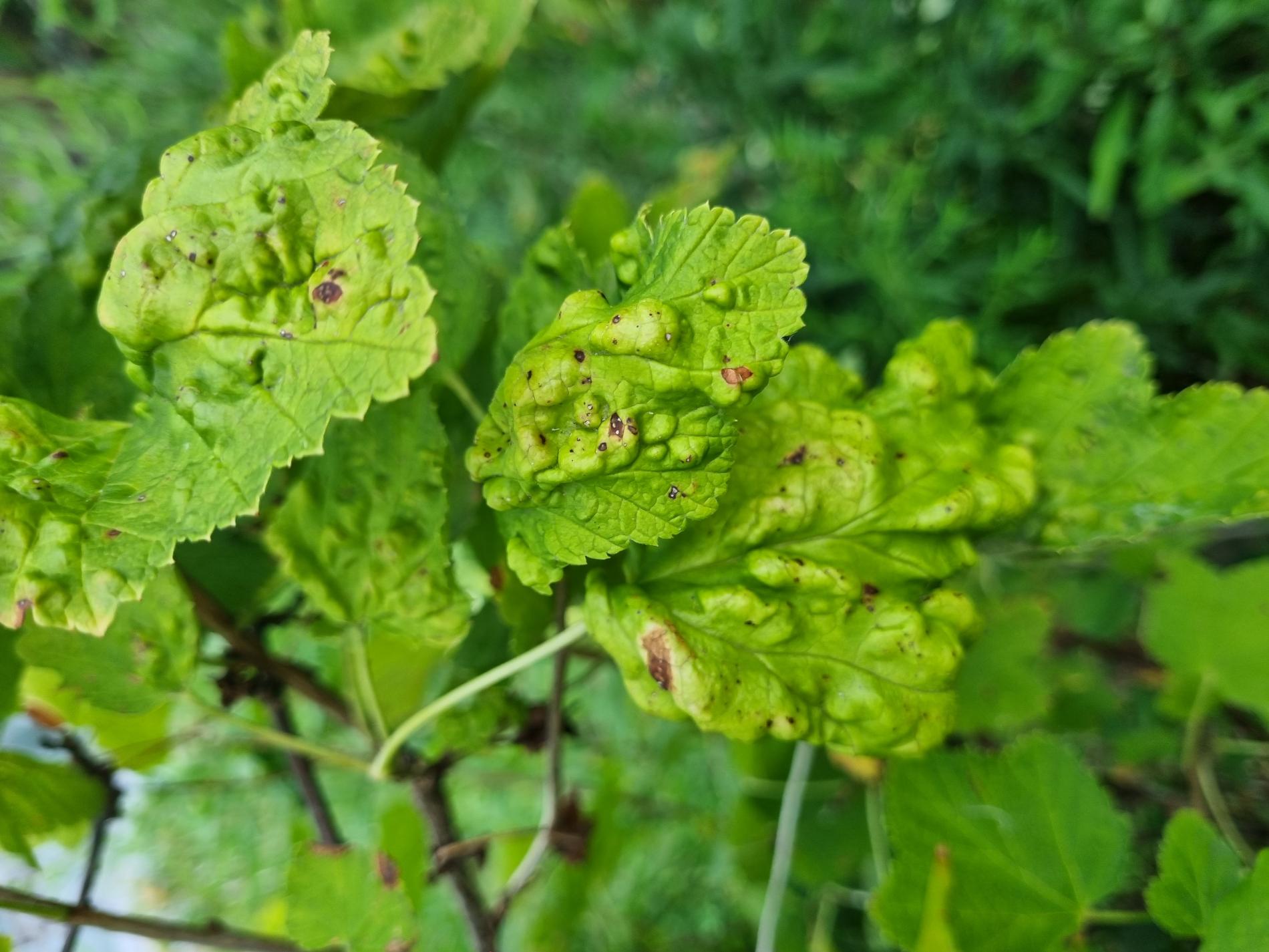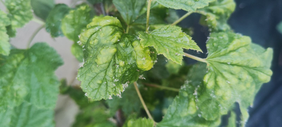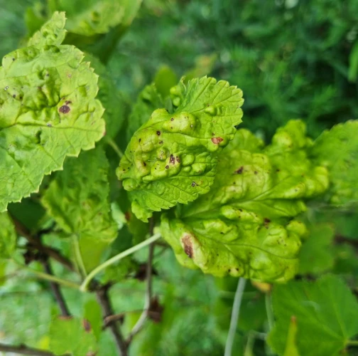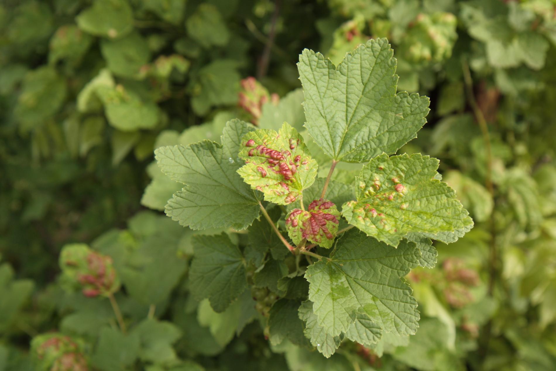 There are blisters or pseudo-galls formed on the infested leaves. The leaves take on very characteristic coloration. On black currant, the blisters are yellowish green, on red currant and white currant wine-red. The adults are 1.0-2.0 mm long, elongated, pale yellow to bright orange in colour. The females lay eggs during the autumn on the shoots of currant. The eggs overwinter. They hatch in the spring and aphid colonies then become established on the underside of the leaves. During the summer some individuals migrate to the secondary hosts (Lamium spp., Stachys spp.). The red currant cultivars are preferred.