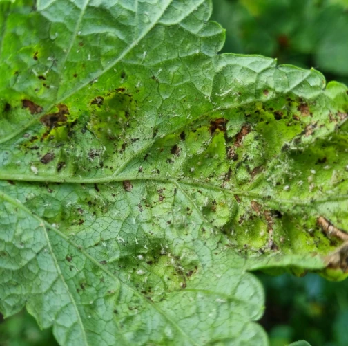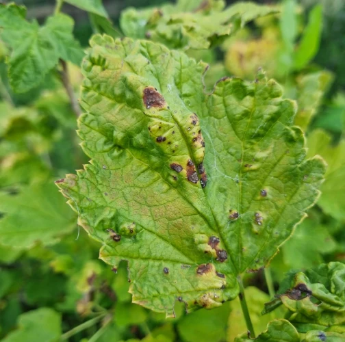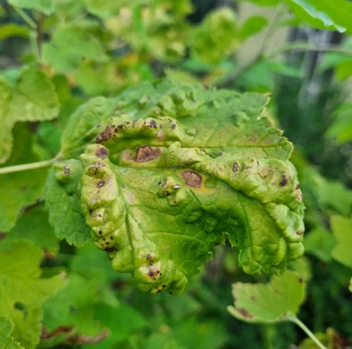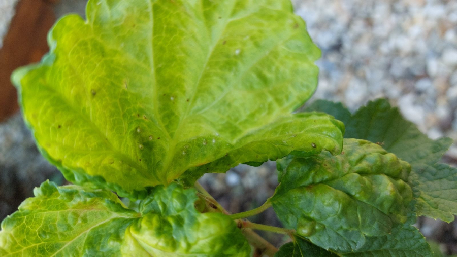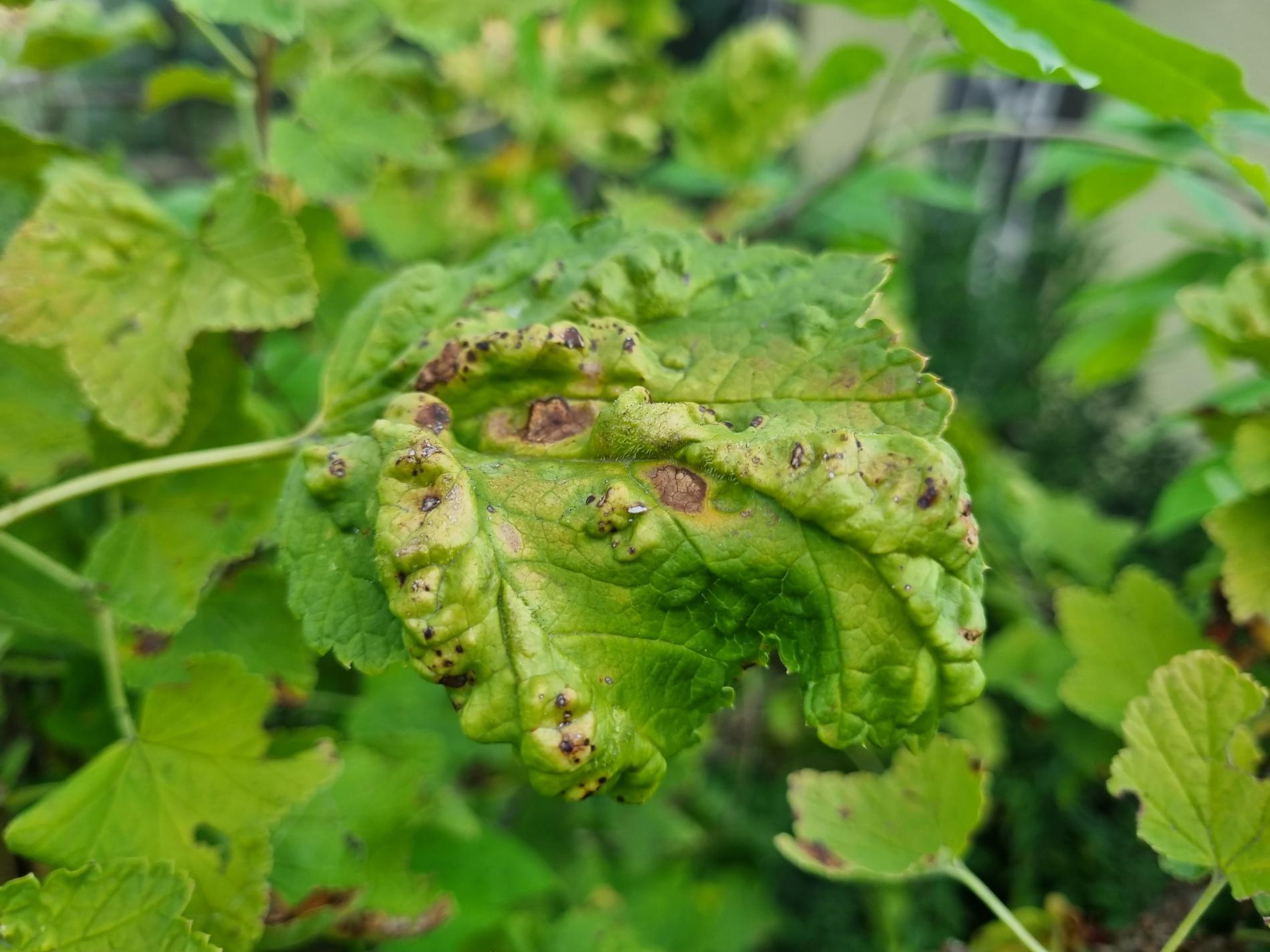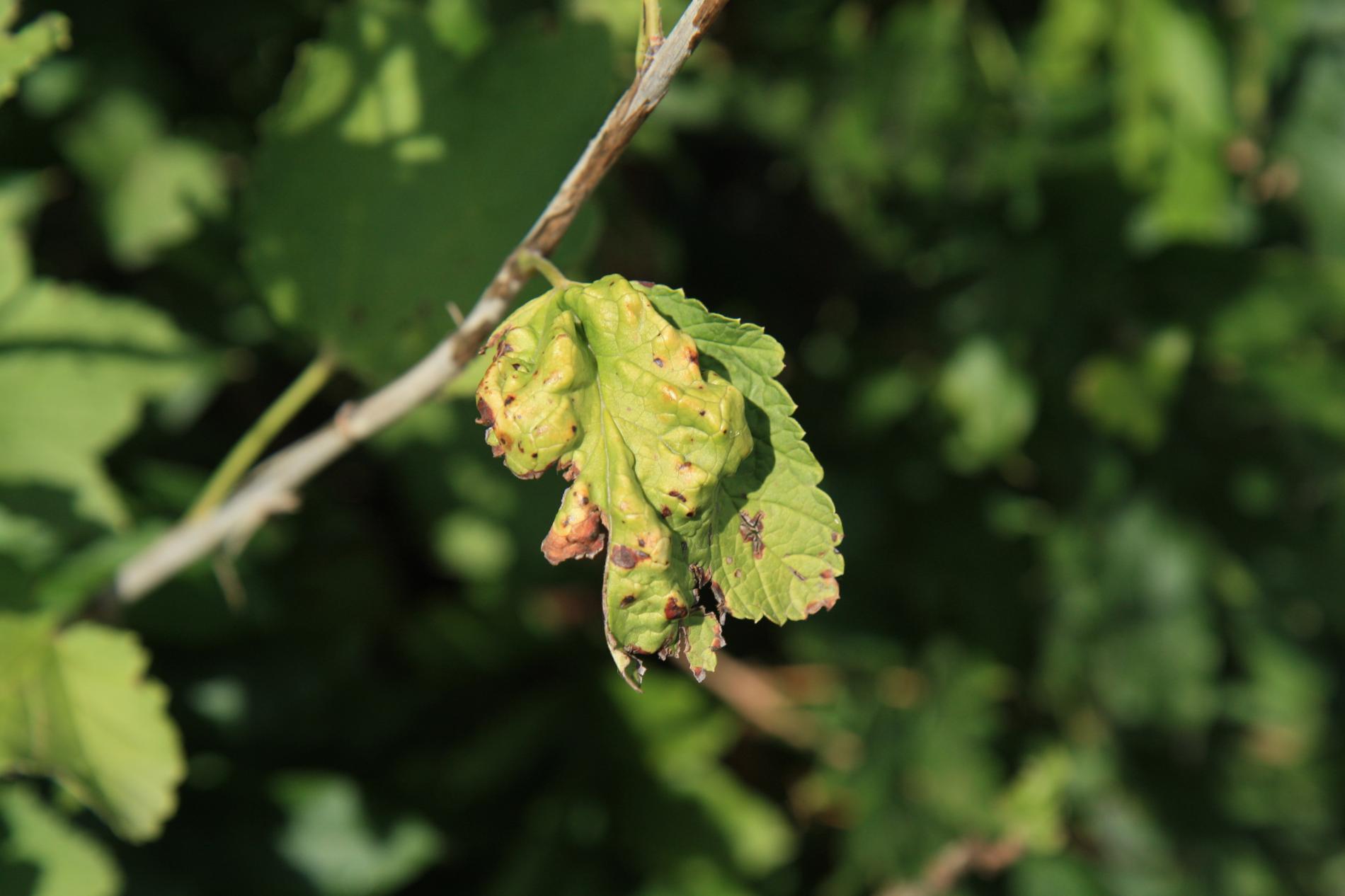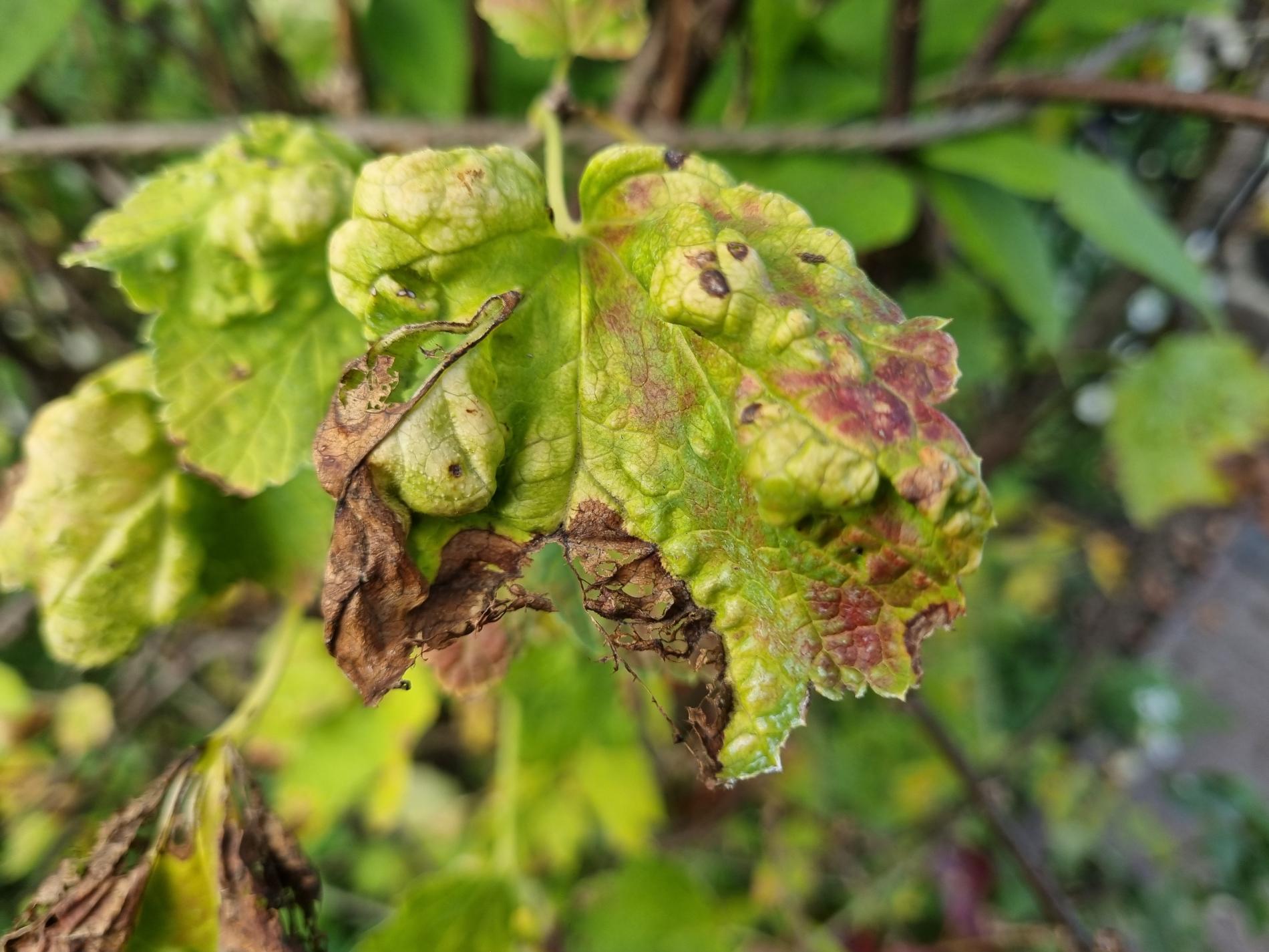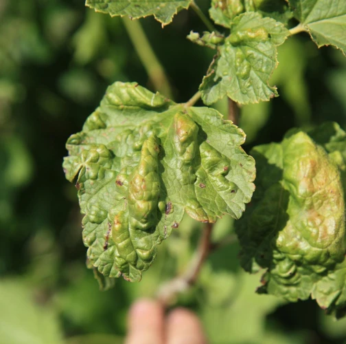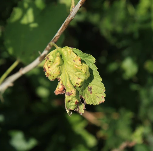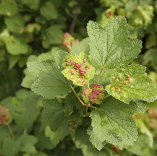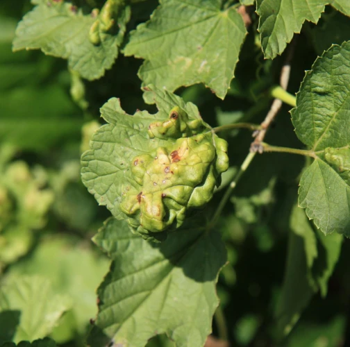 There are blisters or pseudo-galls formed on the infested leaves. The leaves take on very characteristic coloration. On black currant, the blisters are yellowish green, on red currant and white currant wine-red. The adults are 1.0-2.0 mm long, elongated, pale yellow to bright orange in colour. The females lay eggs during the autumn on the shoots of currant. The eggs overwinter. They hatch in the spring and aphid colonies then become established on the underside of the leaves. During the summer some individuals migrate to the secondary hosts (Lamium spp., Stachys spp.). The red currant cultivars are preferred.