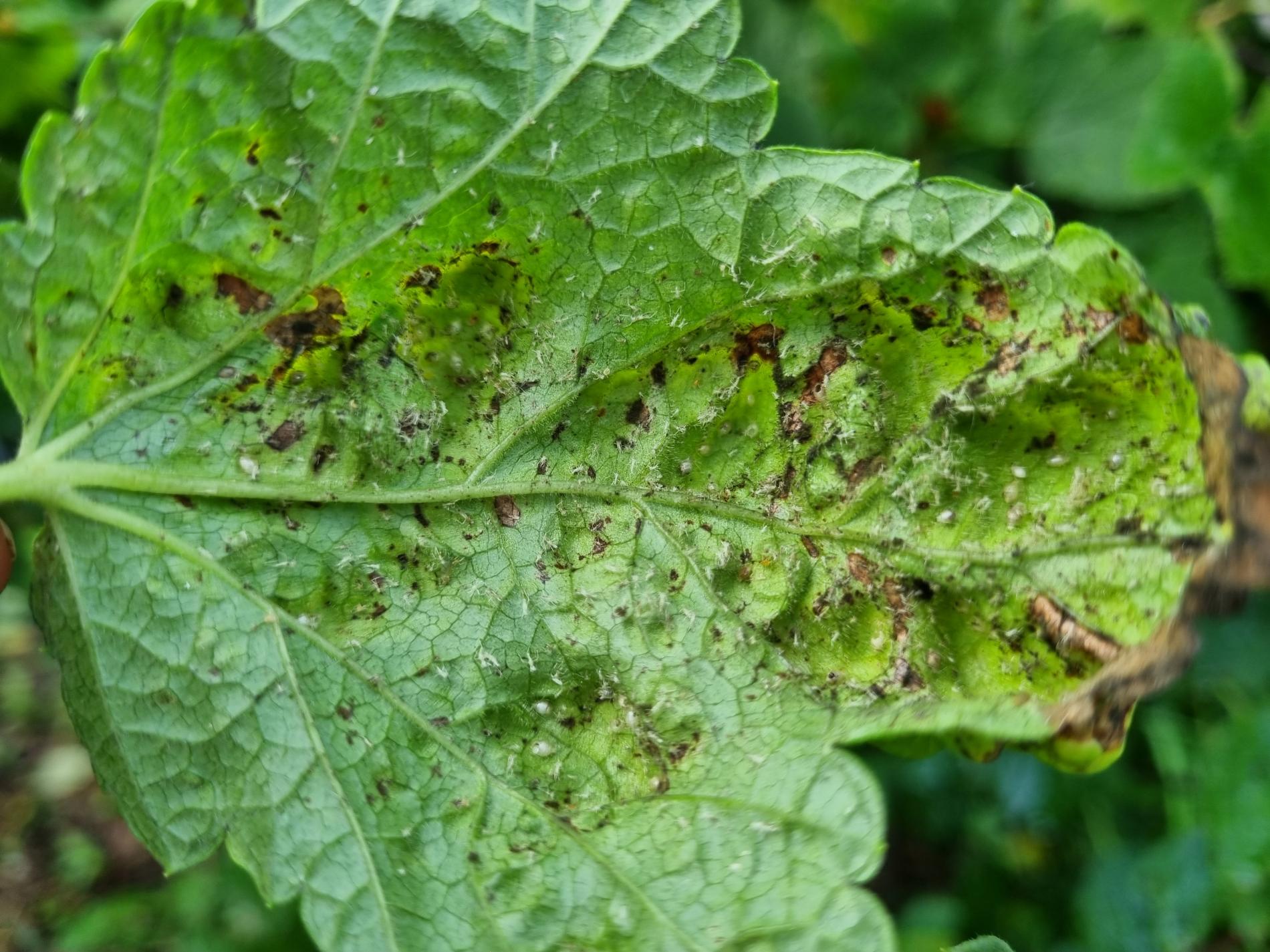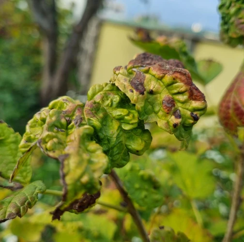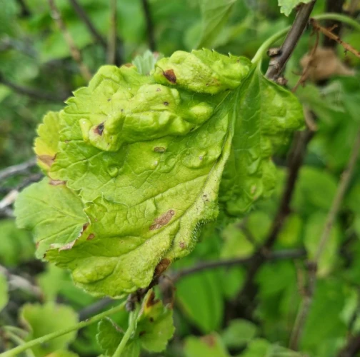 The leaves are swollen and turn a light ocher to red. Aphids live on the underside of the leaves.