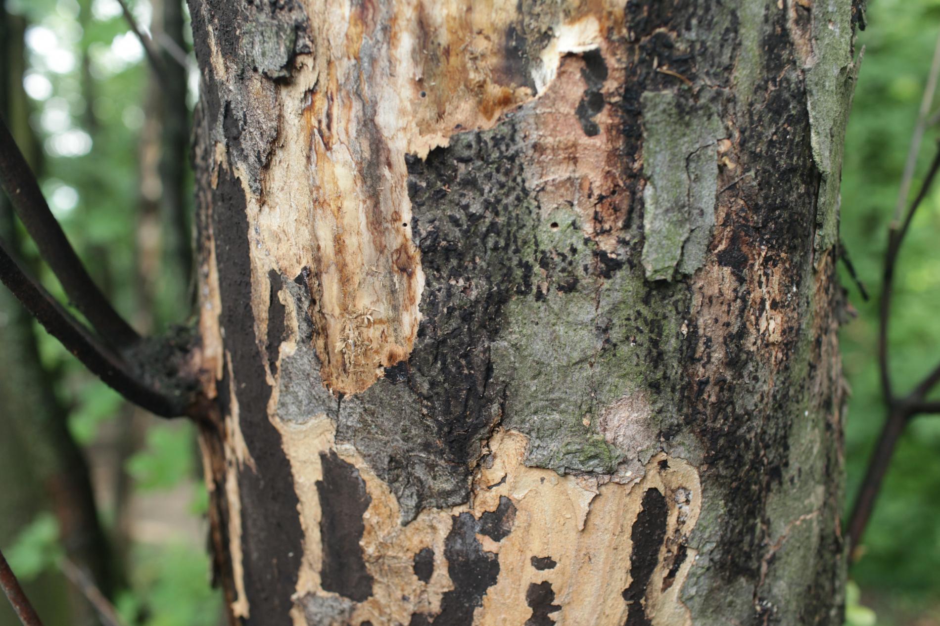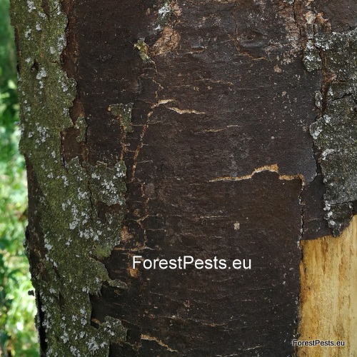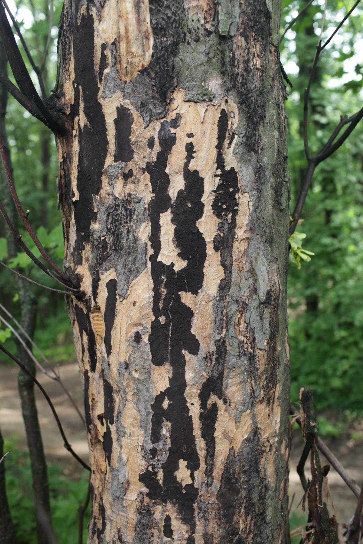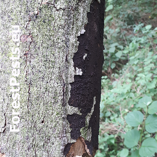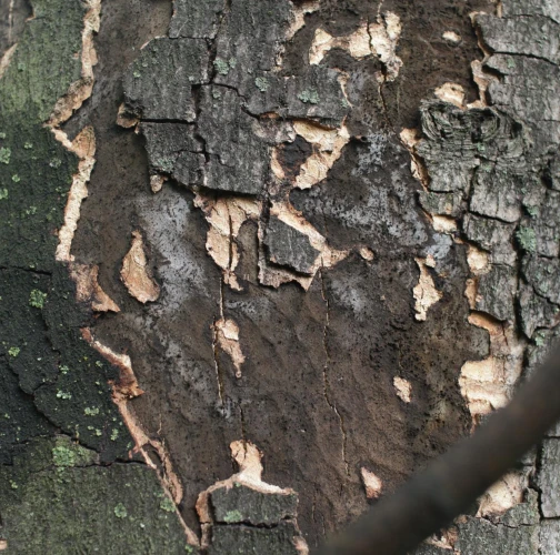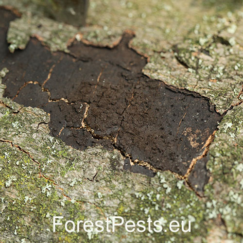 Creates dark coatings on the trunks. These are formed by the sexual stage of the fungus – the fruiting bodies that produce spores. Cryptostroma corticale is harmful to trunks and branches. It causes tree diseases especially after dry summer periods. The fungus attacks the wooden part of the trunk (xylem) and penetrates back to the surface of the trunk to the cambium and bark. Black plates form under the bark. The mushroom attacks the mountain maple, less linden and chestnut. The occurrence of the disease usually leads to the death of the trees quite quickly.