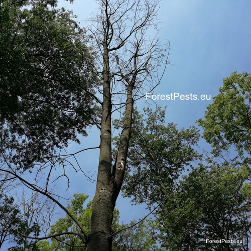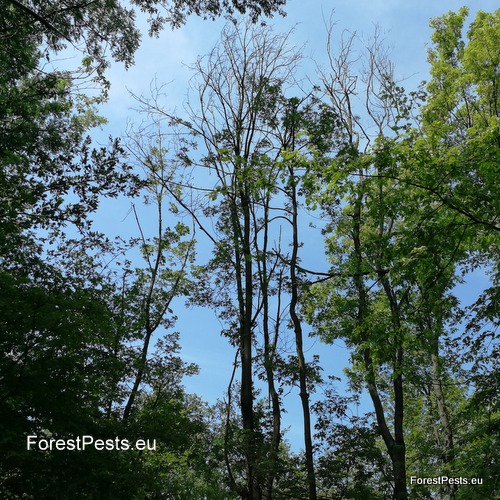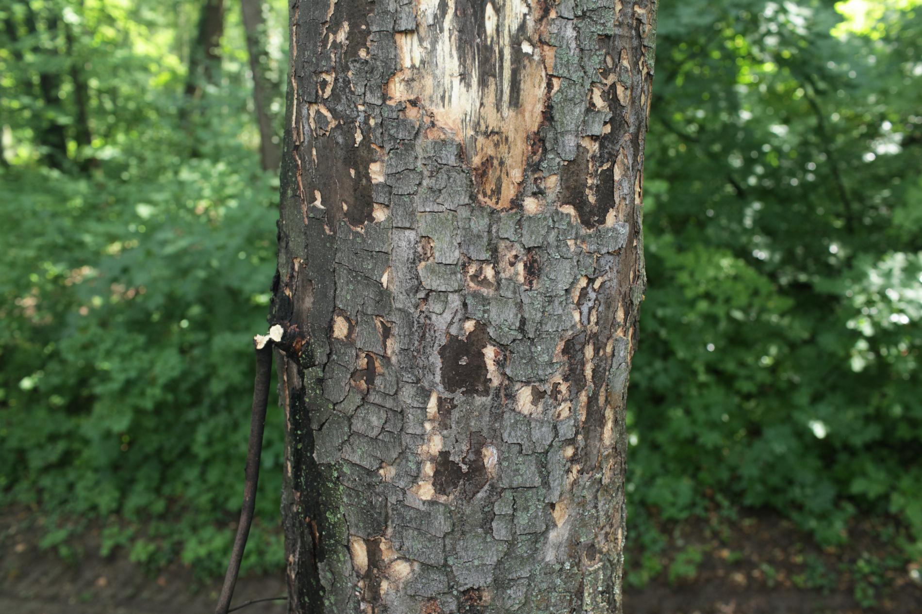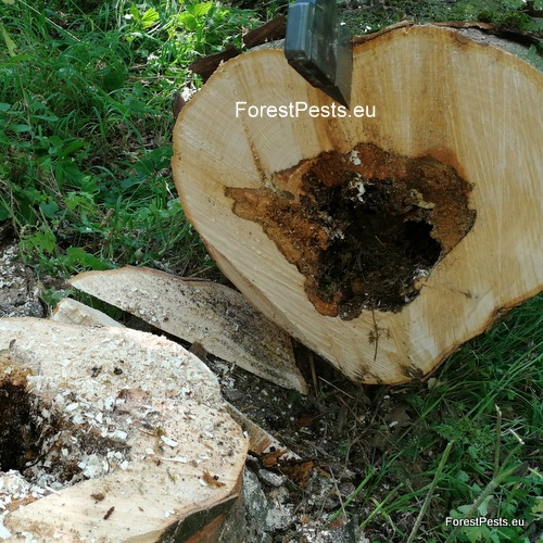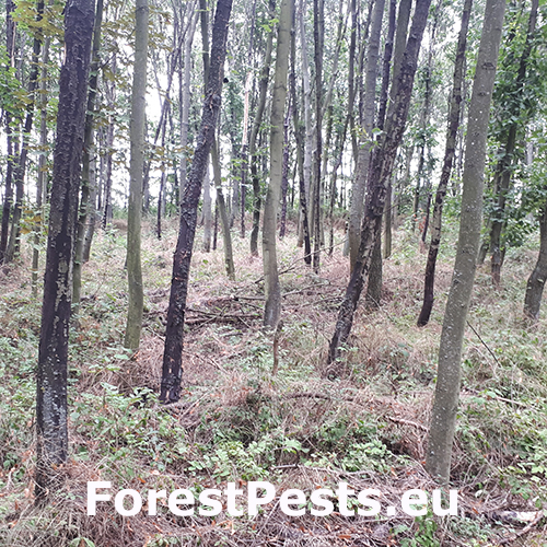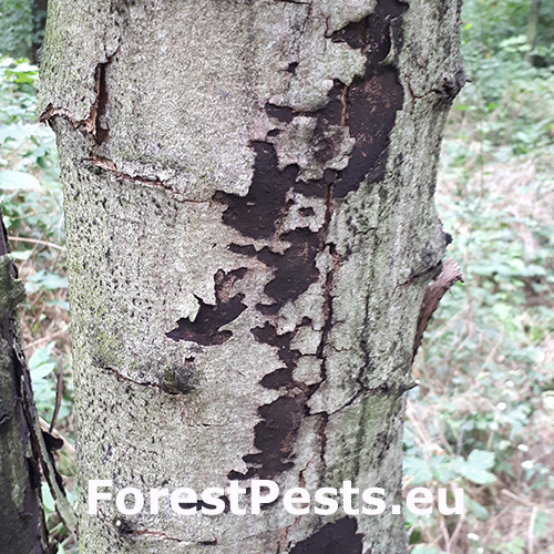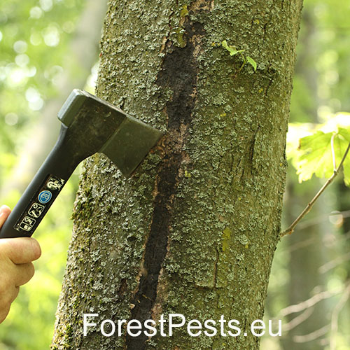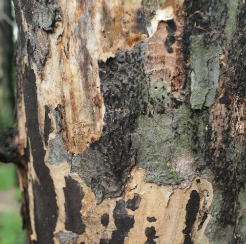 Creates dark coatings on the trunks. These are formed by the sexual stage of the fungus – the fruiting bodies that produce spores. Cryptostroma corticale is harmful to trunks and branches. It causes tree diseases especially after dry summer periods. The fungus attacks the wooden part of the trunk (xylem) and penetrates back to the surface of the trunk to the cambium and bark. Black plates form under the bark. The mushroom attacks the mountain maple, less linden and chestnut. The occurrence of the disease usually leads to the death of the trees quite quickly.
