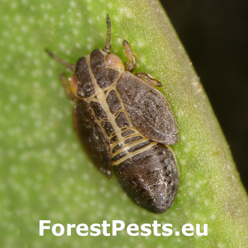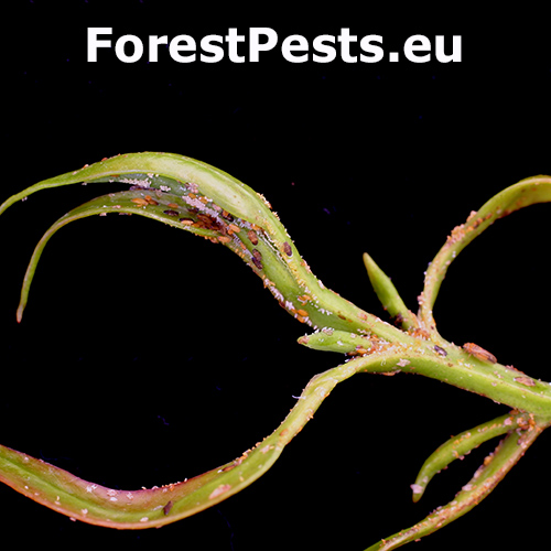 Ctenarytaina spatulata, commonly known as the rose gum psyllid, is a sap-sucking insect native to Australia that primarily infests eucalyptus species, especially Eucalyptus globulus and Eucalyptus camaldulensis. Since its introduction to other regions, it has been reported in parts of Europe, including Portugal. Both nymphs and adults feed on the sap of mature shoots, particularly in the apical parts of the tree, leading to small necrotic lesions, proliferation of lateral shoots, and leaf distortions. Infestations can result in significant aesthetic damage and reduced vigor of ornamental eucalyptus trees. Additionally, the psyllids excrete large amounts of honeydew, which promotes the growth of sooty molds, further diminishing the tree's appearance.