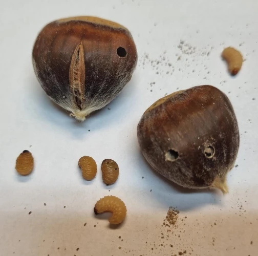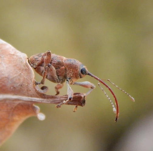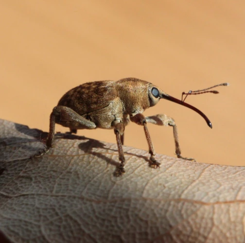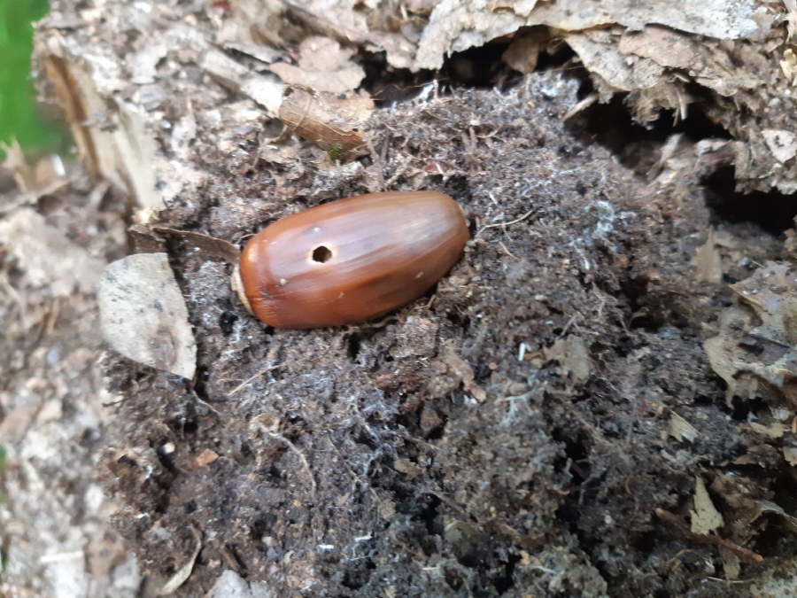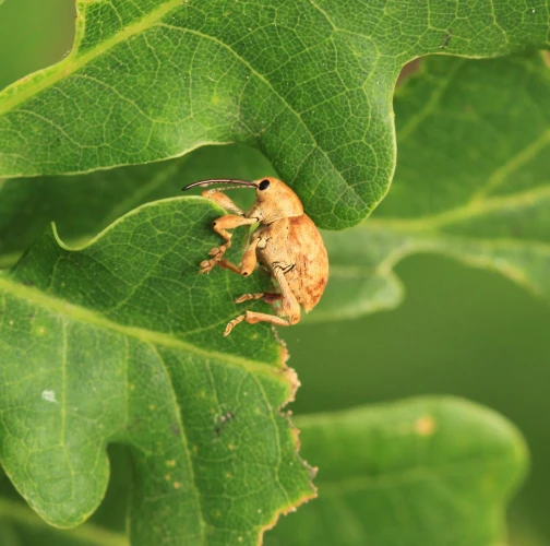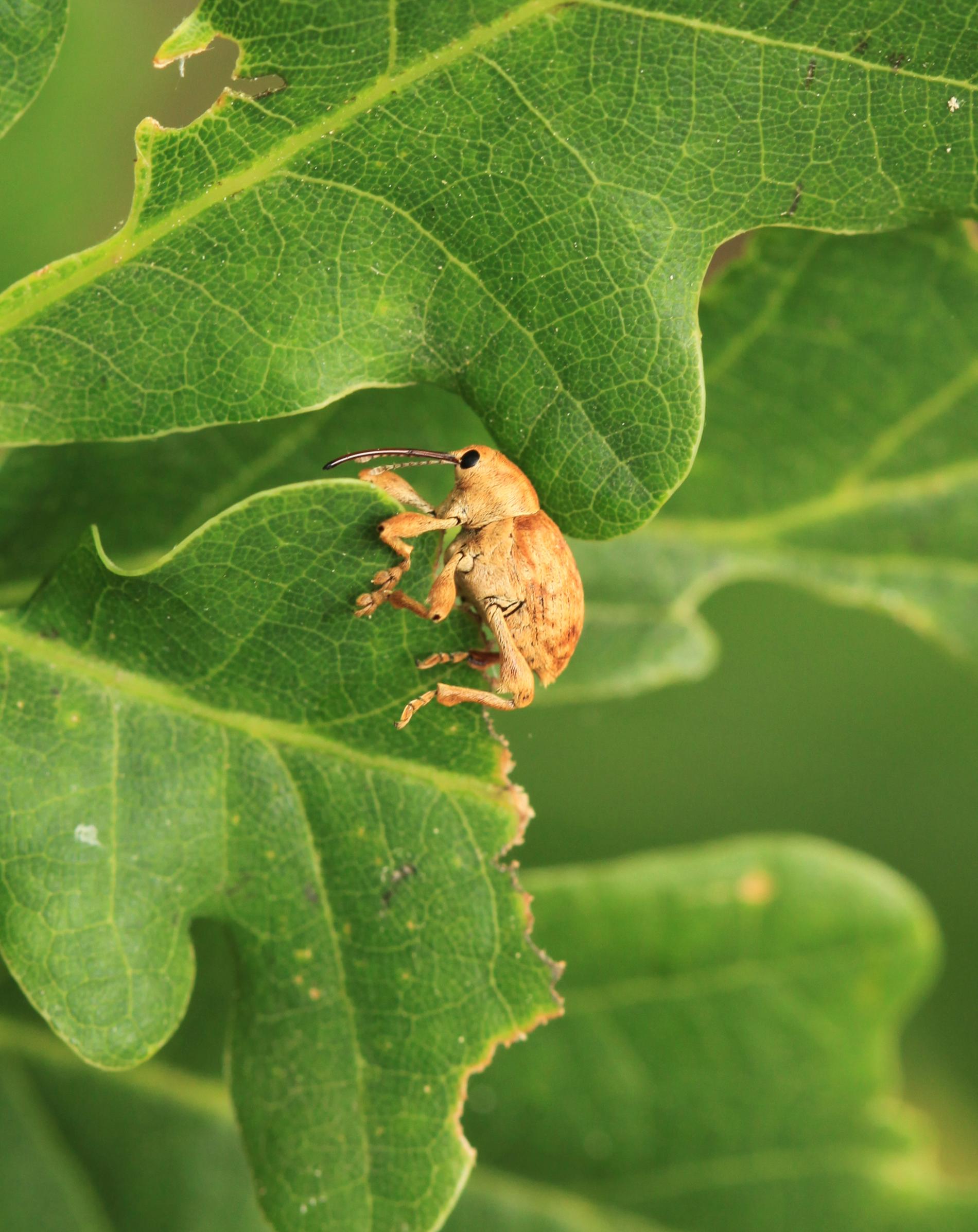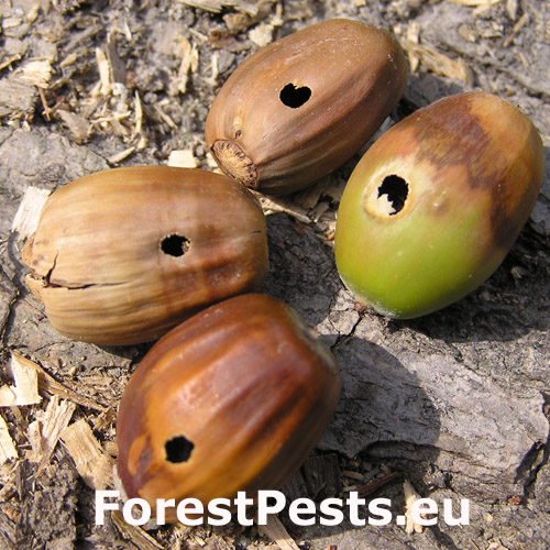 Adults are about 4-8 mm long excluding the nose. The body is oval-shaped, covered with yellowish-brown scales. The front part of the head is lengthened in a nose which is longer than the body. Females lay their eggs in developing acorns in May. Damages are caused by the larva. Until autumn it lives inside of the acorn, later on it leaves the acorn trought an exit hole and overwinters in forest litter. In spring it pupates. The content of acorns is damaged and and filled in with black droppings. The acorns are usually attacked by accompanying fungi.