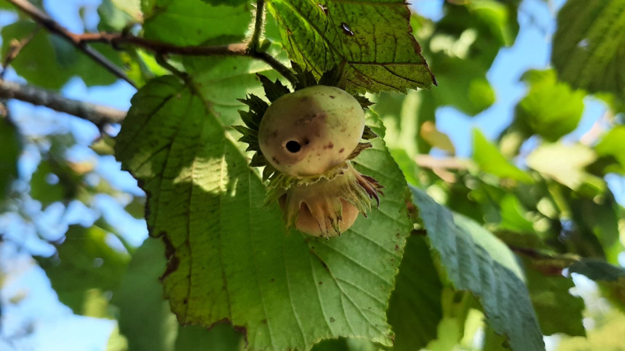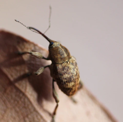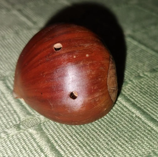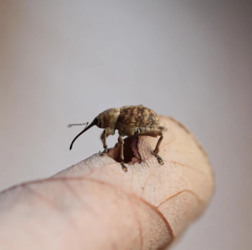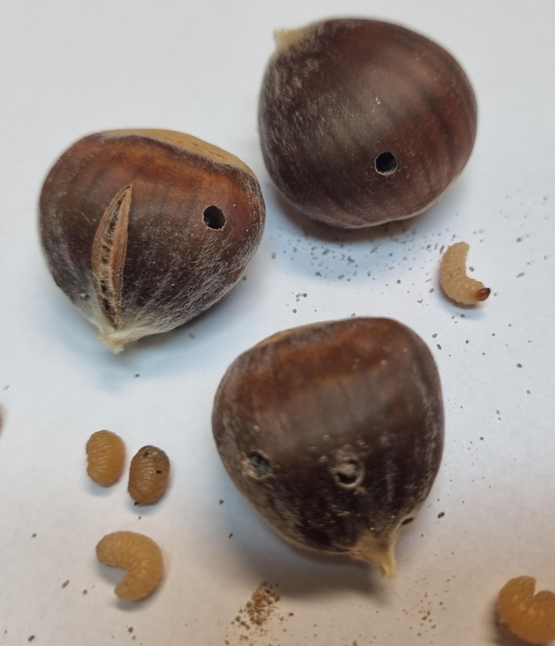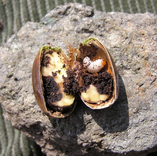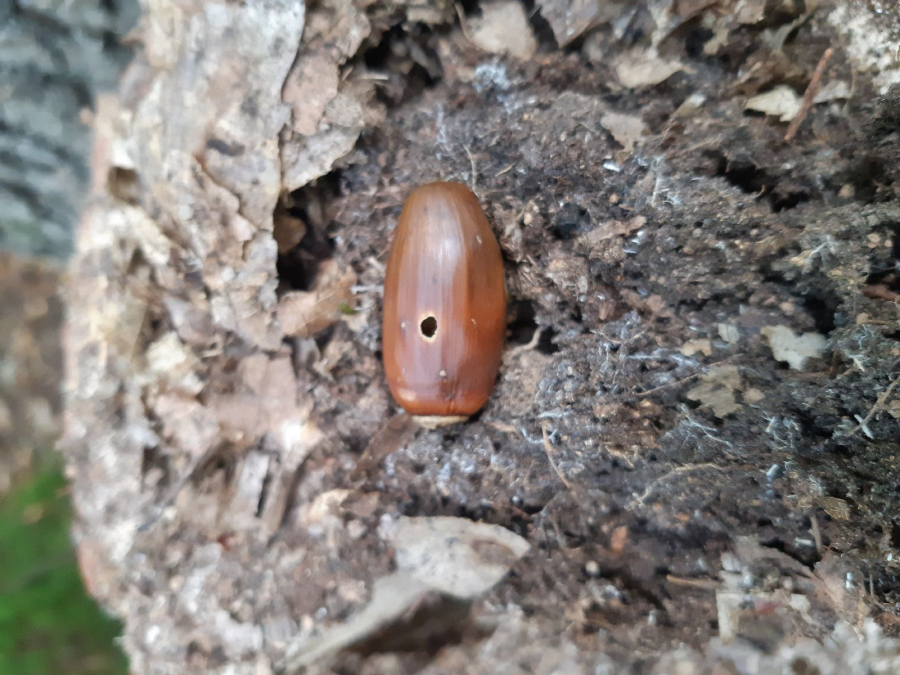 Adults are about 4-8 mm long excluding the nose. The body is oval-shaped, covered with yellowish-brown scales. The front part of the head is lengthened in a nose which is longer than the body. Females lay their eggs in developing acorns in May. Damages are caused by the larva. Until autumn it lives inside of the acorn, later on it leaves the acorn trought an exit hole and overwinters in forest litter. In spring it pupates. The content of acorns is damaged and and filled in with black droppings. The acorns are usually attacked by accompanying fungi.