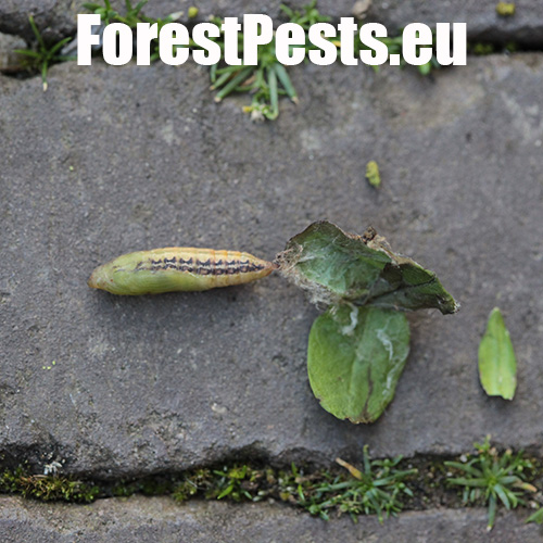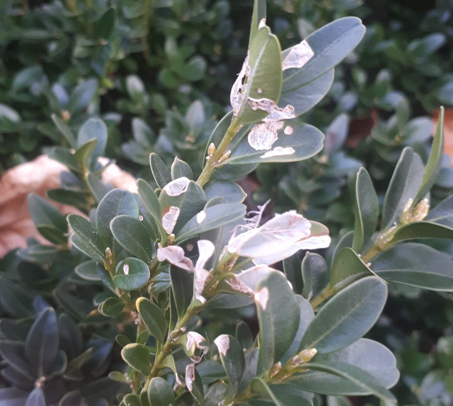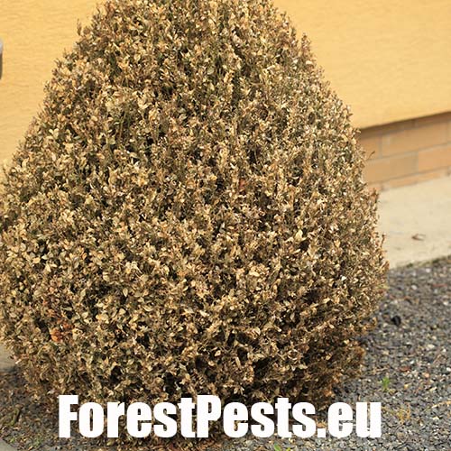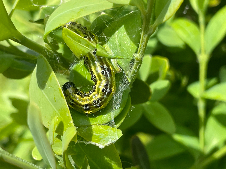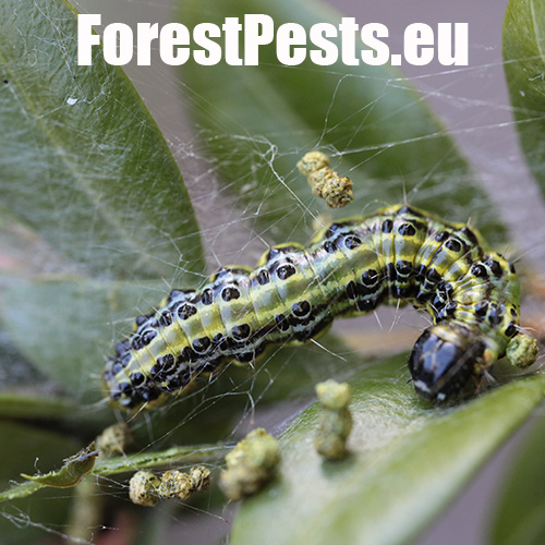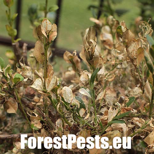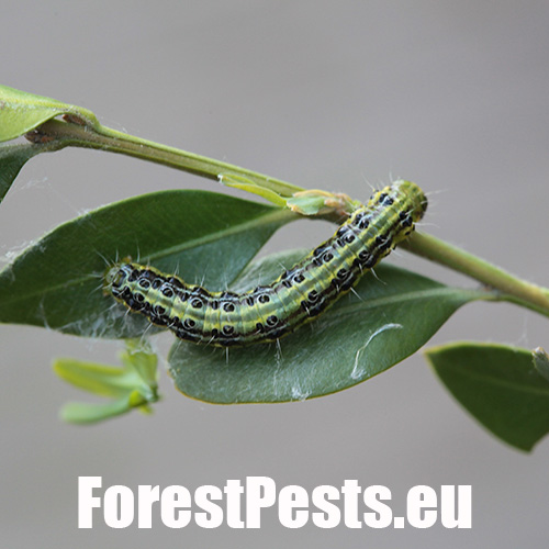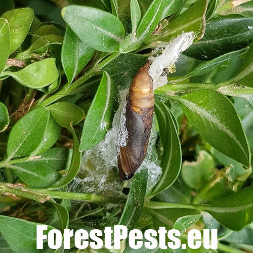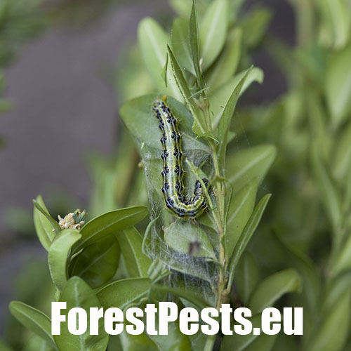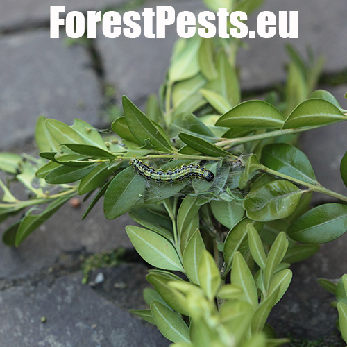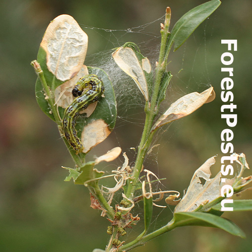 This moth was first reported in Europe in 2007 and now is spreading in several directions. It was probably introduced from East Asia. It overwinters as young larvae in webs between leaves or in crevices nearby. The adults are shiny white. The characteristic larvae, up to 5 cm long, feed on boxwood leaves and even on the green bark of shoots. They cover the plant with silk webs, and cause significant defoliation. The pupa is hidden in a case consisting of several leaves spun together. The first flight is in spring is in April/ May. 2–3 generations may follow. Attacked plants turn beige because the pitted leaves shrivel. If the attack is light, the plant recovers by sprouting new leaves. With high infestations, the larvae can defoliate almost entire plants and thus usually kill them in parks and gardens.