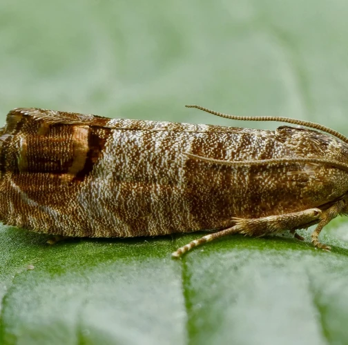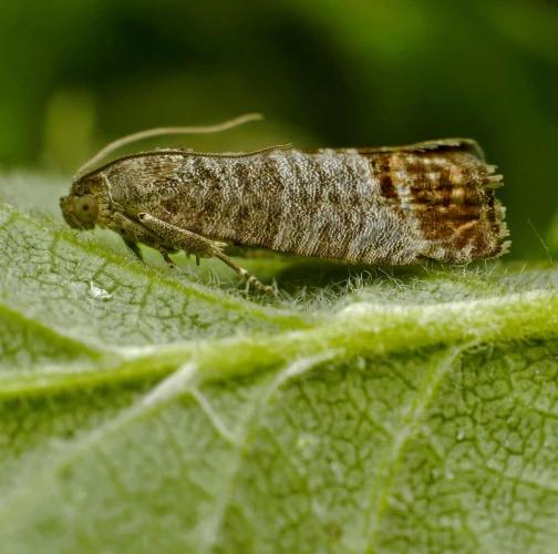 Cydia pomonella, commonly known as the codling moth, is a pest insect that infests apple, pear, and walnut trees. It is found in many parts of the world and is a major pest of apple orchards. The larvae of the codling moth tunnel into the fruit, causing damage and making the fruit unmarketable.The adult codling moth is a grayish-brown moth with distinctive coppery patches on its wings. The moth is active at night and lays its eggs on the fruit or leaves of the tree. The eggs hatch into larvae that feed on the fruit. The larvae eventually emerge from the fruit and pupate in the soil. It can have 2-3 generations in warmer regions, when the he entire third generation overwinter as larvae. Control of the codling moth is important in apple orchards to maintain high-quality fruit production. A variety of methods are used to control the pest, including insecticides, mating disruption, and biological control agents such as parasitic wasps. Integrated pest management practices are often used to reduce the reliance on insecticides and minimize the impact on the environment. Overall, the codling moth is a significant pest of fruit trees and requires careful management to prevent economic losses.