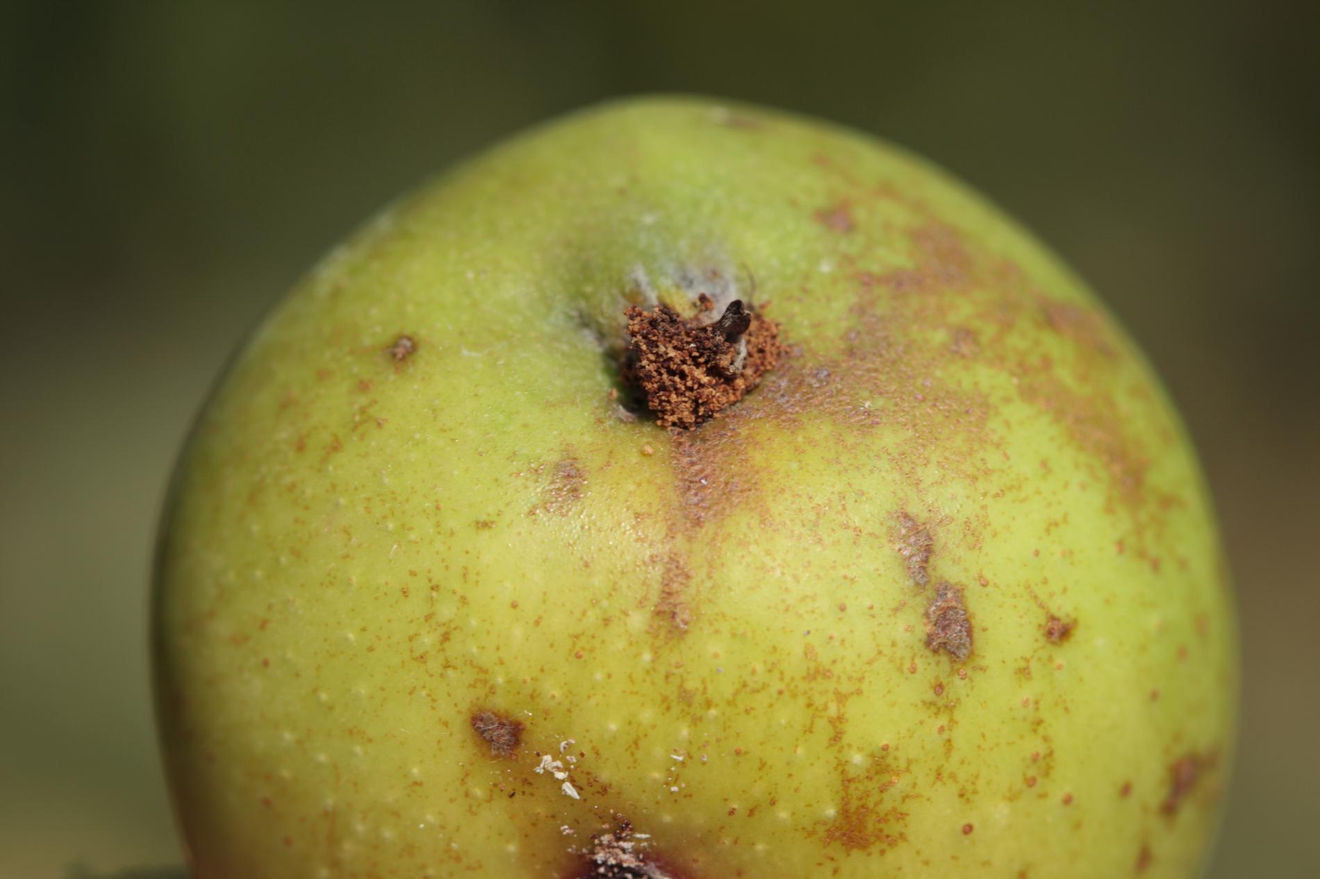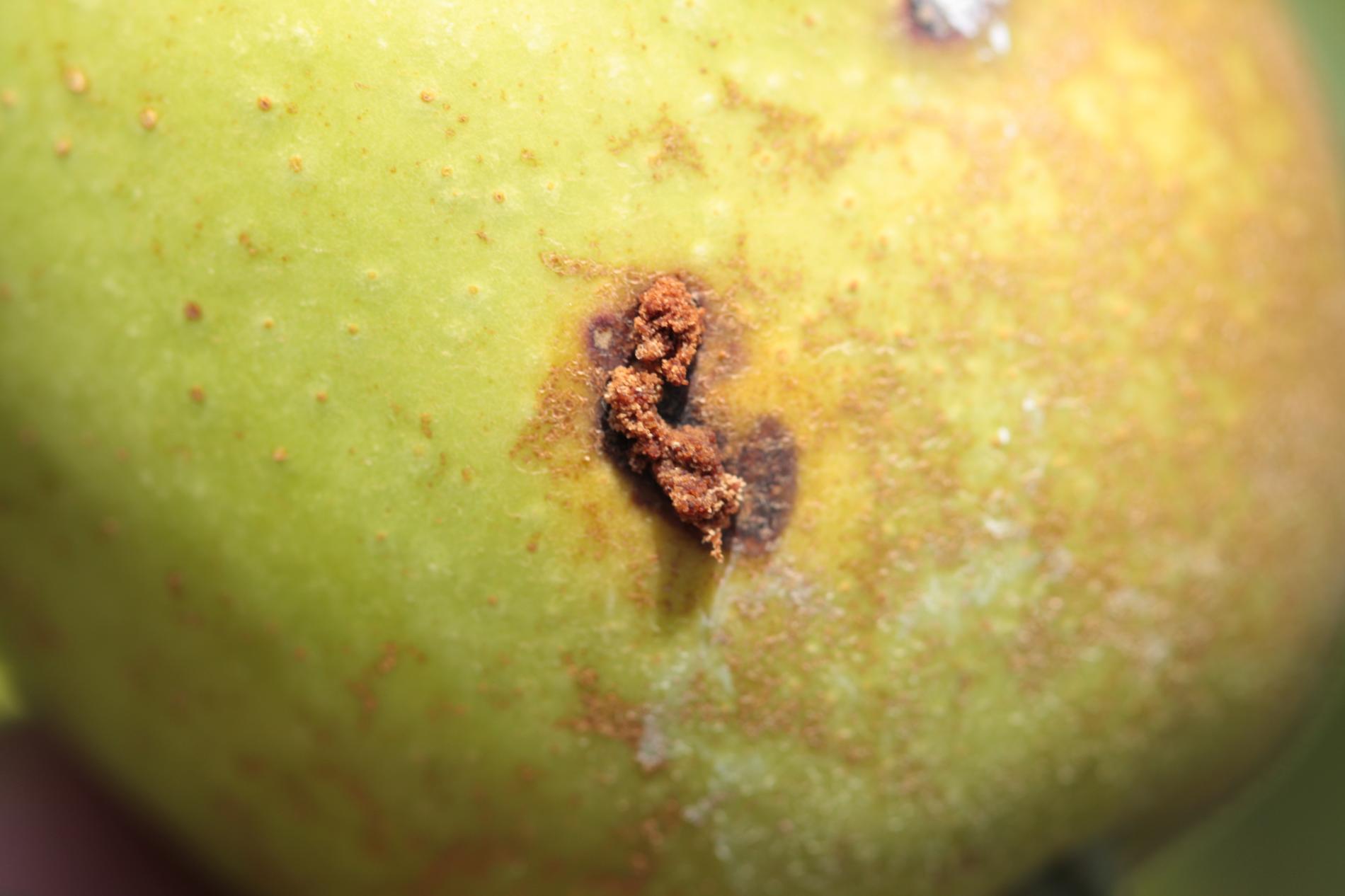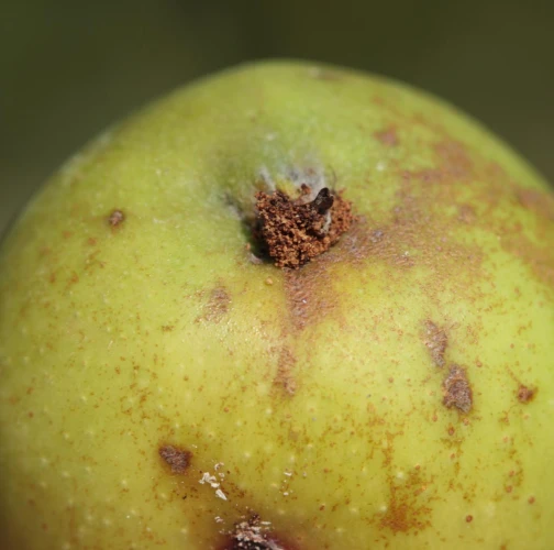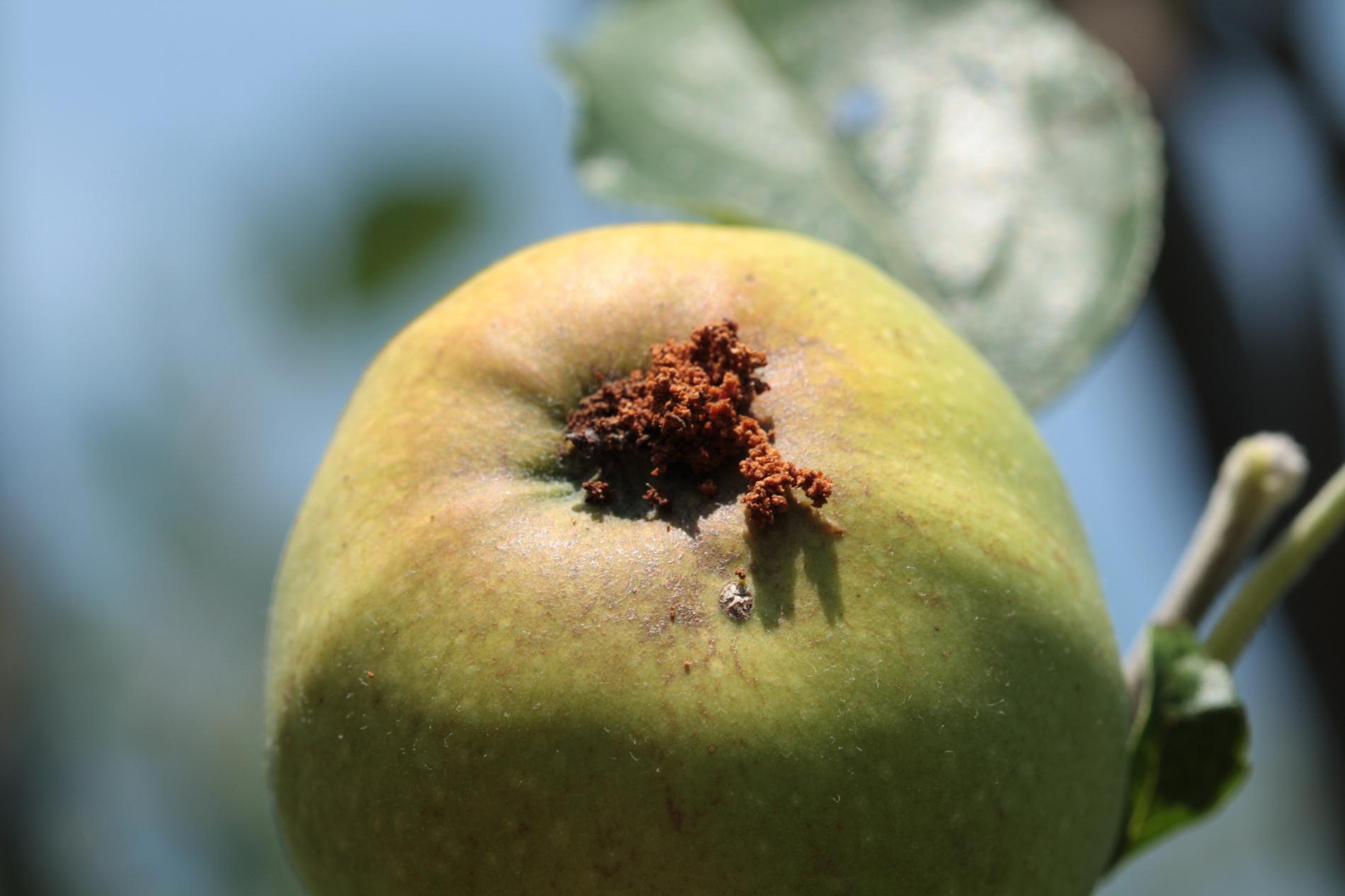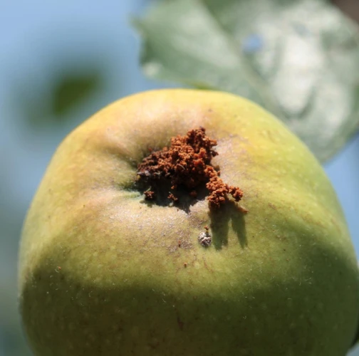 The larvae feed on the seeds and pulp of the apple, causing internal damage that is not visible on the surface. This can lead to the development of rot and mold, making the apple unsuitable for consumption or sale. Masses of frass can be presnet on the surface of the fruit. In addition to the direct damage caused by the larvae feeding on the fruit, the codling moth also creates entry points for other pests and diseases to infect the tree. This can further impact the health and productivity of the apple tree.