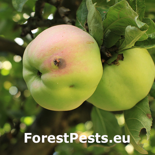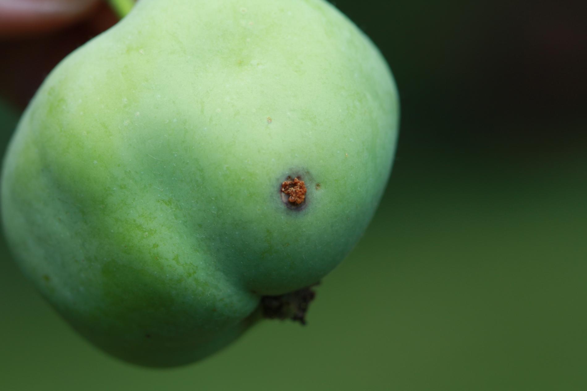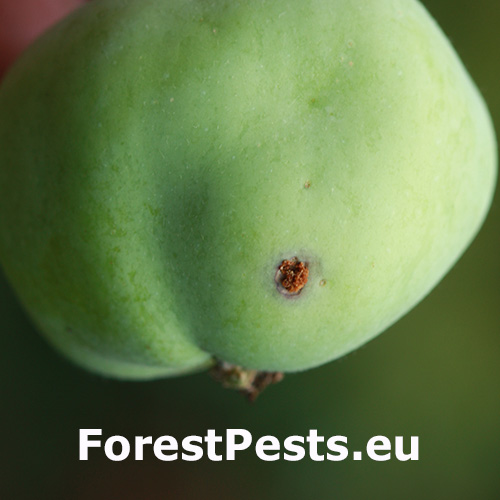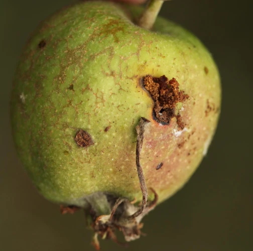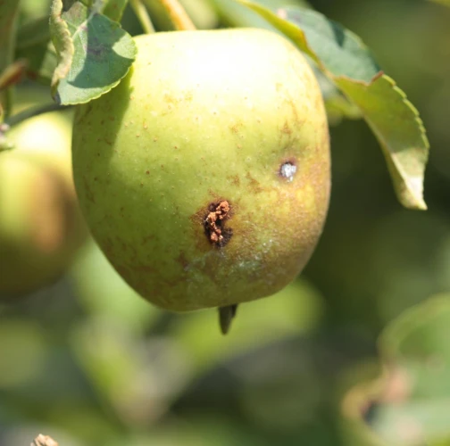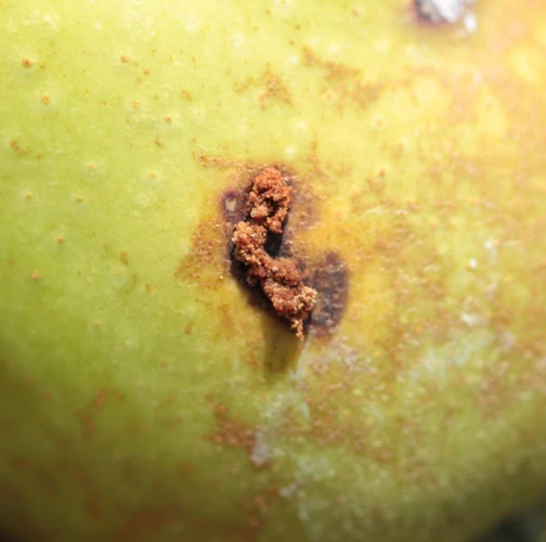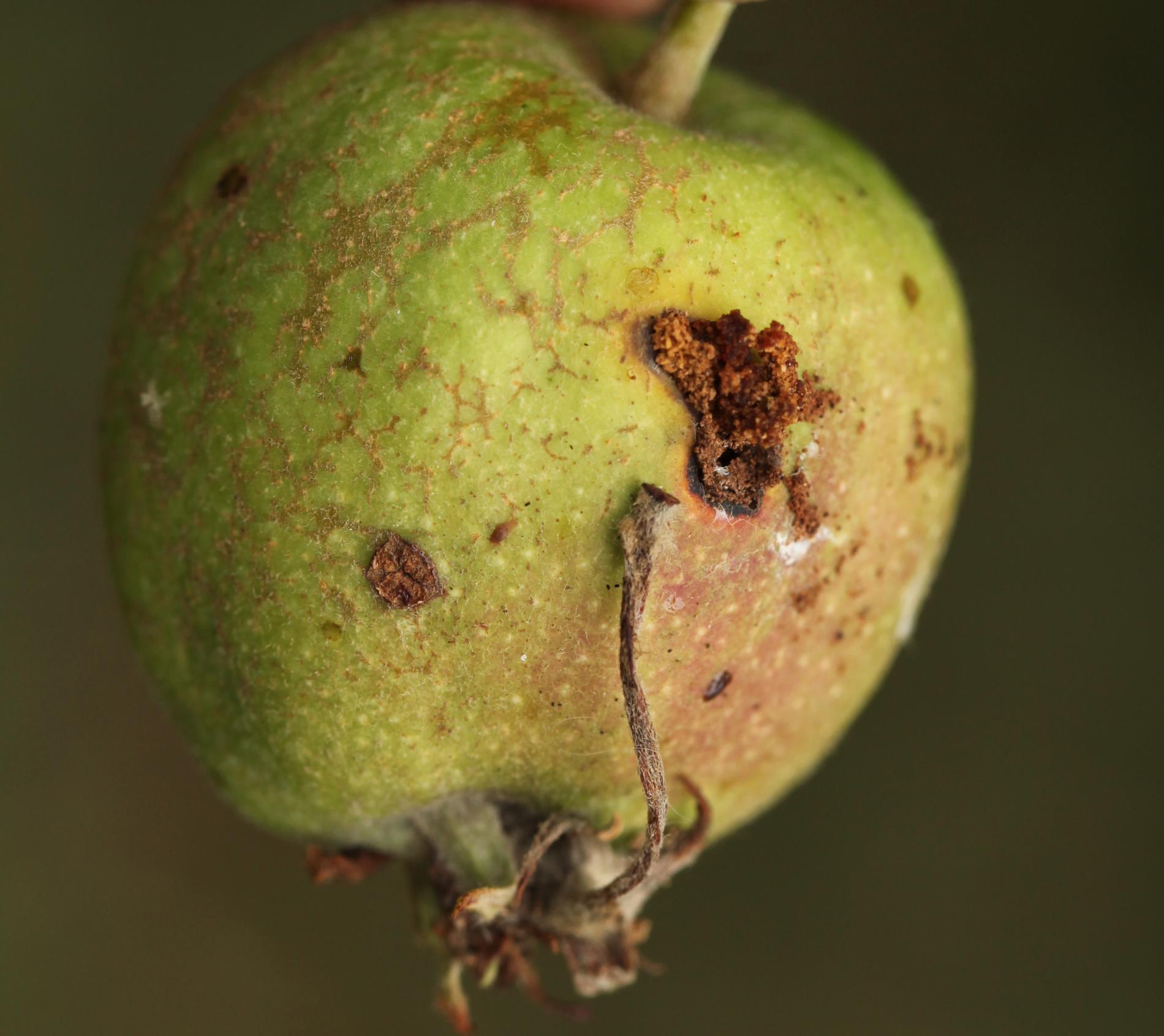 The larvae feed on the seeds and pulp of the apple, causing internal damage that is not visible on the surface. This can lead to the development of rot and mold, making the apple unsuitable for consumption or sale. Masses of frass can be presnet on the surface of the fruit. In addition to the direct damage caused by the larvae feeding on the fruit, the codling moth also creates entry points for other pests and diseases to infect the tree. This can further impact the health and productivity of the apple tree.