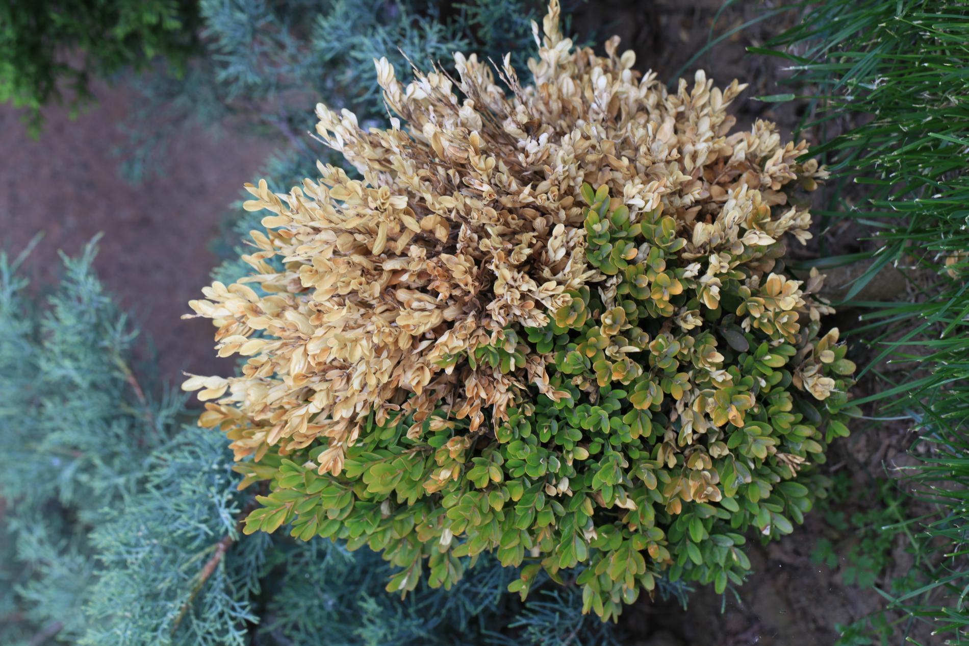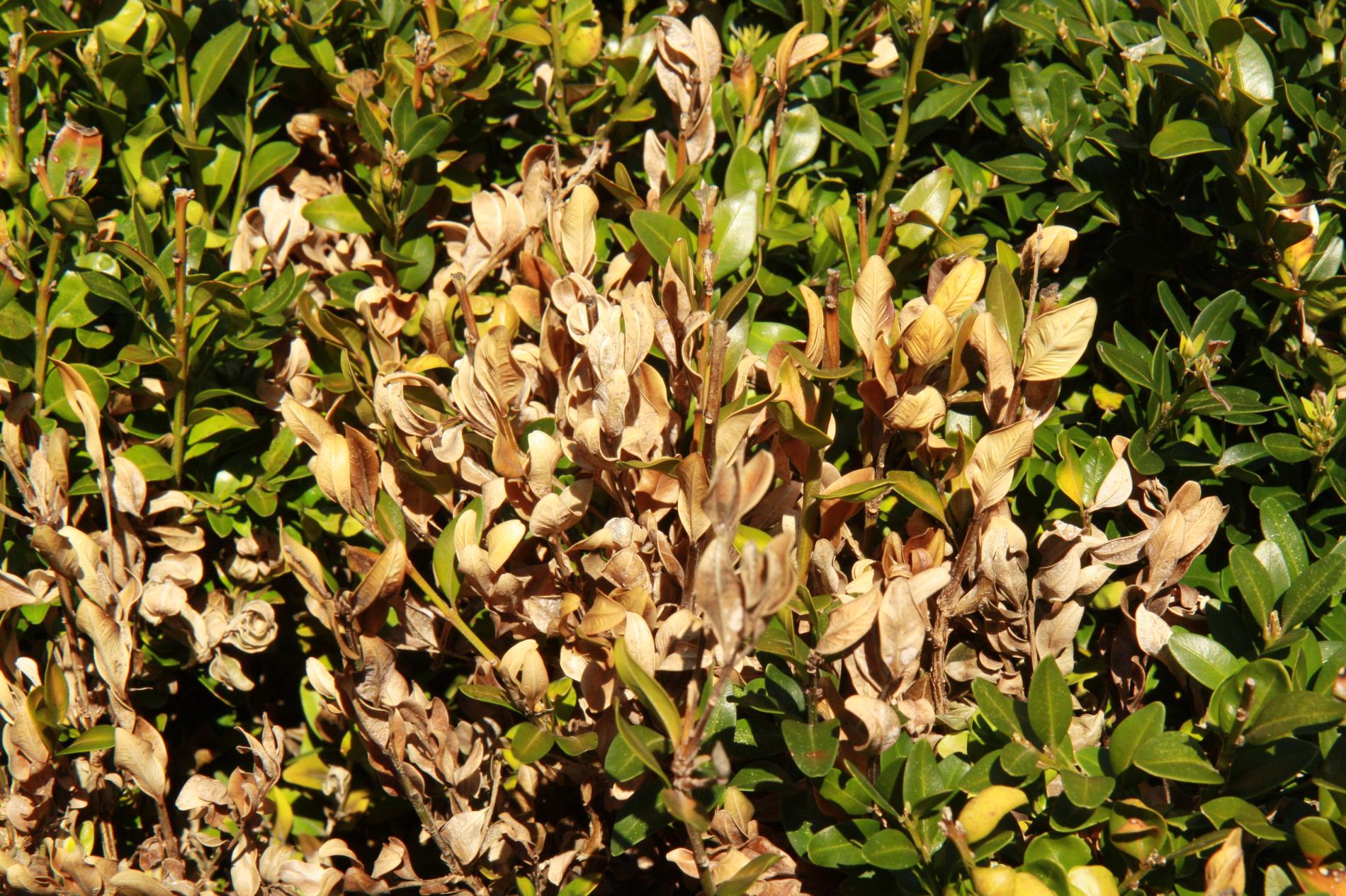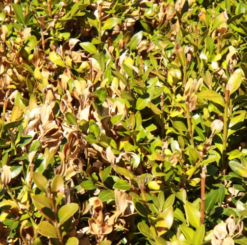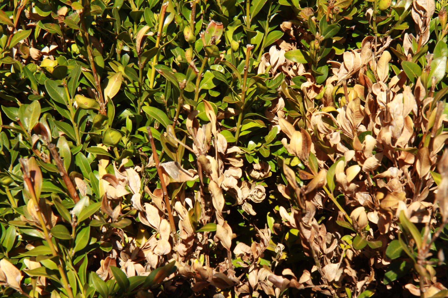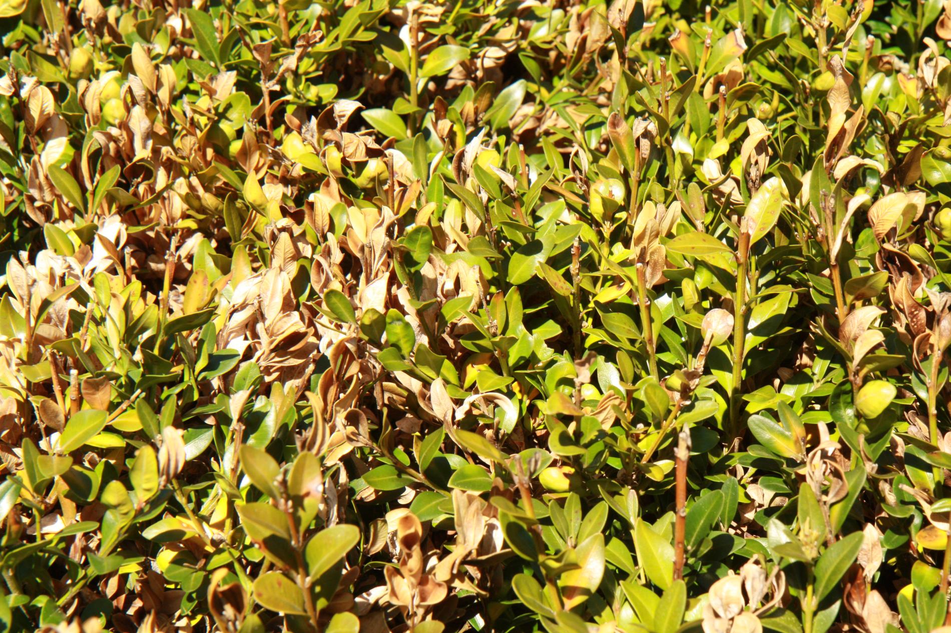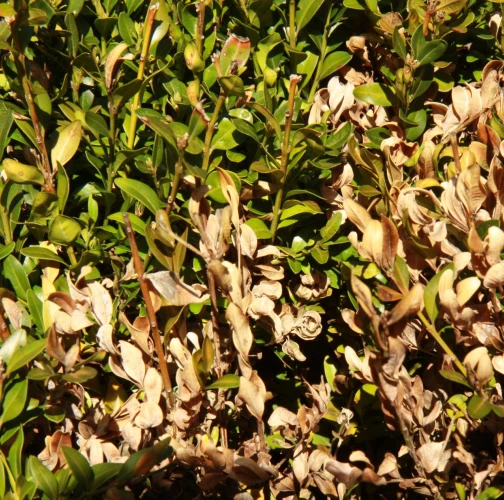 Boxwood blight (Cylindrocladium buxicola, also known as Calonectria pseudonaviculata) is a destructive fungal disease affecting boxwood plants (Buxus spp.). It causes leaf spots, defoliation, and stem lesions, leading to significant plant damage and sometimes death. The disease thrives in moist, warm conditions and spreads through infected plant material, tools, or water splashes. Effective management includes sanitation practices, fungicide application, and the use of resistant boxwood varieties. The fungus produces spores (conidia) that spread through water, wind, or contaminated tools. Spores land on boxwood leaves or stems in warm, moist conditions and penetrate the plant tissue. The pathogen grows, producing more spores that can infect surrounding plants. It survives in plant debris or soil over winter, waiting for favorable conditions to restart the cycle.