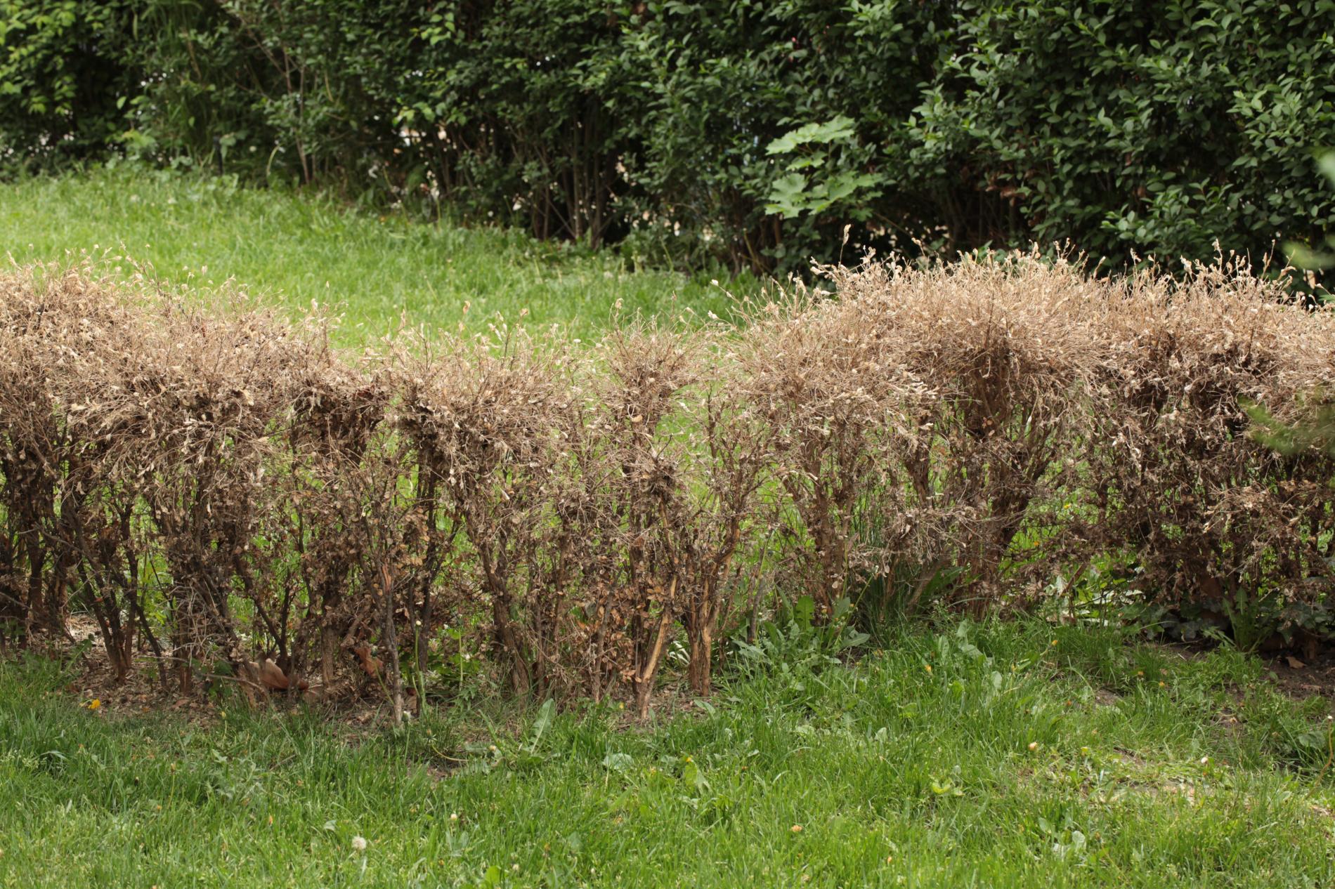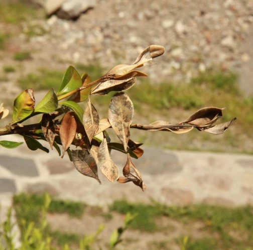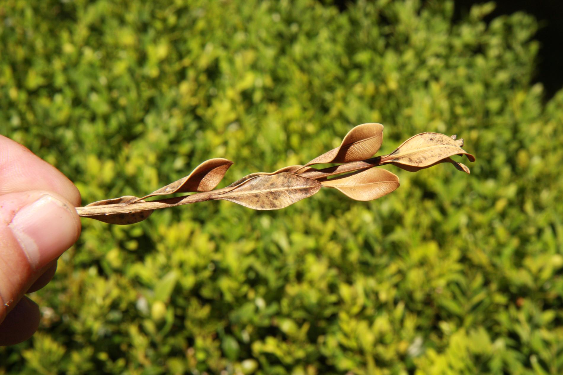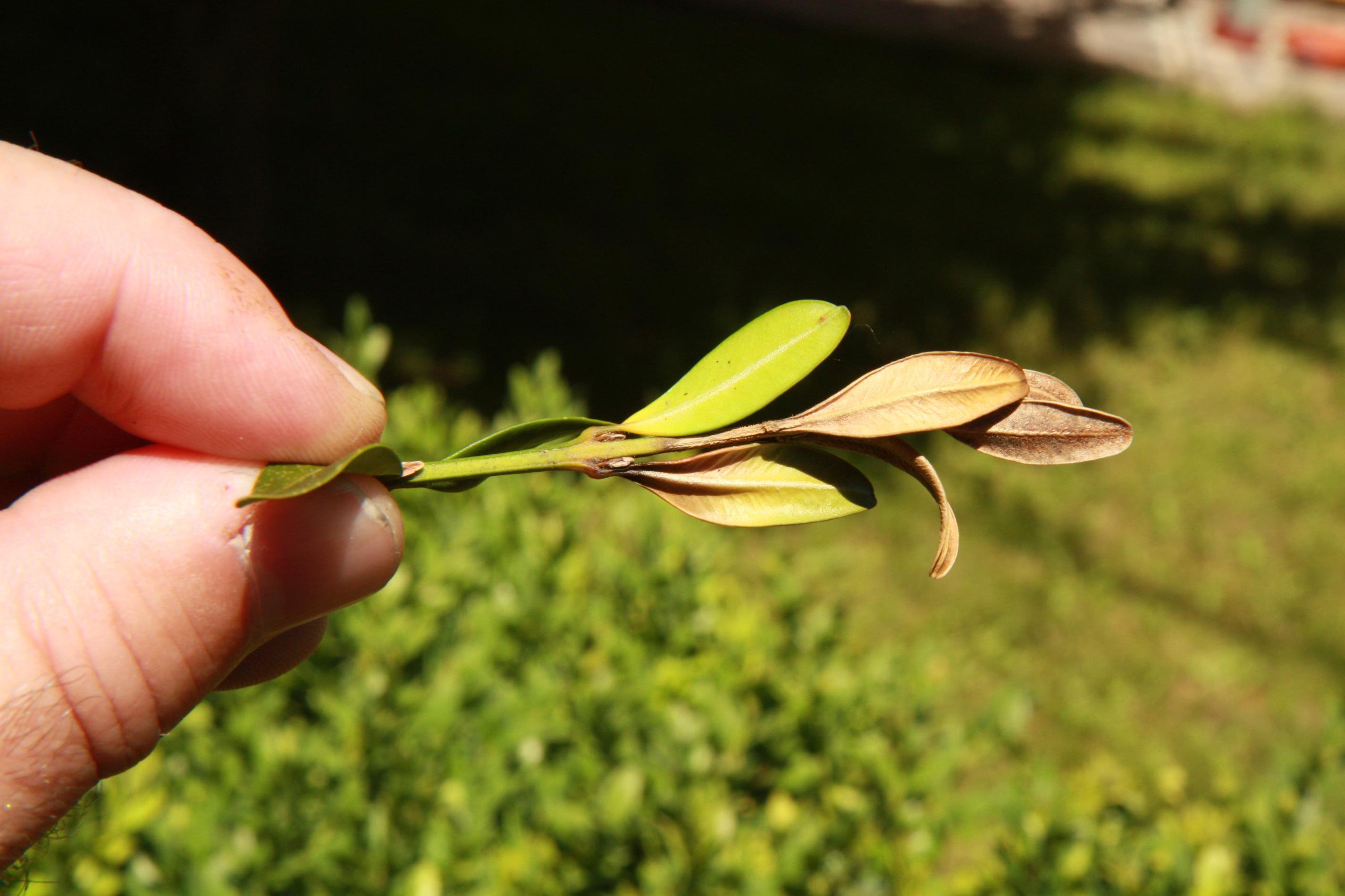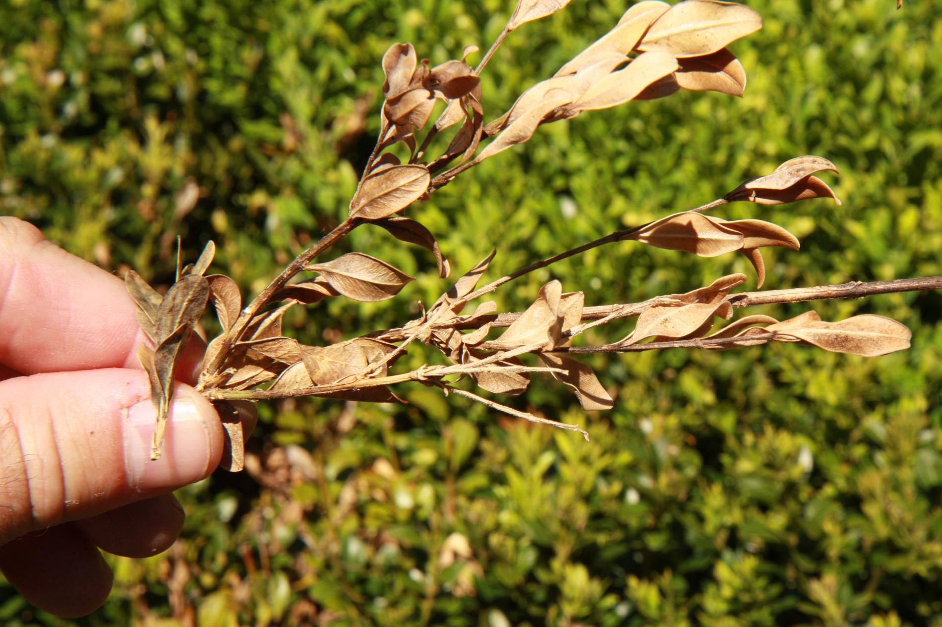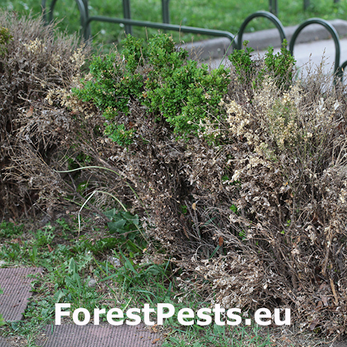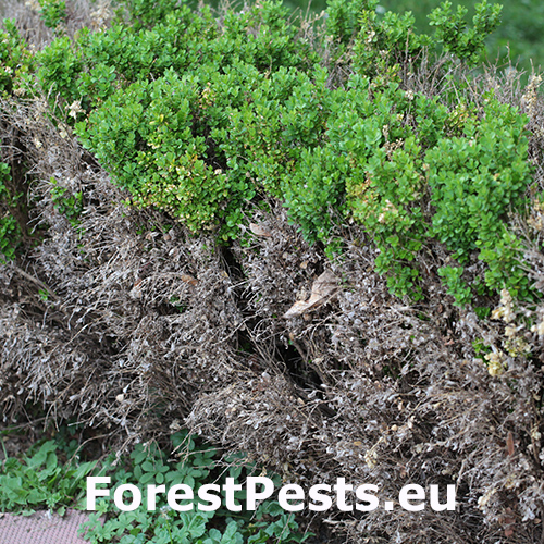 Circular, brown to black spots on leaves, often with a darker border. Rapid leaf drop, leaving bare stems. Dark brown or black streaks on stems. In severe cases, plant branches or entire shrubs may die. The damage resembles that caused by the species Cydalima perspectalis. However, the leaves are not eaten, and other symptoms typical of larval feeding are absent.