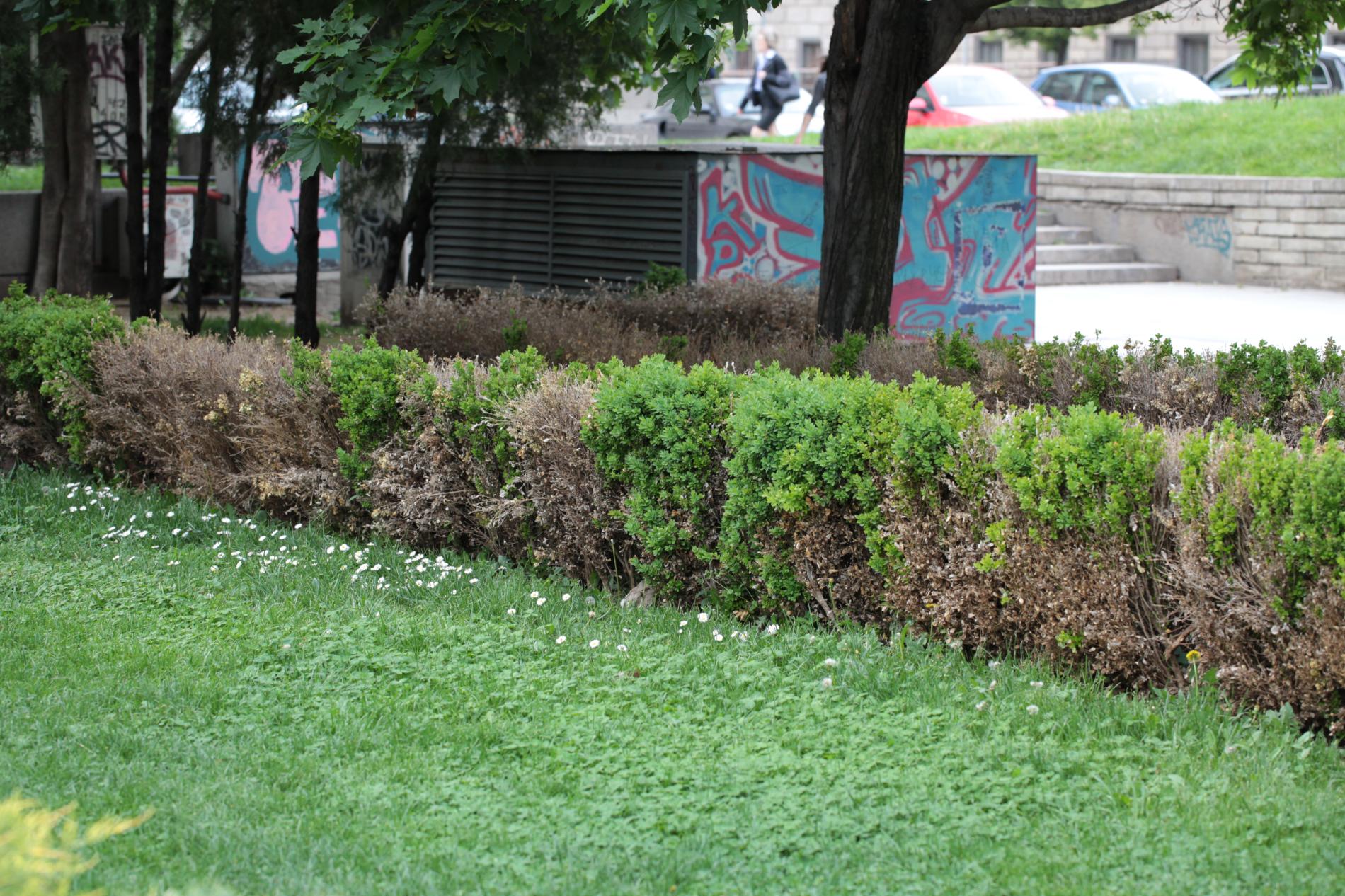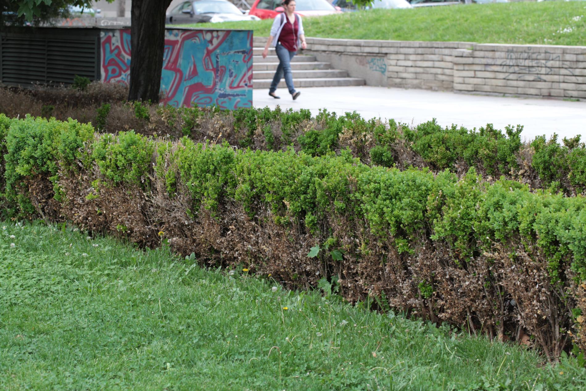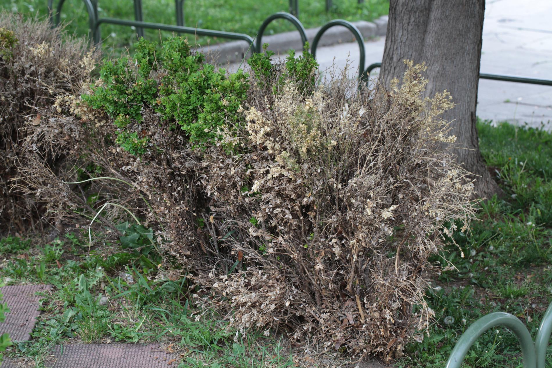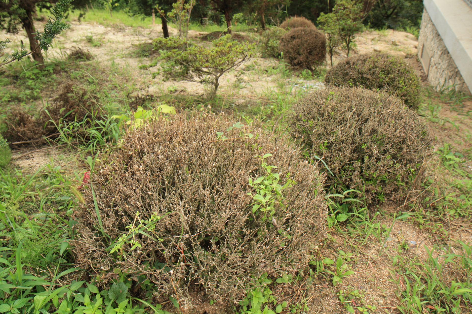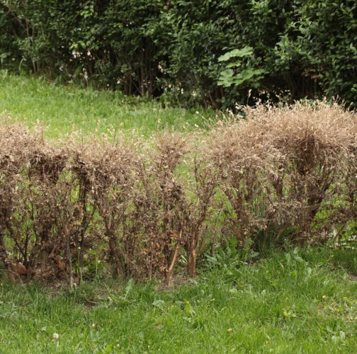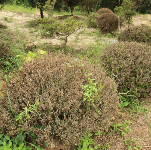 Circular, brown to black spots on leaves, often with a darker border. Rapid leaf drop, leaving bare stems. Dark brown or black streaks on stems. In severe cases, plant branches or entire shrubs may die. The damage resembles that caused by the species Cydalima perspectalis. However, the leaves are not eaten, and other symptoms typical of larval feeding are absent.