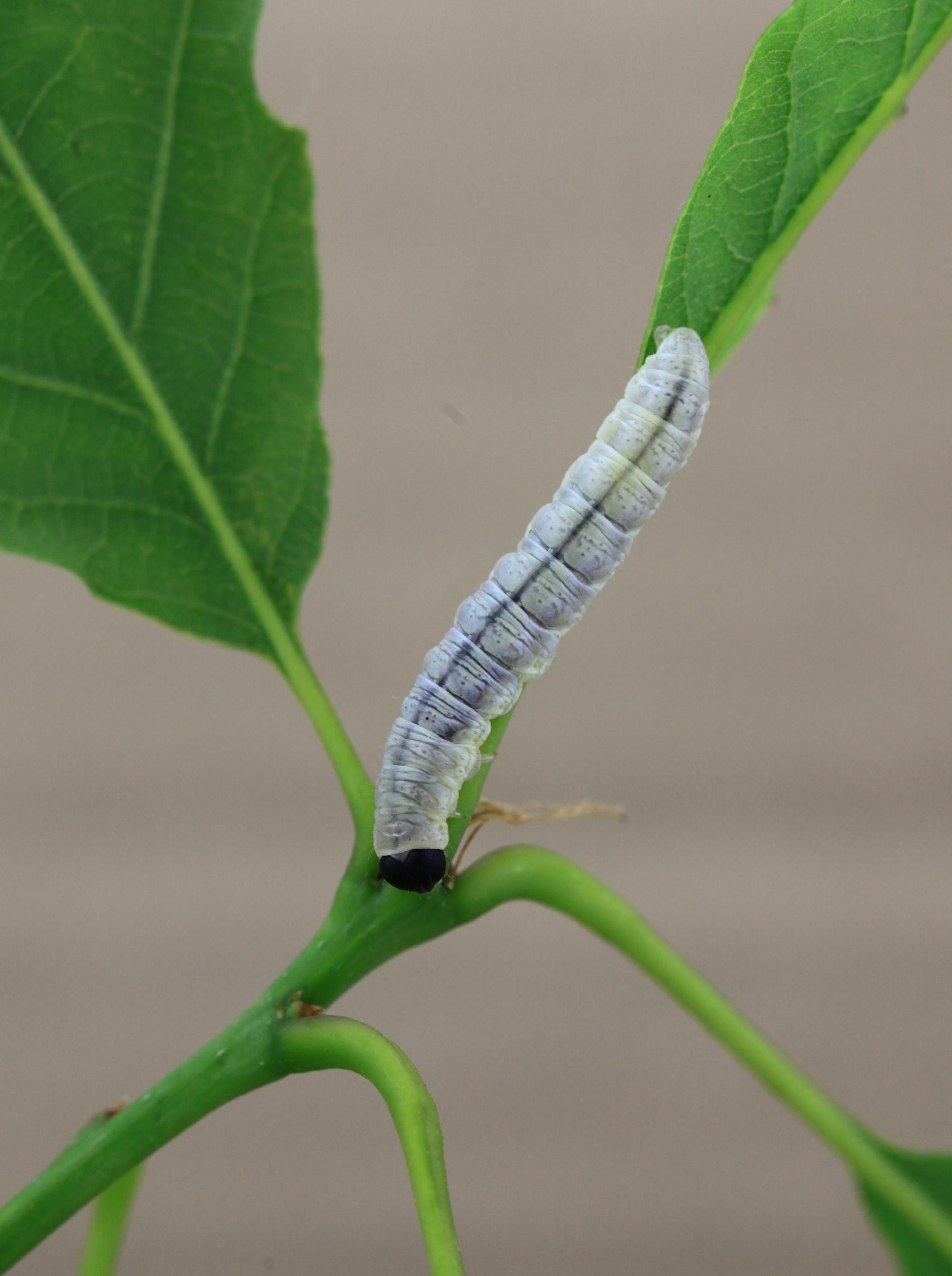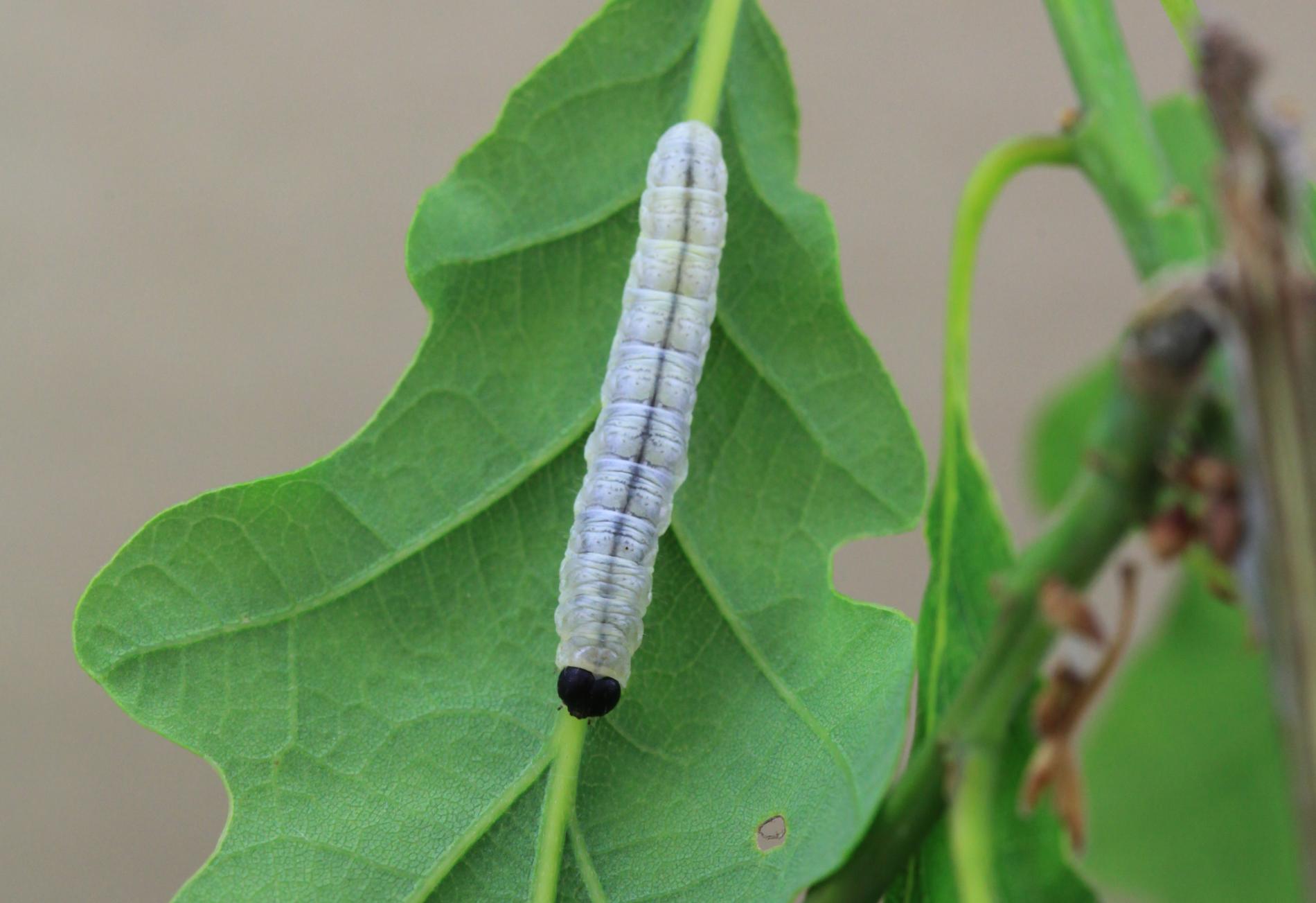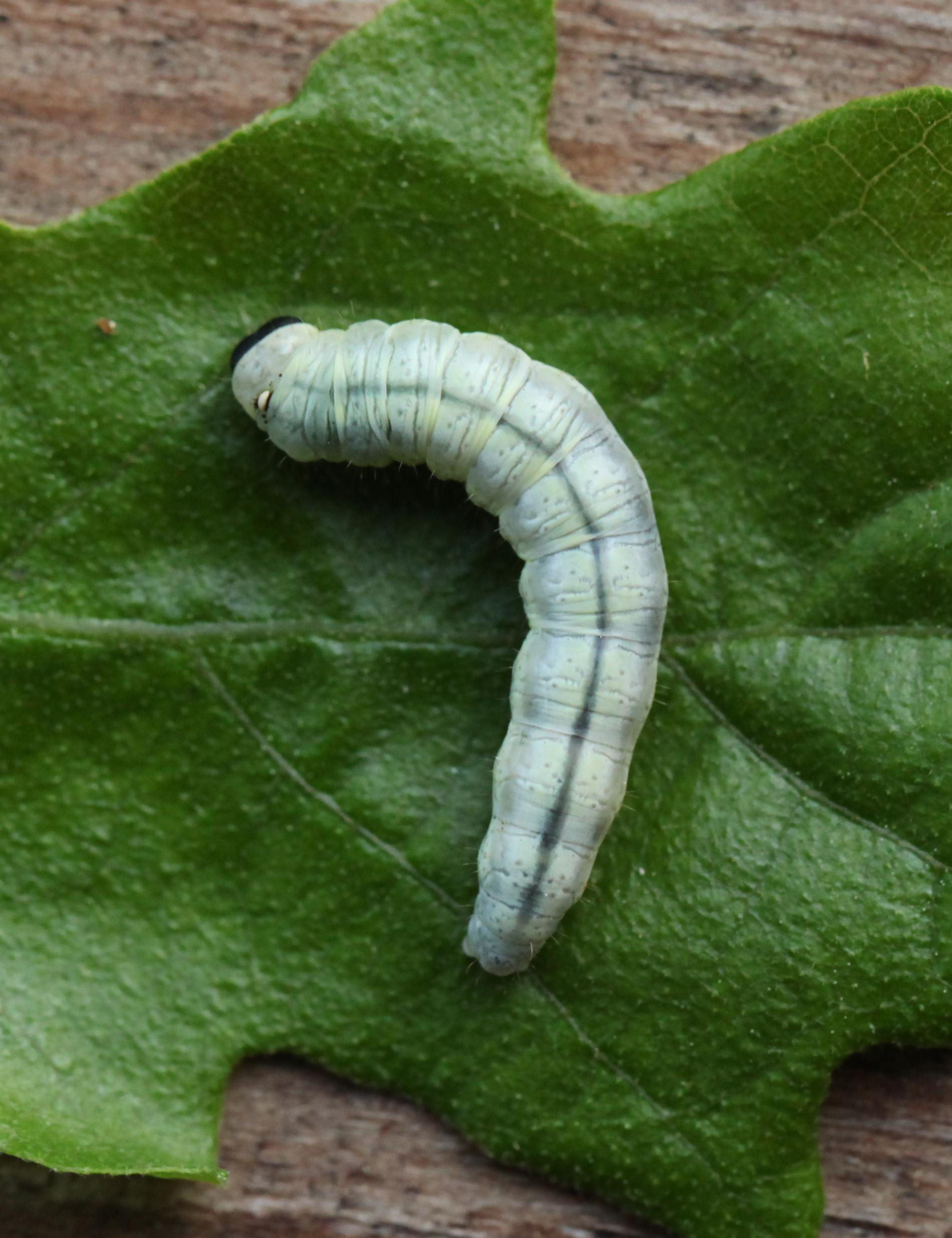 Larva 30-35 mm in length, dull greenish-whitish-yellowish, dorsal line darker, head and spiracles black.