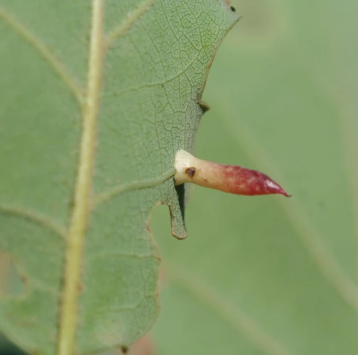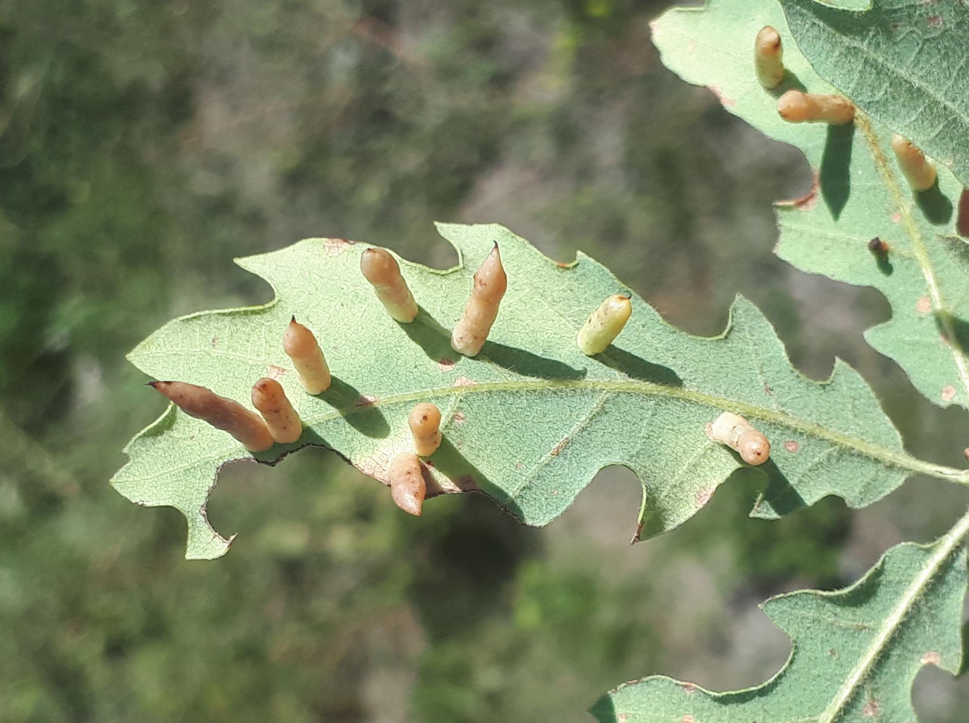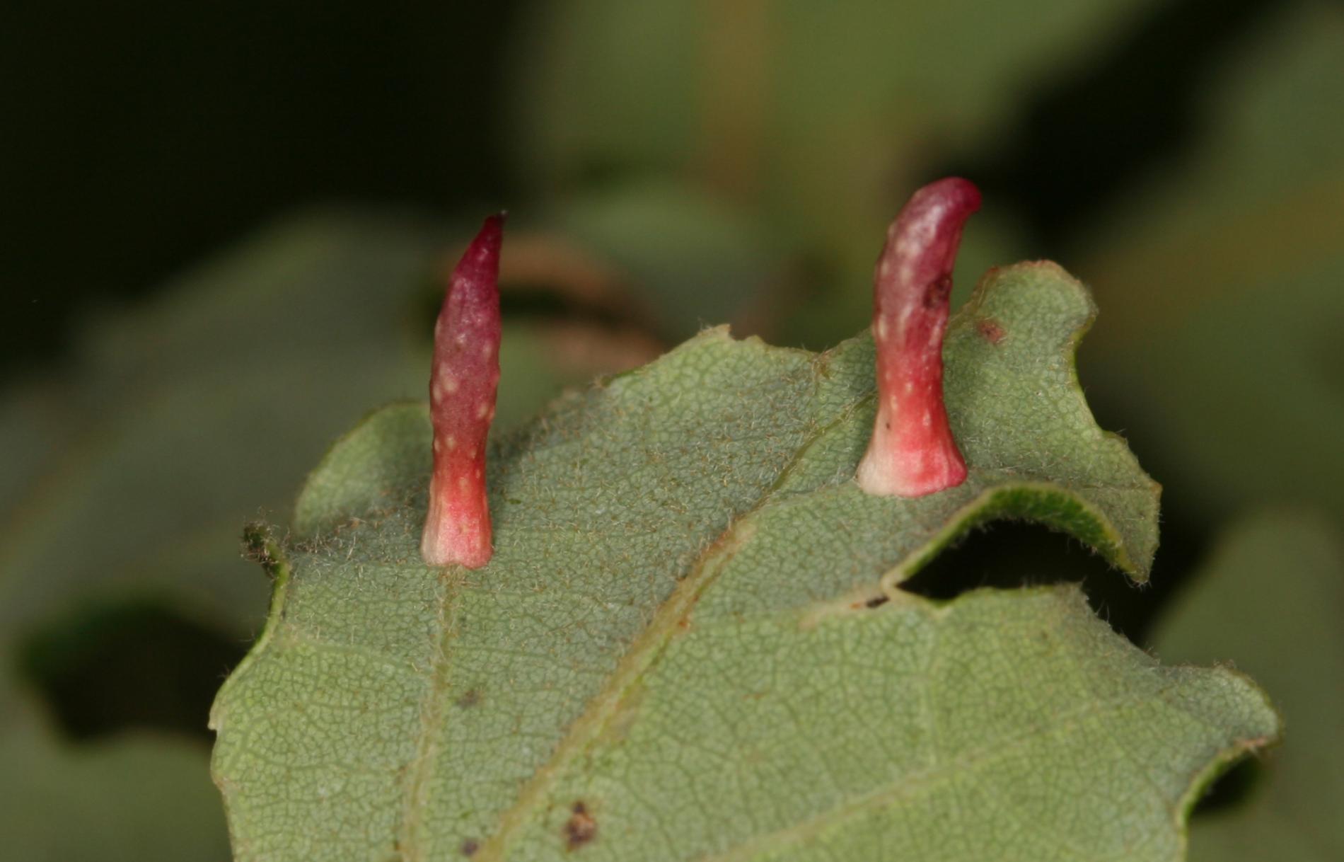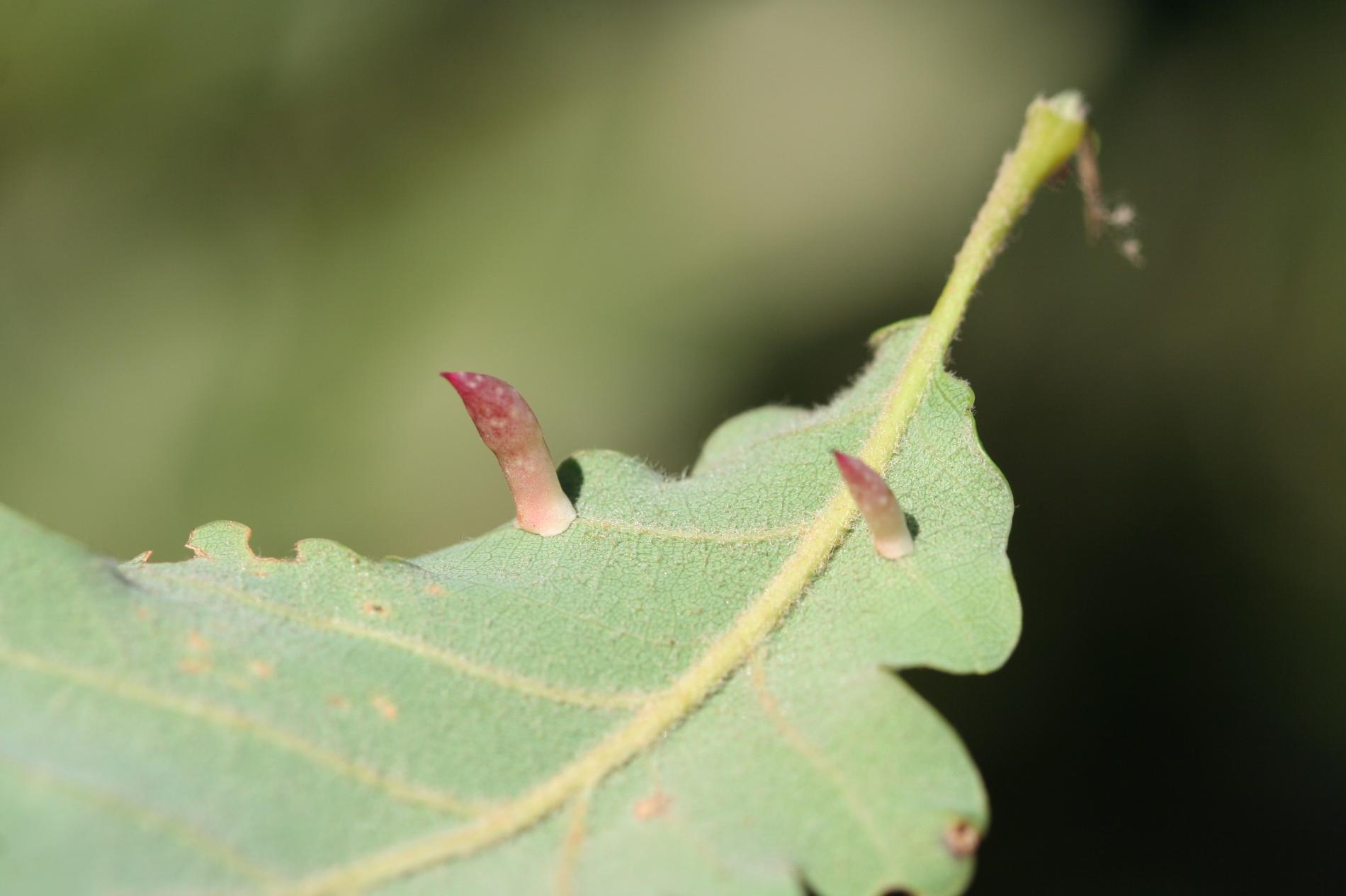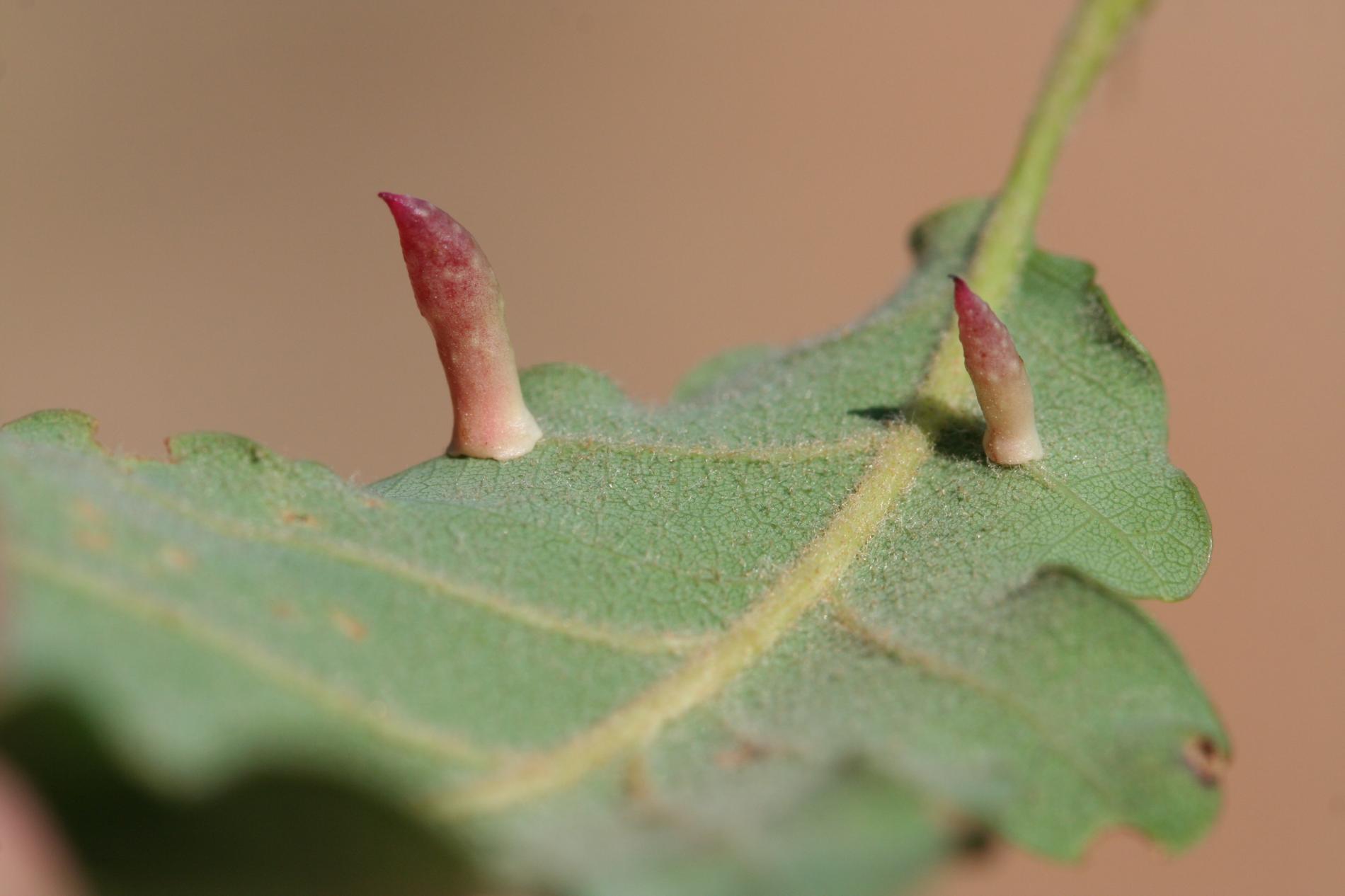 6-15 mm long, horn-shaped, usually gregarious gall formed on the underside of the leaves – unique shape for a cynipid gall on leaves.