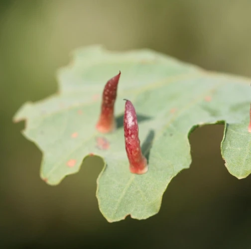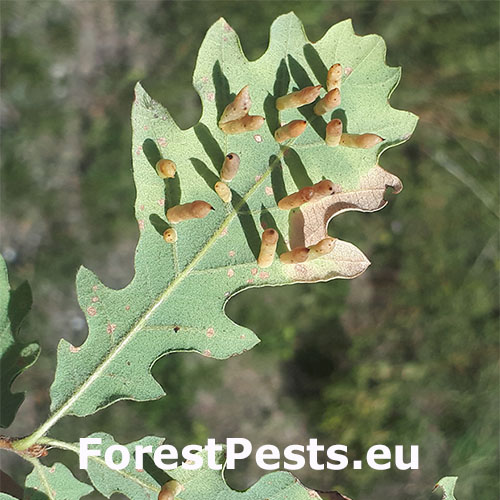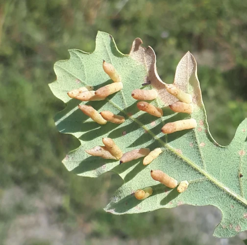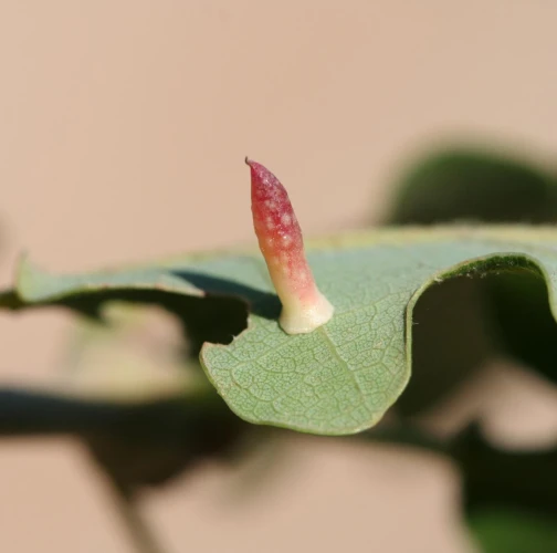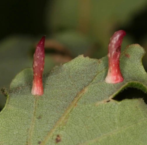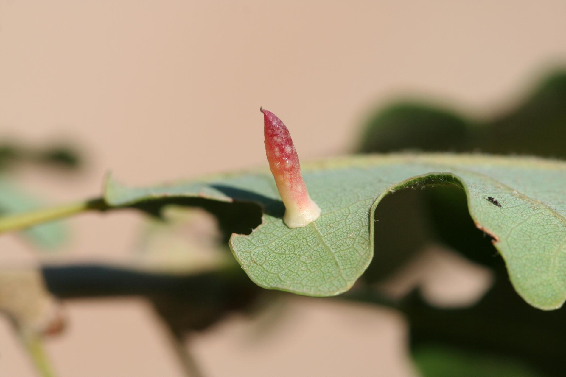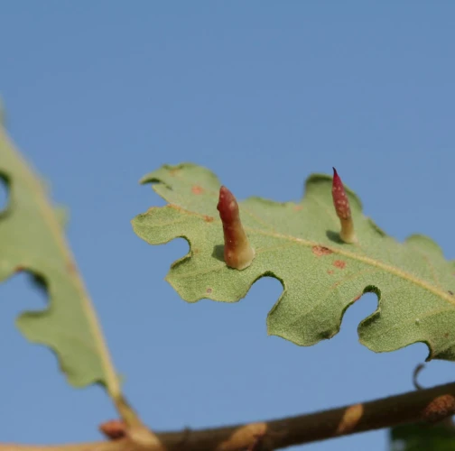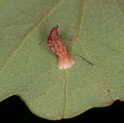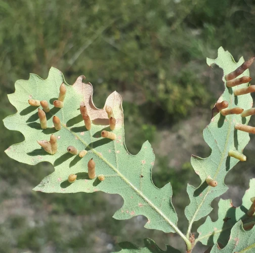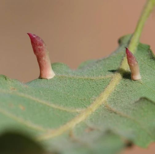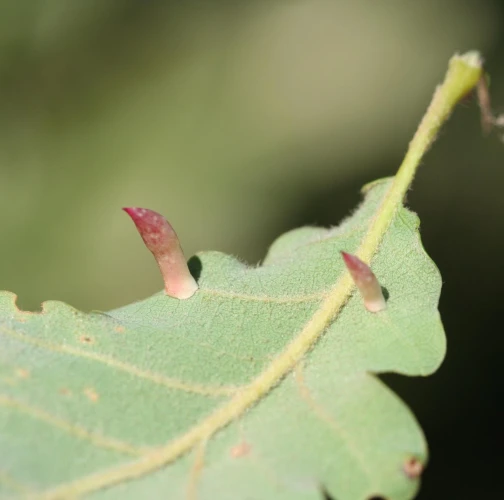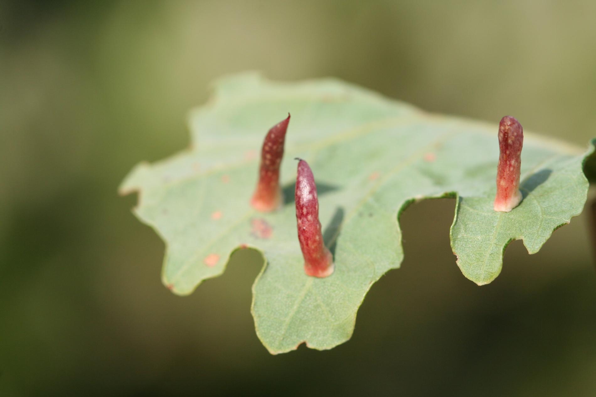6-15 mm long, horn-shaped, usually gregarious gall formed on the underside of the leaves – unique shape for a cynipid gall on leaves.