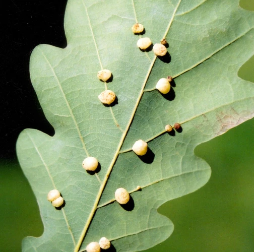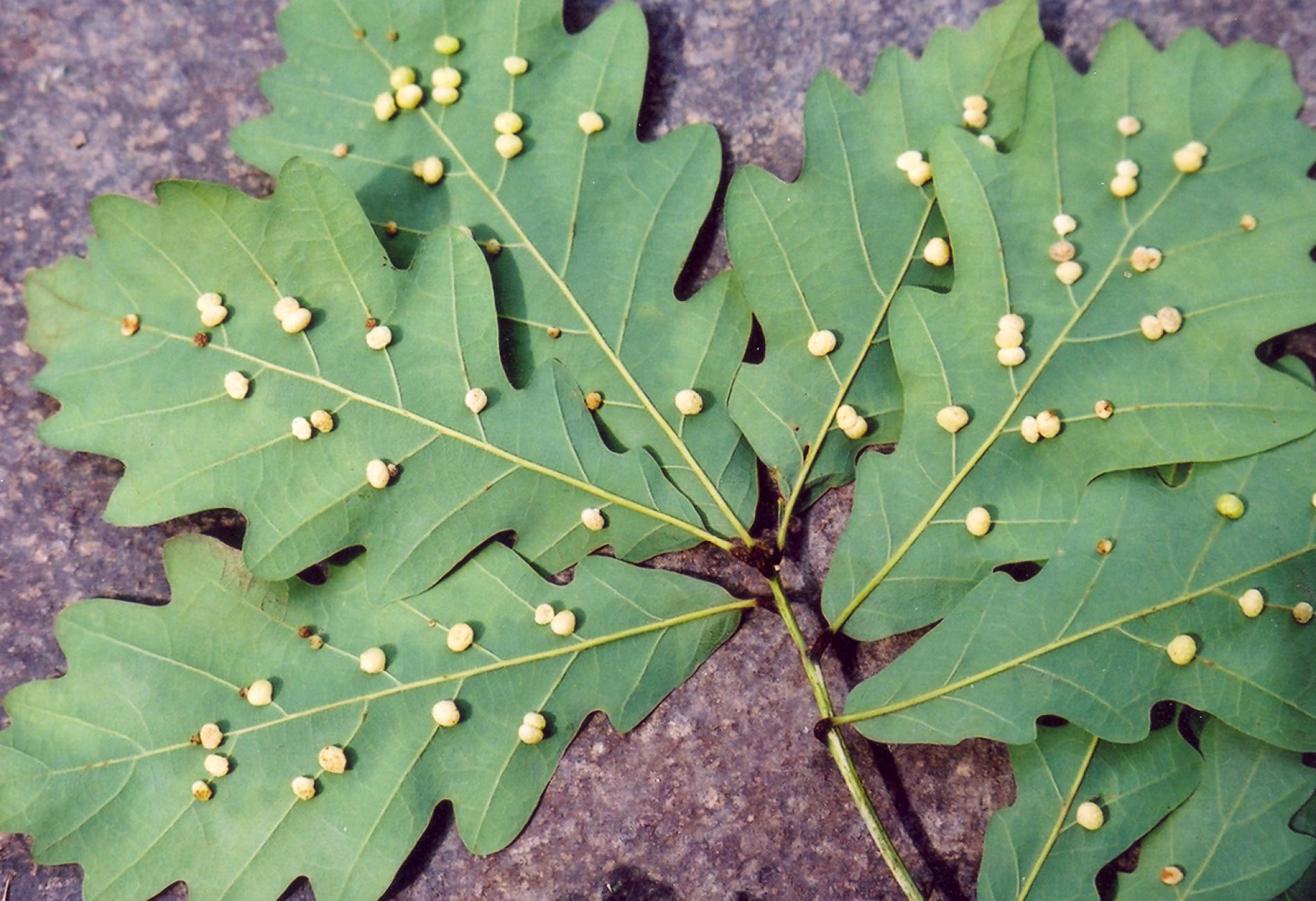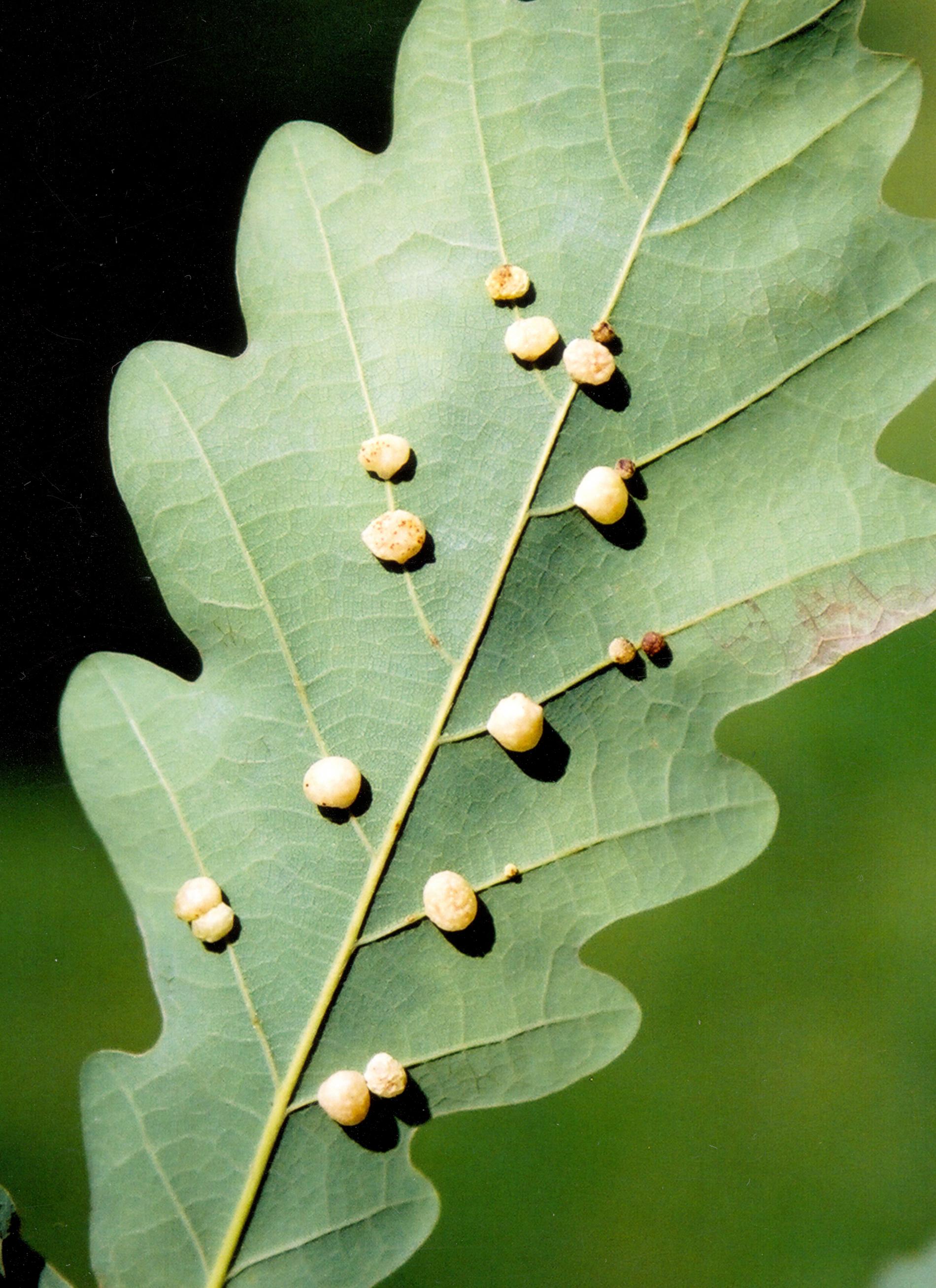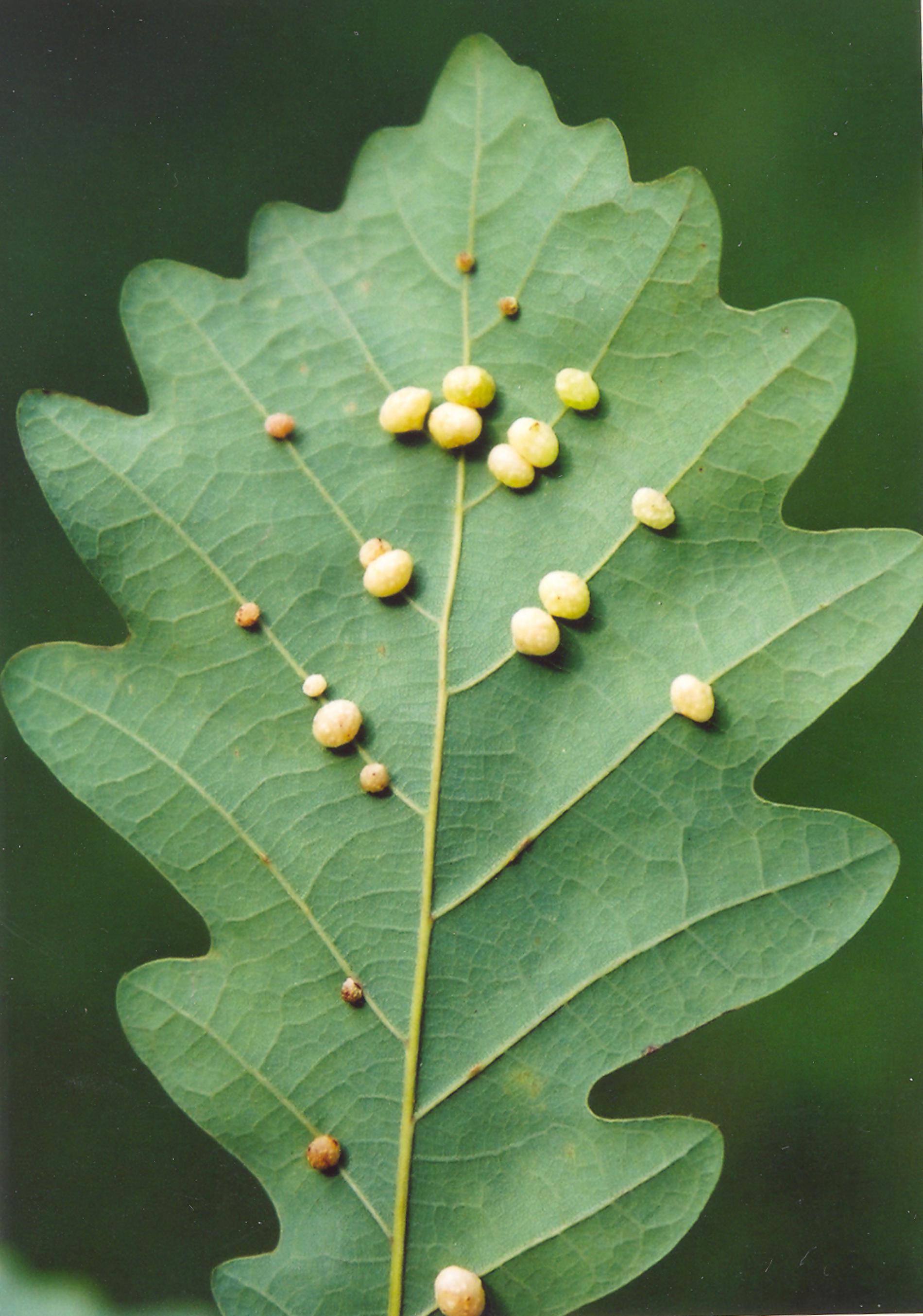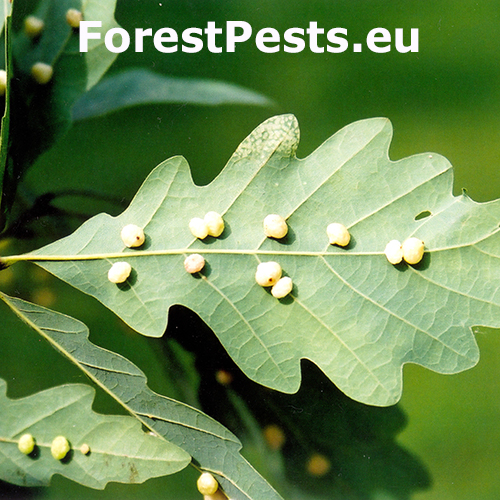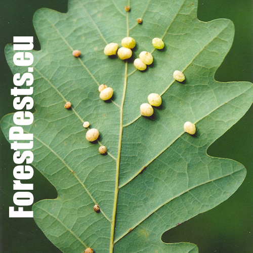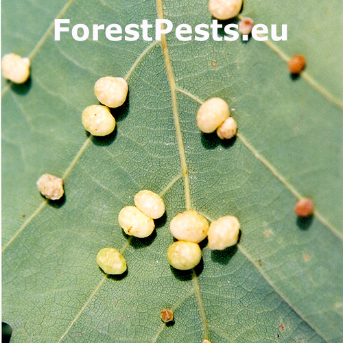The asexual generation creates small, pale, 4-6 mm long galls on the bottom side of leaves. They are usually found in groups of 10-20. The galls are attached to leaf veins. One larva develops in each gall. The sexual generation has a different gall.