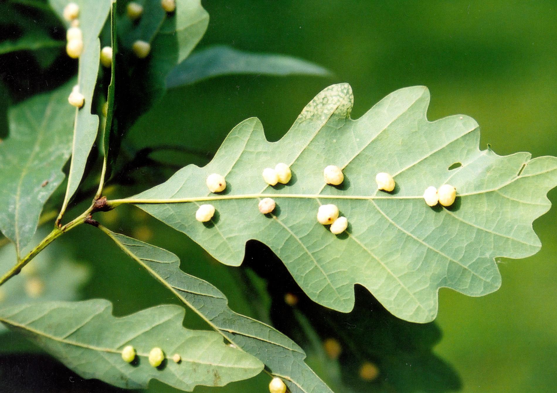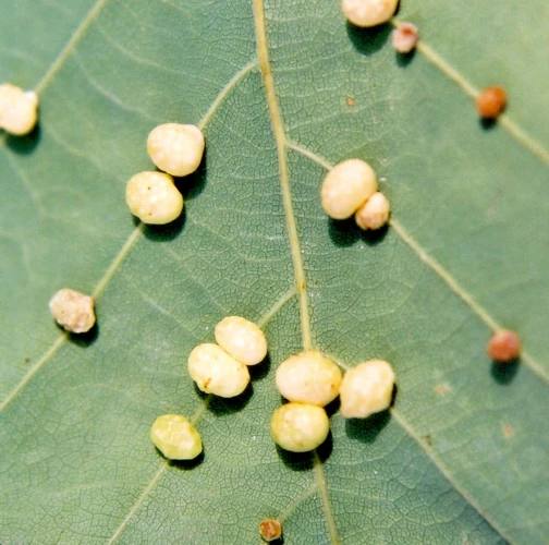 Small, pale, 4-6 mm long galls on the bottom side of leaves.