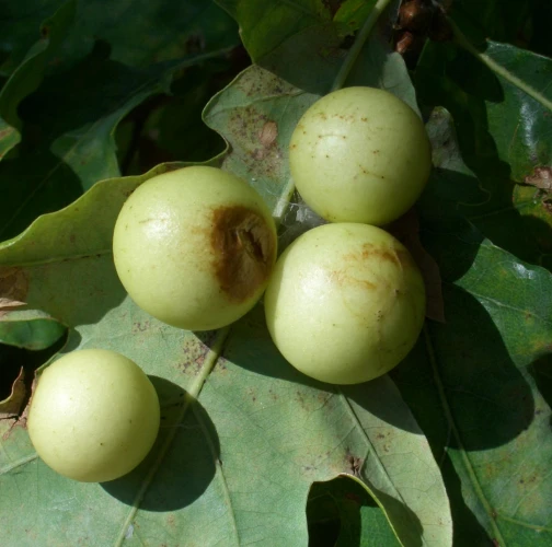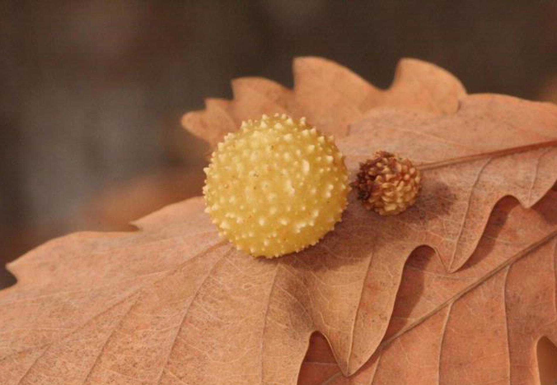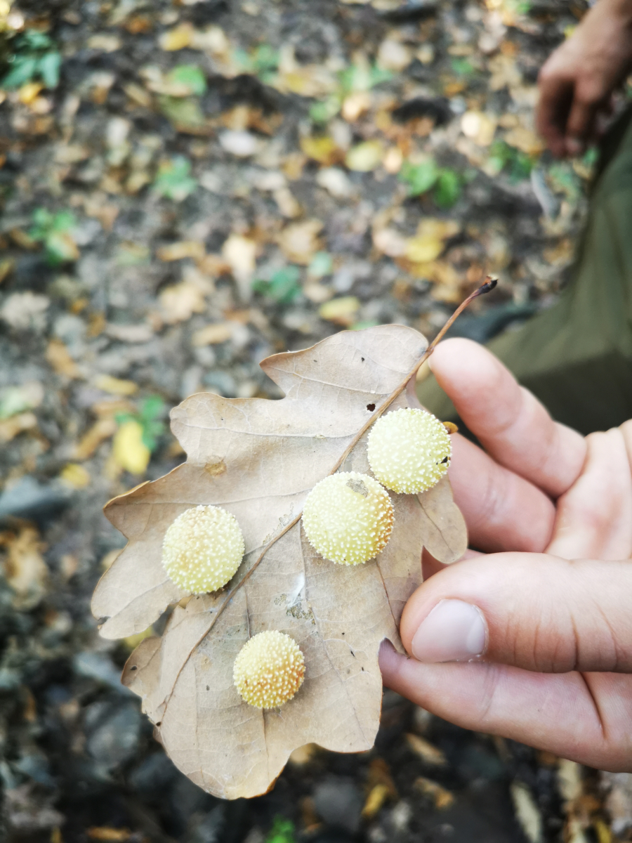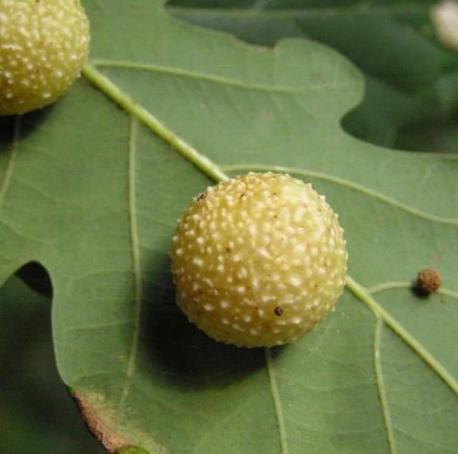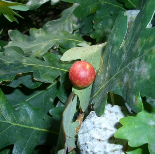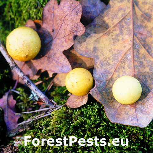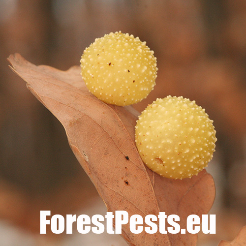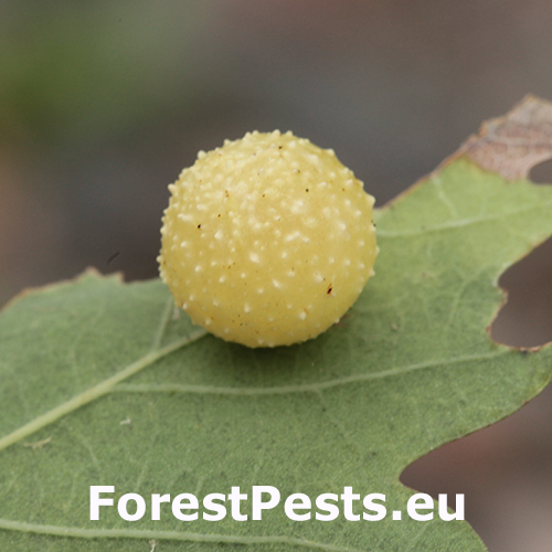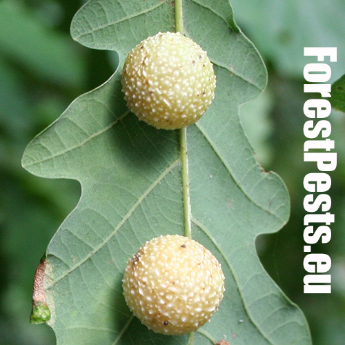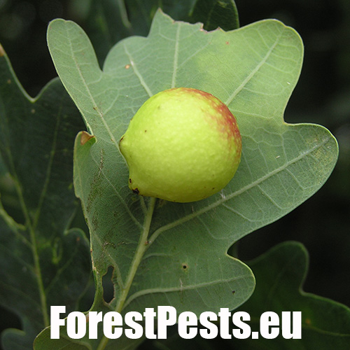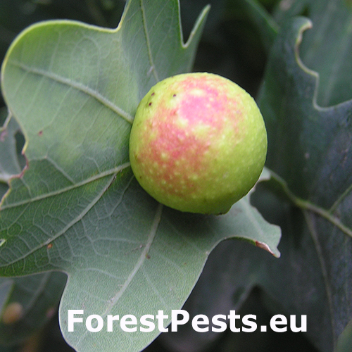 The gall is about 15-25 mm in zize, small ball-like, found on the bottom side of the leaf. The inside is soft and spongy. The gall surface is smooth, if it occurs on Quercus robur, or rough, if it occurs on Quercus petraea. The colour of the gall varies from yellowish green to red. The fully developed small wasp overwinters inside the gall and leaves it in spring.