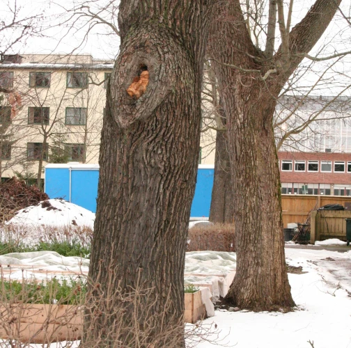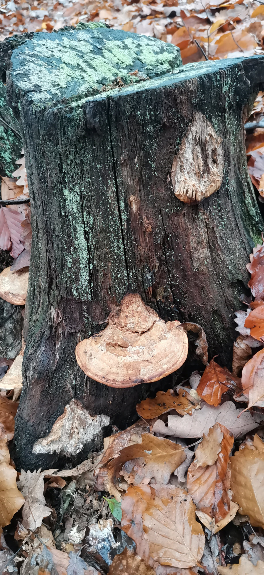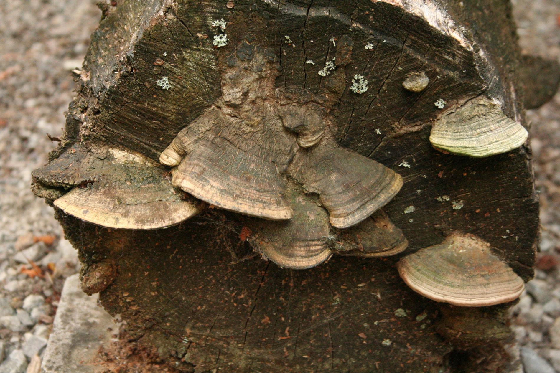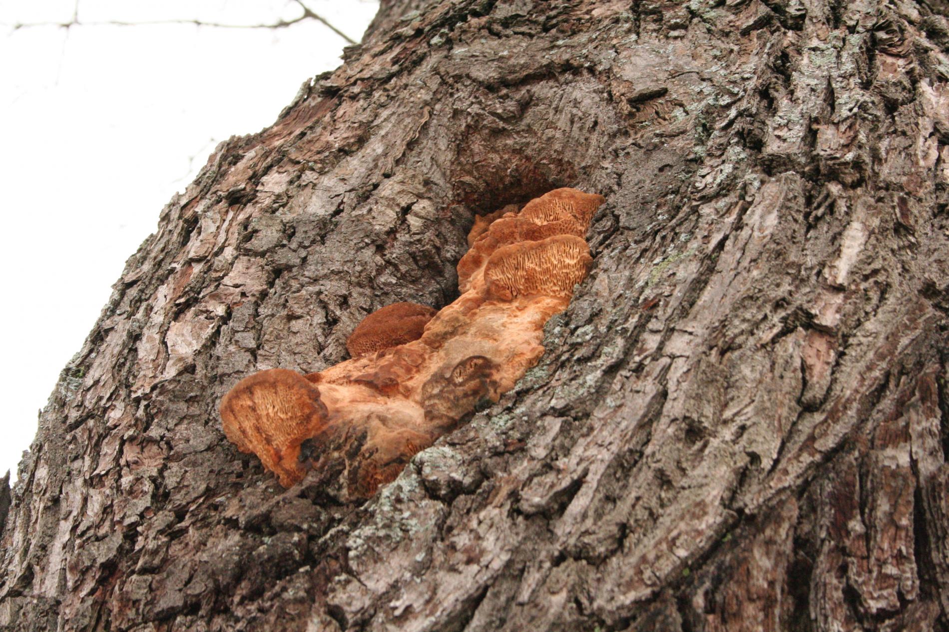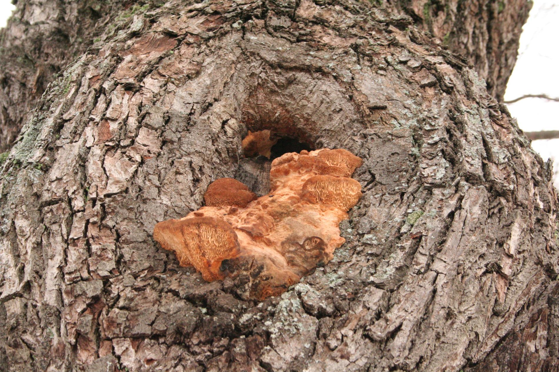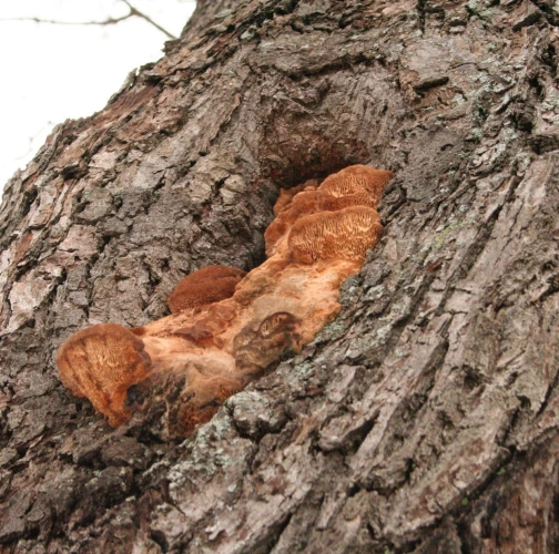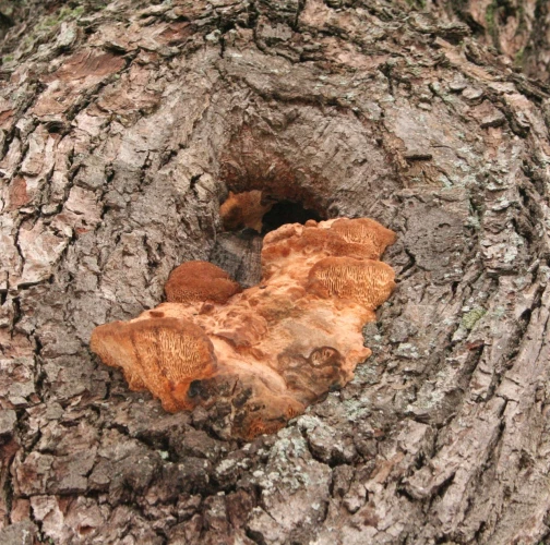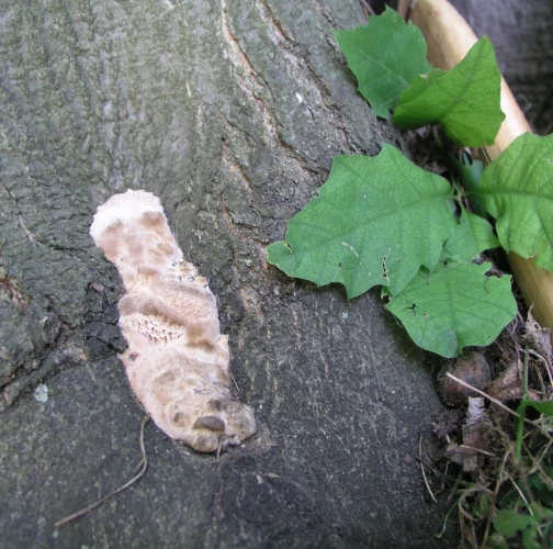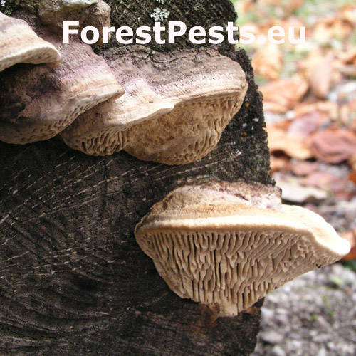 The fungus creates cork and even woody bracket fruiting bodies, spilt and widely attached to the substrate when young and dark brown when old. The surface is pallid brown to greyish brown, slightly zoned. Young pores around the growing edge are round, later on they create a maze-like structure formed by up to 1 mm thick panels in a radial pattern starting in the place of attachment. It infects the tree mostly through wounds. It causes an intense reddish brown heartwood rot. In the advanced stage of the decay, a white syrrocium is formed in wood cracks. The harmful effect is of greater significance in parks and alleys than in the forest environment.