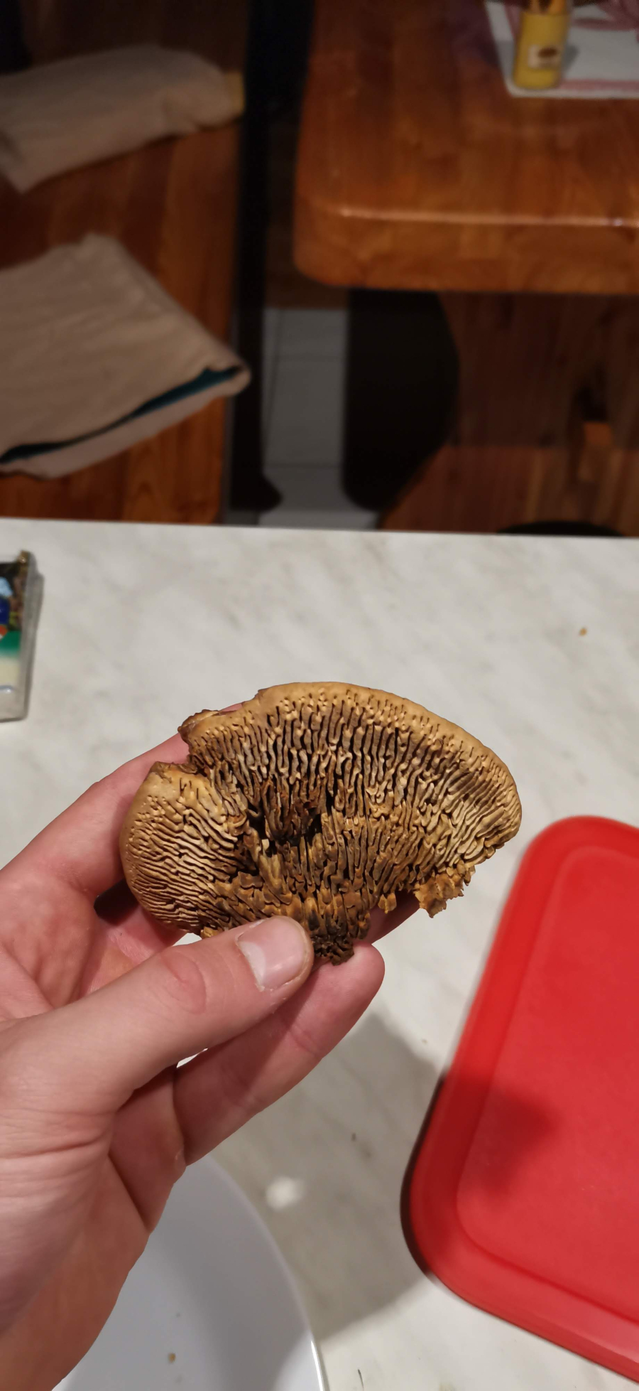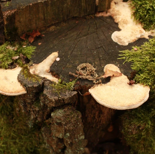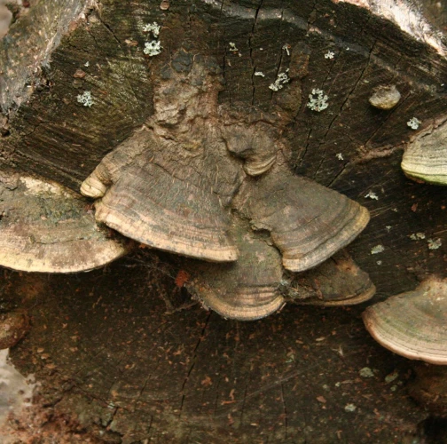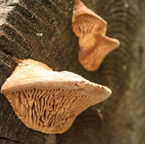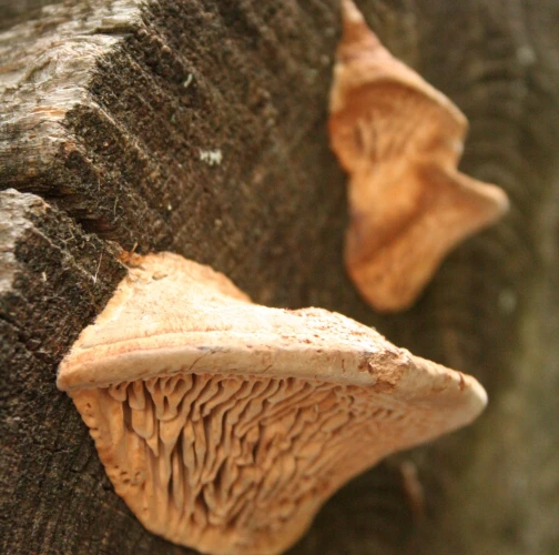 The fungus creates cork and even woody bracket fruiting bodies, spilt and widely attached to the substrate when young and dark brown when old.