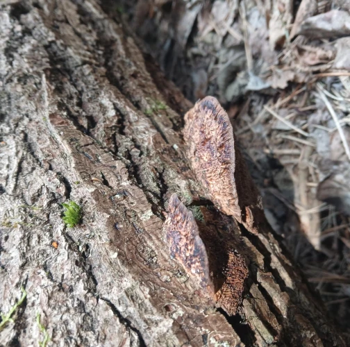 Presence of grayling to reddish brown fruiting bodies on the trunk.