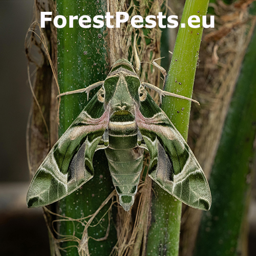Daphnis nerii, the oleander hawk-moth, is a striking migratory moth of the family Sphingidae. It regularly flies from Africa and Asia to southern and occasionally central Europe. Adults are active at dusk and night, feeding on nectar from fragrant flowers. The larvae develop mainly on Nerium oleander, but can also feed on other Apocynaceae, such as Tabernaemontana and Vinca. In warm regions, the species may have multiple generations annually. Larvae can reach up to 8.5 cm in length and show striking green or brown colors with characteristic eyespots. Though feeding on host plants' foliage, D. nerii is not considered a serious pest, as larval densities are usually low and damage is minor and mostly aesthetic.