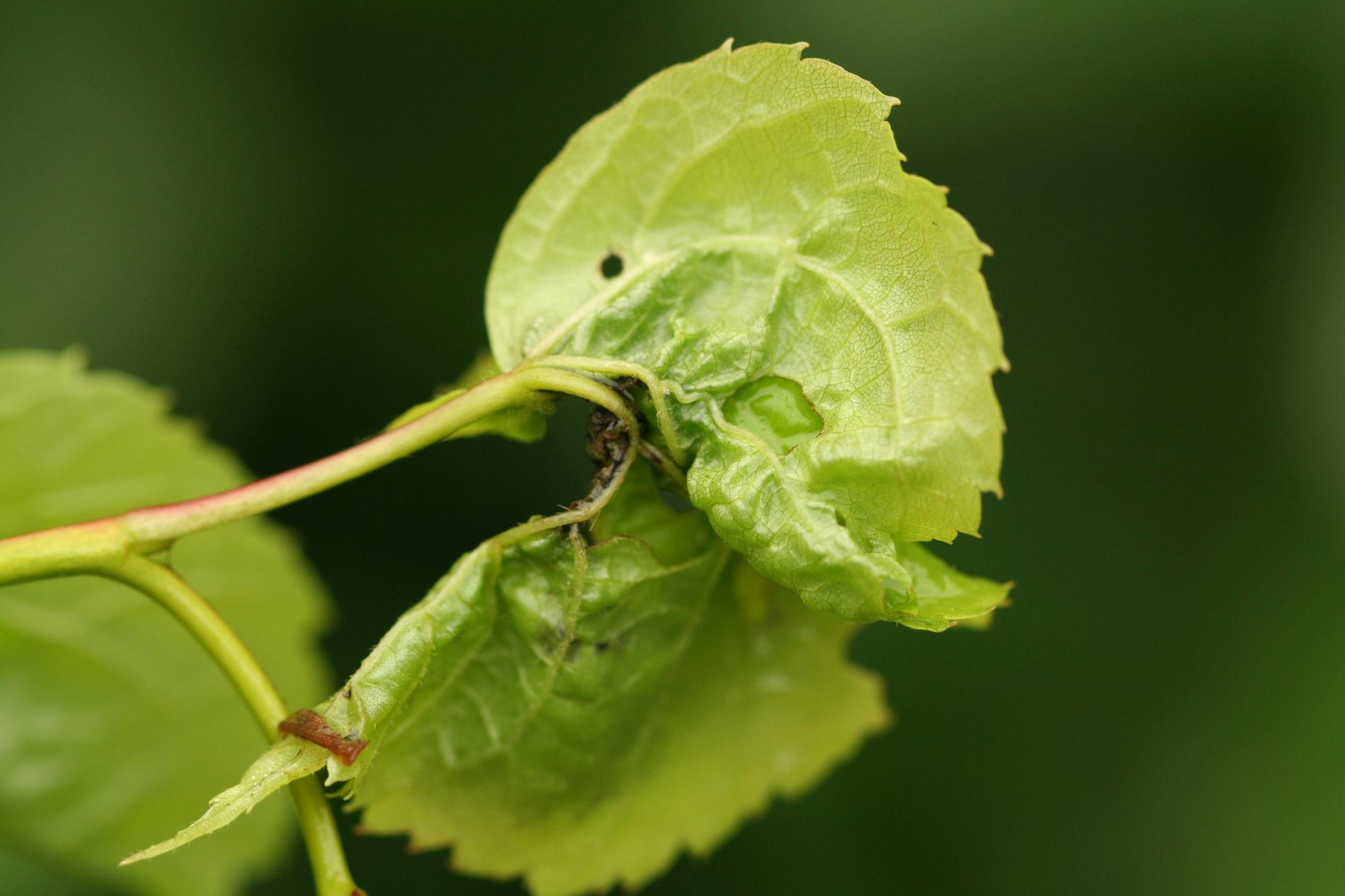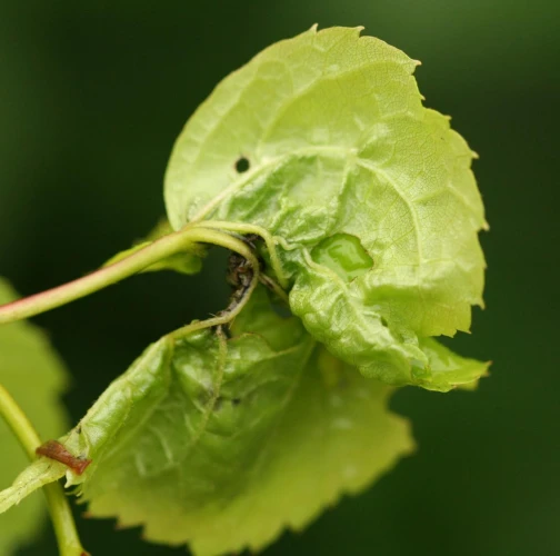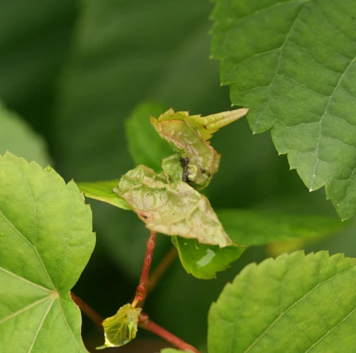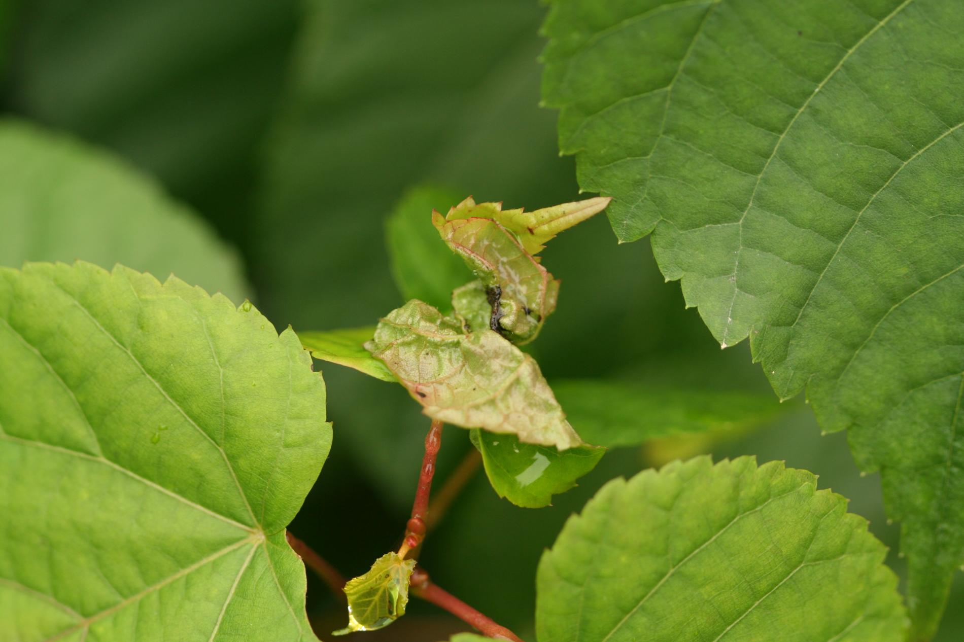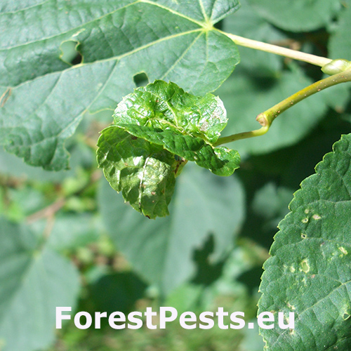 On affected linden trees, young terminal leaves are rolled and distorted with thickened veins. Inside the galls are orange-red larvae, and the galls give leaves a deformed appearance.