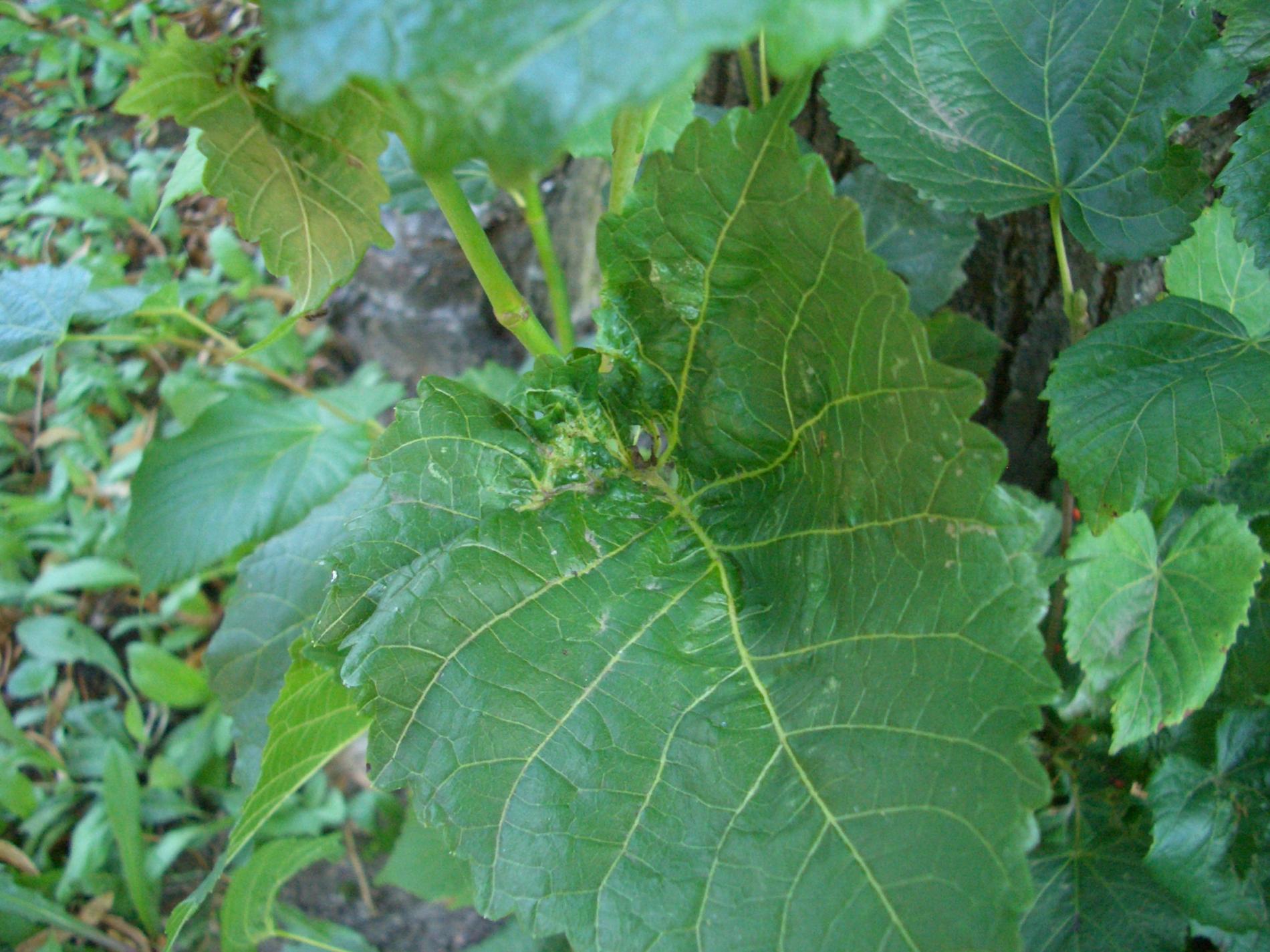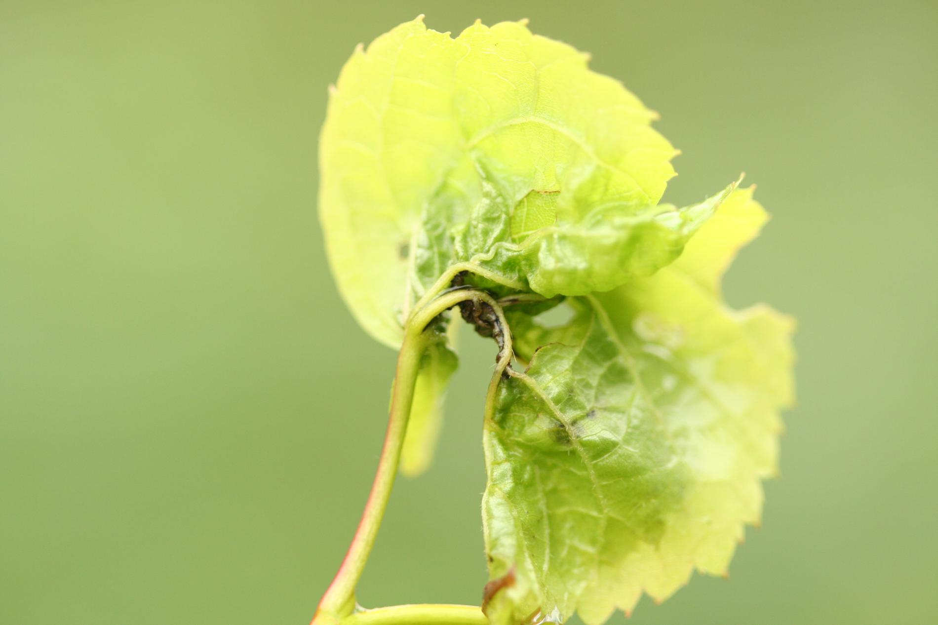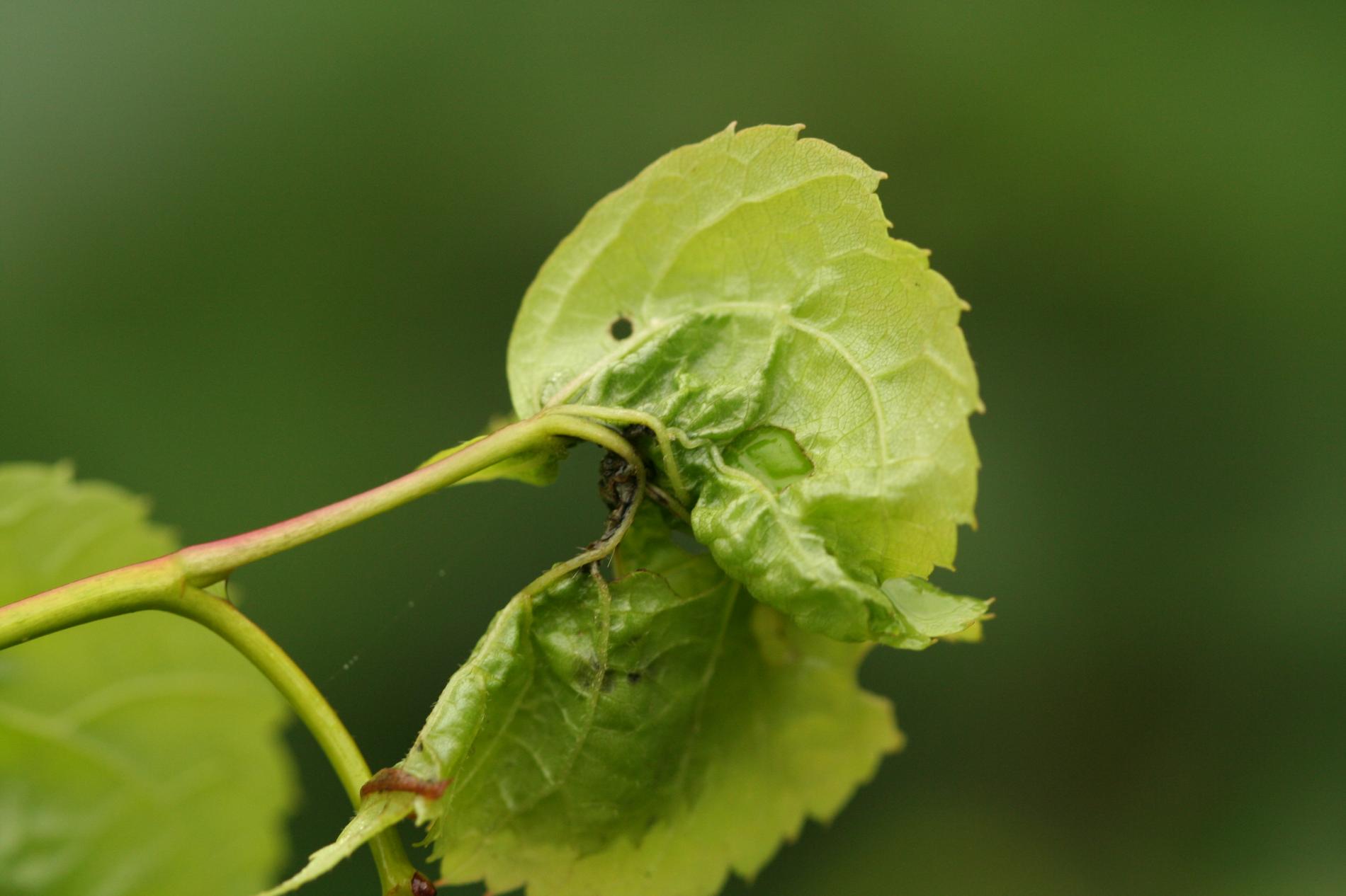 On affected linden trees, young terminal leaves are rolled and distorted with thickened veins. Inside the galls are orange-red larvae, and the galls give leaves a deformed appearance.