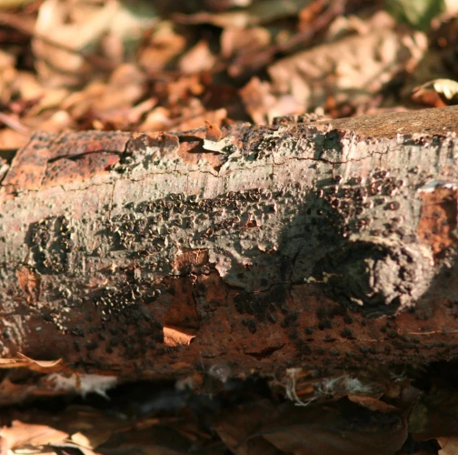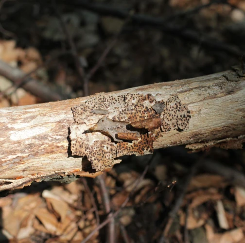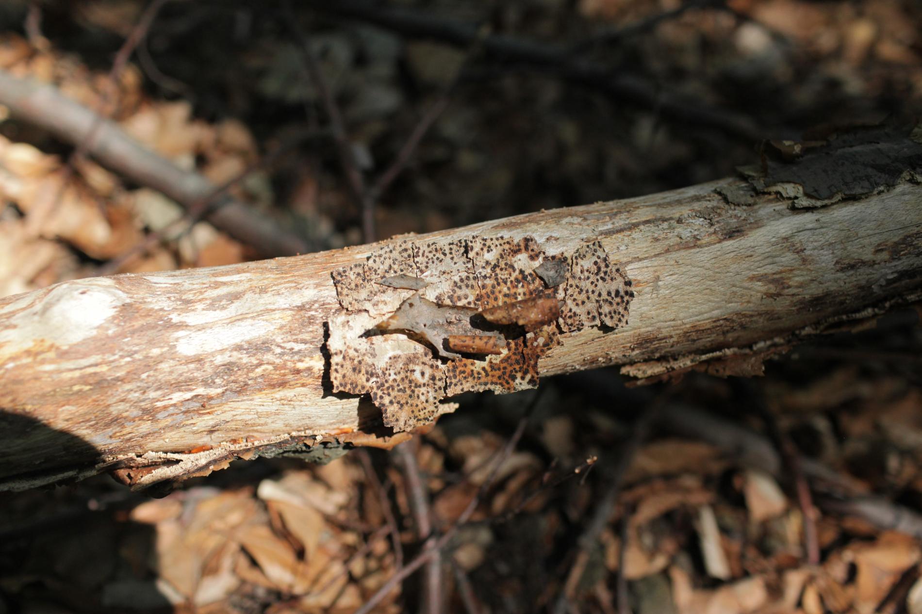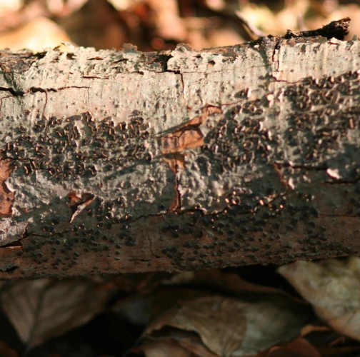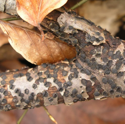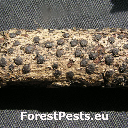 The stroma in the bark is paddy, circular, 2-4 mm long. In each stroma are found 25-50 oval-shaped and densely accumulated fruiting bodies. The mouth of fruiting bodies appears as tiny dots on the surface. The fungus attacks weakened, dying or completely dry branches of various broadleaves.