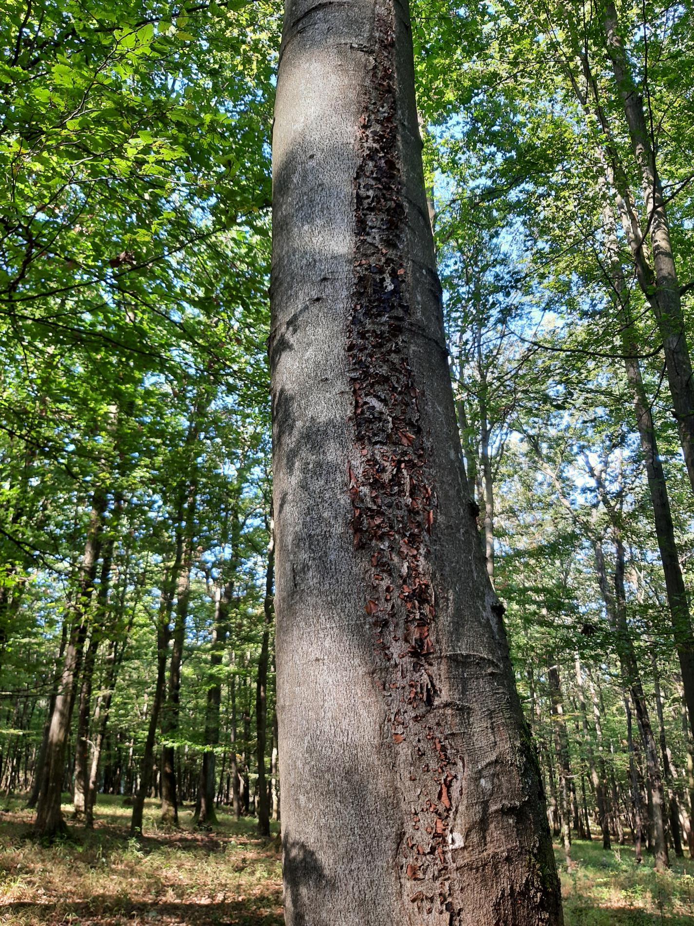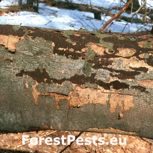 Diatrype stigma is a saprophytic to weak parasitic fungus striking by forming the black 1 mm thick cork-like stroma on relatively large surface areas of branches and trunks. It infects dead and lying trunks and branches, but also dying and weakened branches in lower part of trunk suffering from lack of light and nutrients. Thus, it helps to natural debranching of trunks. However, it gradually penetrates through damaged bark to wood of not only dead but also of living standing trunks and causes its white rot. Protection lies in keeping stand hygiene.
