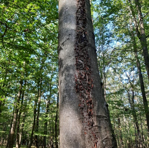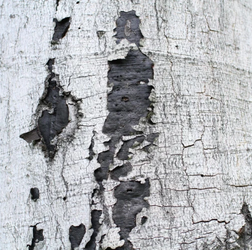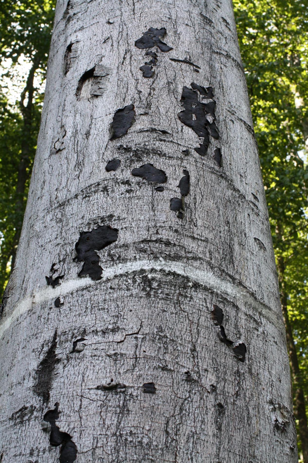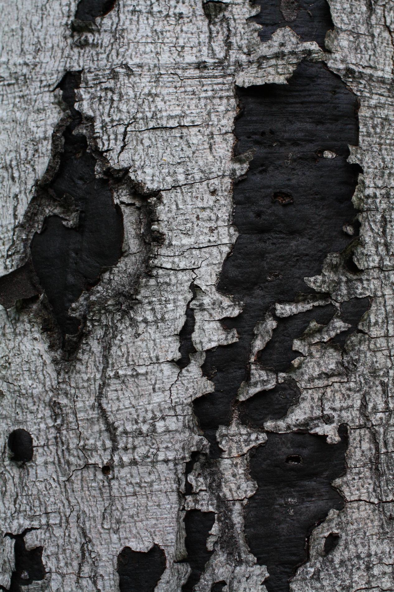 Black coating under cracked bark.