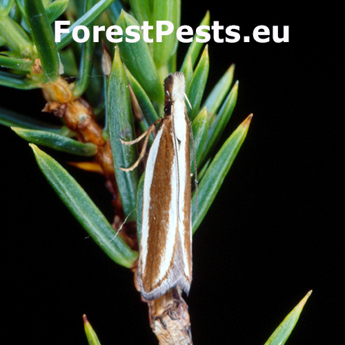 Juniper webber Dichomeris marginella is a small moth species of the family Gelechiidae associated mainly with junipers. Larvae develop on common juniper (Juniperus communis) as well as on ornamental and introduced juniper species, including Juniperus chinensis, J. horizontalis, J. recurva and J. virginiana. Caterpillars initially mine juniper needles and later feed externally within silken webs formed between needles and shoots. The species overwinters in larval stage and has one generation per year. It usually occurs in gardens, parks and natural habitats with juniper stands. The intensity of attack is usually not strong, but local outbreaks may negatively affect the aesthetic appearance of shrubs, especially in ornamental plantings, and repeated feeding can worsen the overall health condition of host plants. The species is widely distributed across Europe and has also been introduced to other regions.