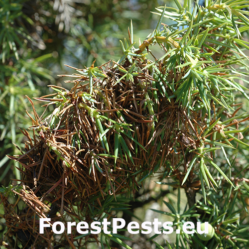 Silken webbing between needles and shoots is present. Needles inside the webs are damaged, partially eaten or hollowed, often mixed with frass.