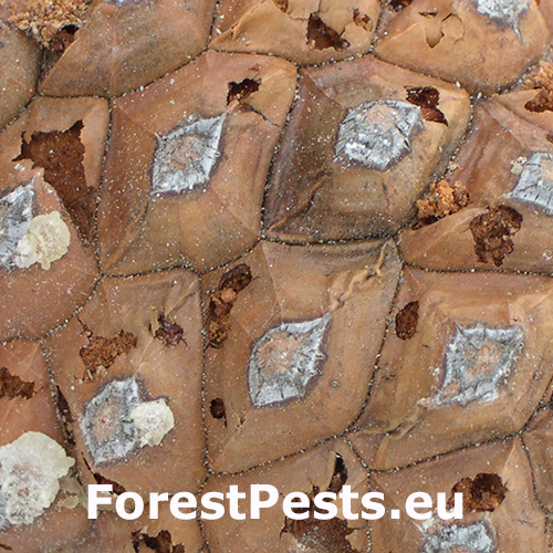 Damage includes resin exudation, wilting, and drying of affected pine shoots, along with the presence of small oval emergence holes. Cone attacks cause deformations and seed loss.