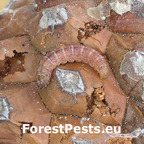 Dioryctria mendacella, commonly known as the pine cone moth, is a significant pest affecting Mediterranean pines, especially stone pine (Pinus pinea). The larvae primarily attack cones, boring into them and causing deformations, abnormal growth, and cone abortion, which results in significant seed loss. This moth is widespread in southern Europe, particularly in Portugal, Spain, and other Mediterranean countries. The life cycle includes at least two generations annually, with females laying eggs on the cones. Larvae can also attack pine shoots, causing shoot dieback and wilting.