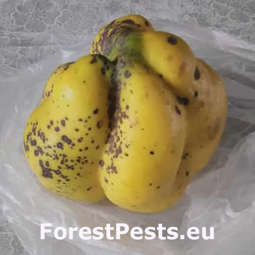 The fungus causes significant damage to quince trees by creating dark spots on leaves and fruits, leading to premature defoliation and reduced fruit quality. Severe infections can weaken trees, reducing their aesthetic value and productivity. Though it can also infect other Rosaceae species, the damage is generally less severe compared to quince.