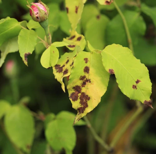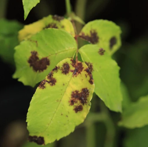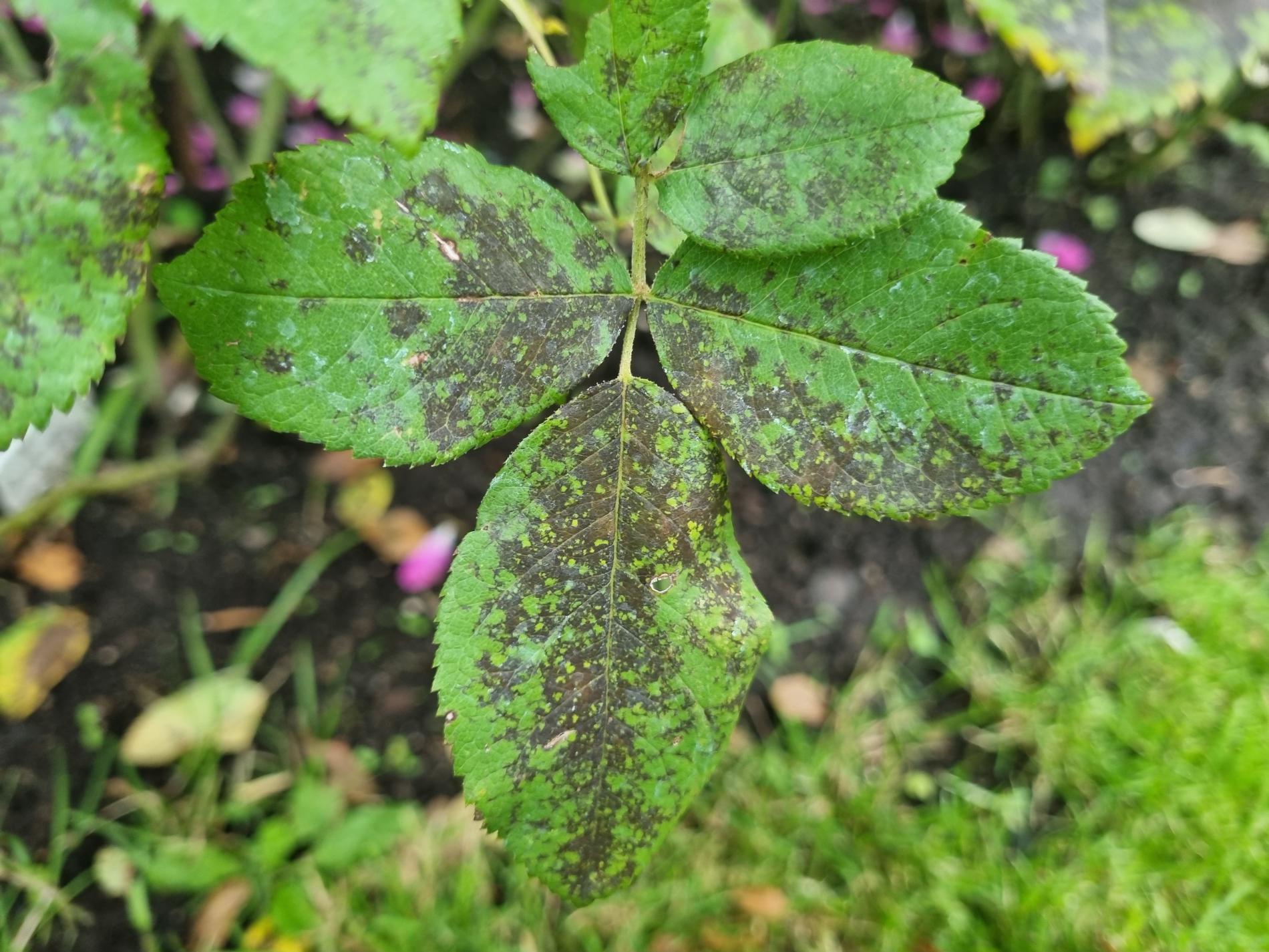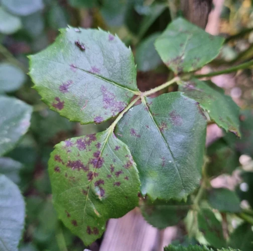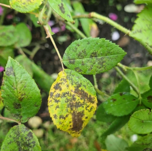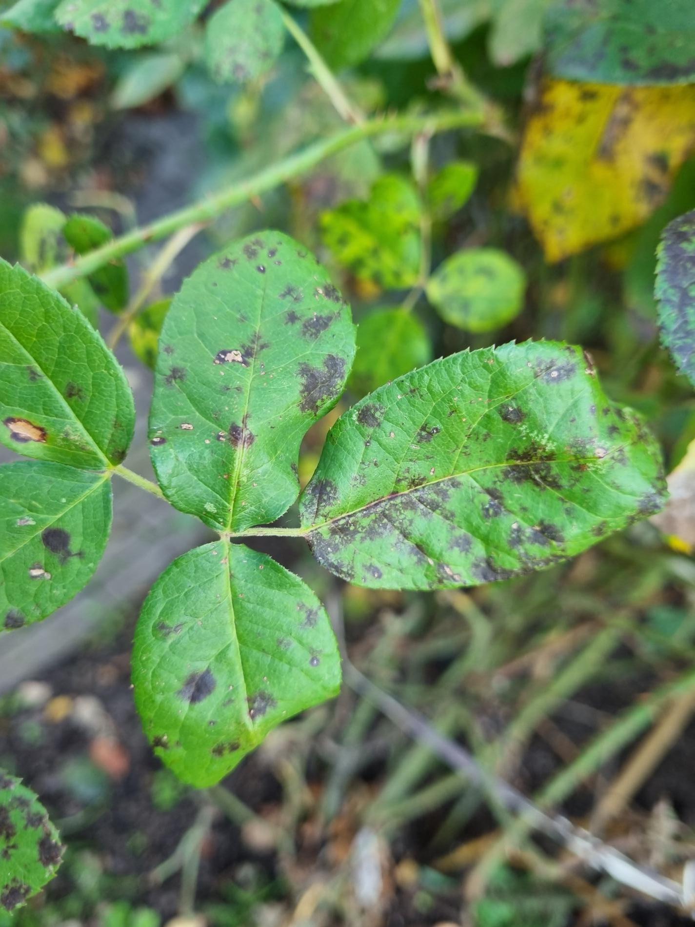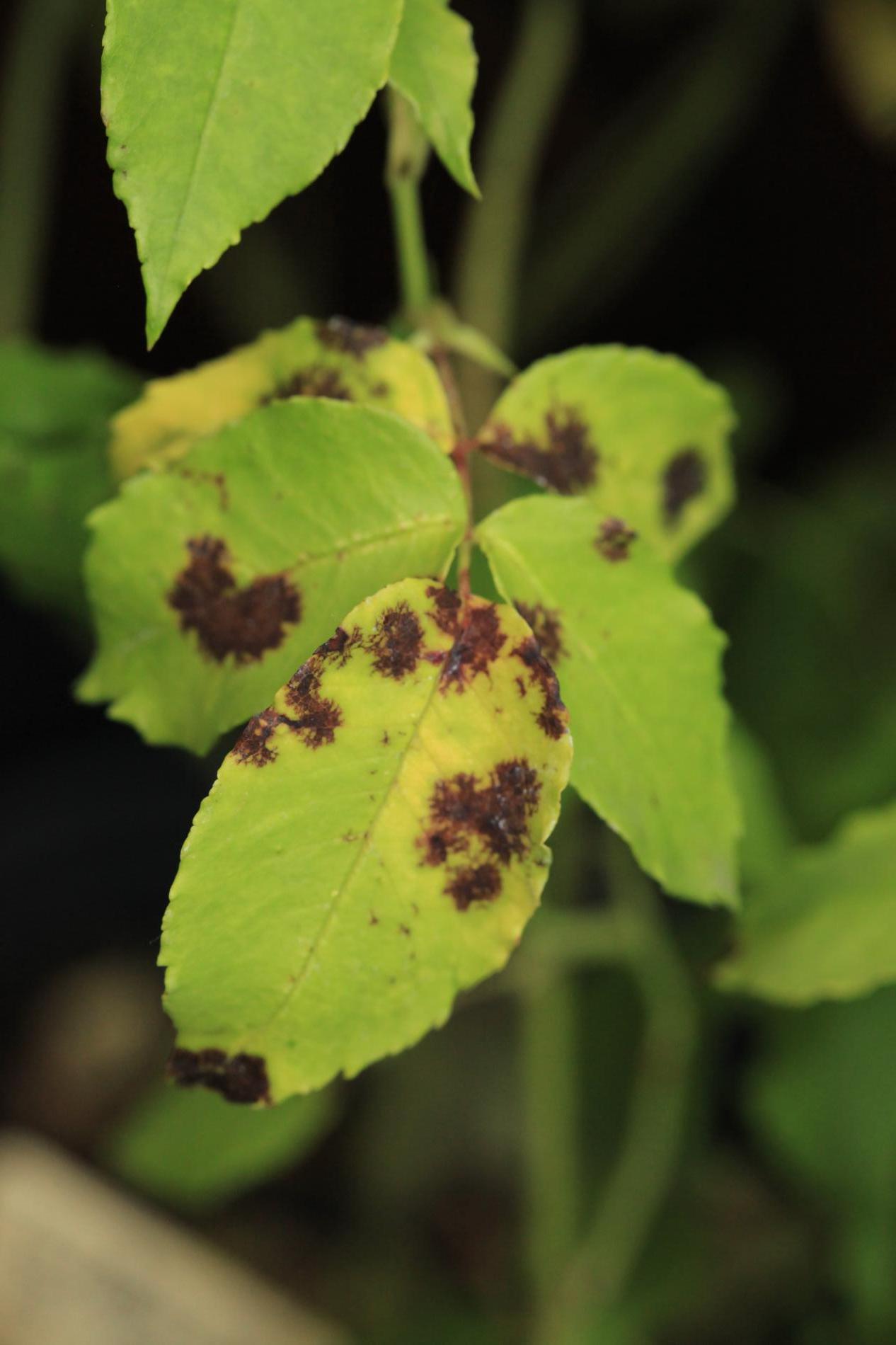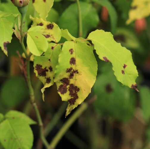 The primary symptom is the appearance of small, round black spots with fringed or irregular edges on the upper surfaces of rose leaves. These spots typically measure 0.5 to 2 centimeters in diameter. A yellow halo or chlorotic area often forms around the black spots, occurring as the tissue surrounding the spots becomes weakened and loses chlorophyll. As the disease progresses, the affected leaves weaken and eventually drop off the plant. This premature leaf drop can lead to significant defoliation, especially during rainy periods. In severe cases, the disease can spread to the stems and young shoots, causing dark lesions that affect the overall health and vigor of the plant. The loss of leaves diminishes the plant's ability to photosynthesize, resulting in stunted growth, reduced flowering, and a generally weakened plant.