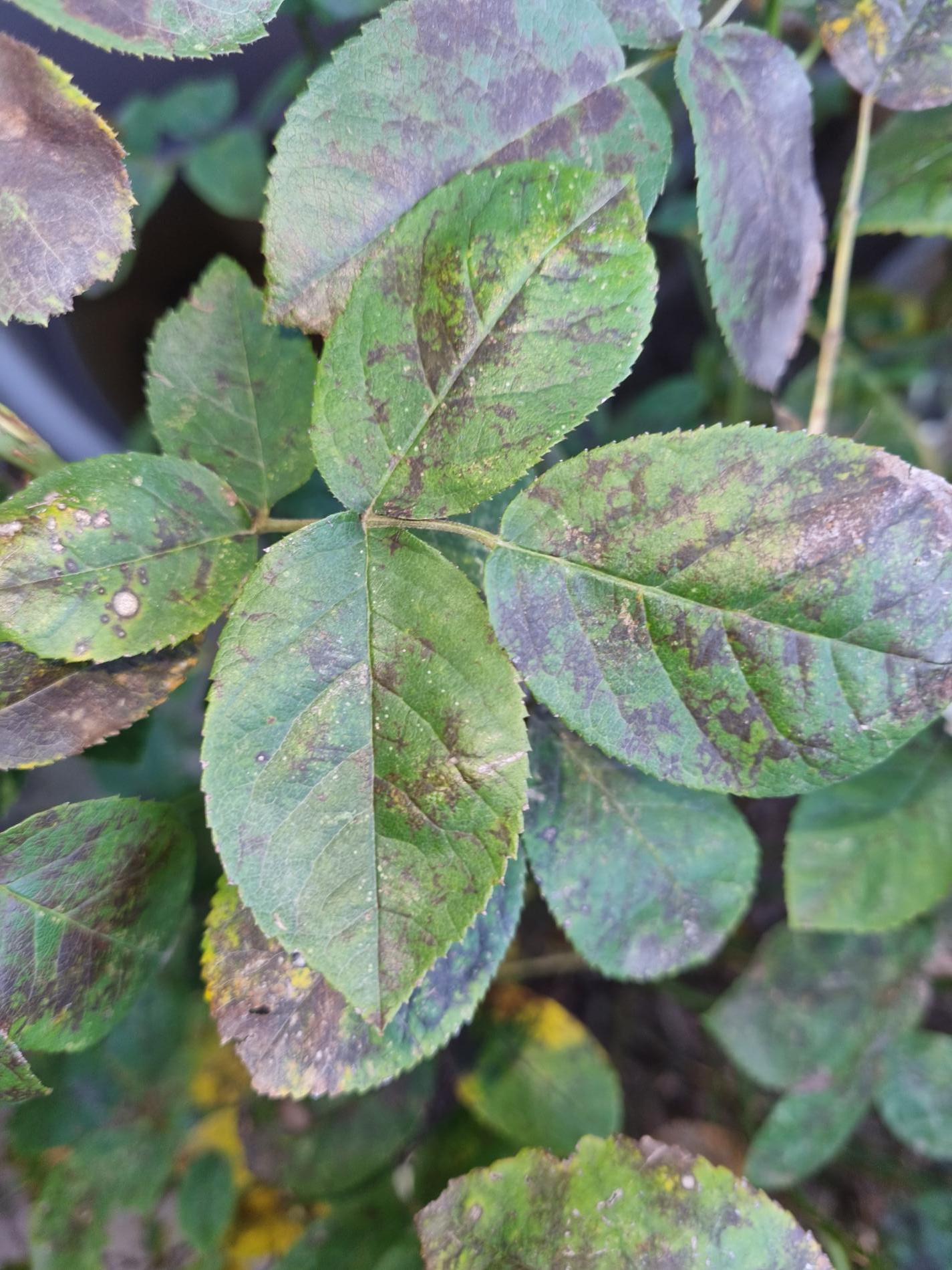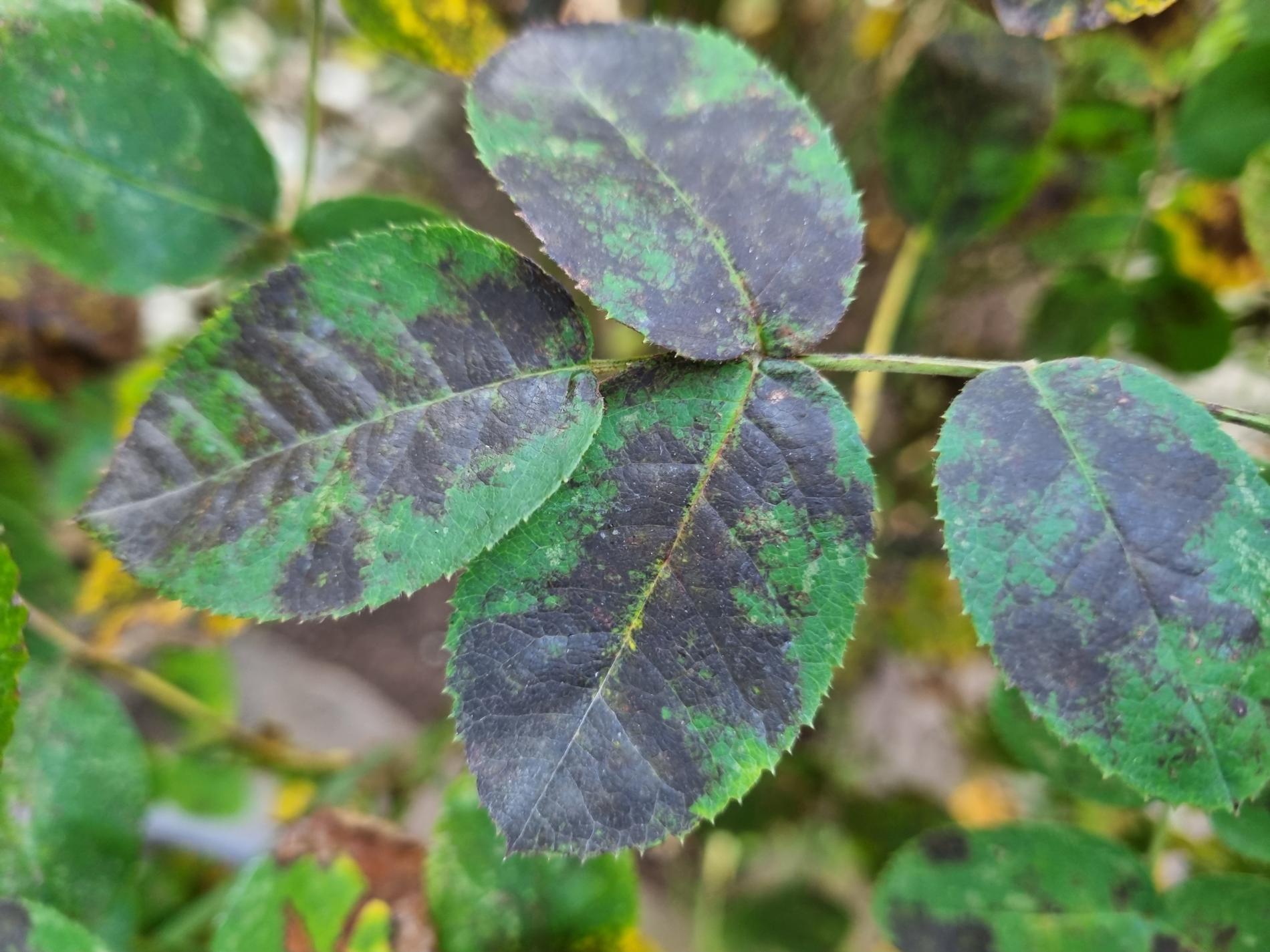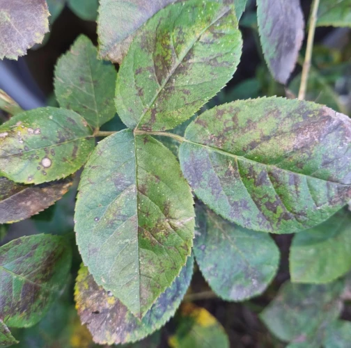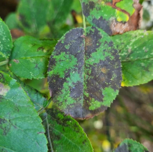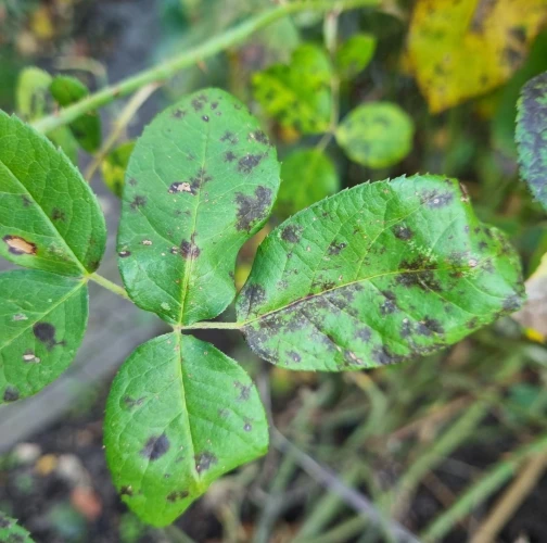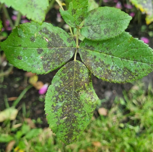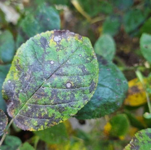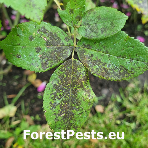 Diplocarpon rosae, also known as black spot disease, is one of the most important and widespread diseases affecting roses. The asexual stage of the pathogen is known as Marssonina rosae, while the sexual and most common stage is Diplocarpon rosae. This disease manifests as dark brown to black spots on the leaves, which gradually enlarge. As a result, the affected leaves turn yellow, dry out, and eventually fall off. If left untreated, the rose plant can lose a significant portion of its leaves, becoming weak and unattractive, with reduced flowering. Diplocarpon rosae overwinters in fallen leaves, and its spores are released in spring, particularly during wet, cool weather. Infection is most common after rainy periods or frequent overhead watering. Proper care involves watering only at the base of the plant, avoiding wetting the leaves and stems (especialy in the evening). Regular fertilization, pruning, removal of attacked (fallen) leaves, and preventive fungicide treatments starting in early spring can help manage the disease. Photinia, another member of the rose family, can also be affected by this fungus.