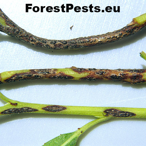 The fungus causes tiny irregular blackish brown spots on leaves and shoots as well as canker wounds on the green bark of twigs. Infected leaves get dry and fall off prematurely.