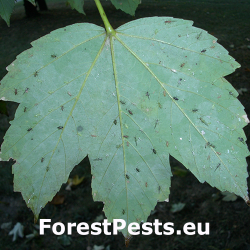 Damage includes leaf curling, chlorosis, and honeydew secretion, which promotes sooty mold formation, impairing photosynthesis and reducing the tree's aesthetic appeal. Severe infestations can weaken trees and inhibit growth. Drepanosiphum platanoidis is widespread in Europe and commonly found in urban parks and natural stands of sycamore maples.