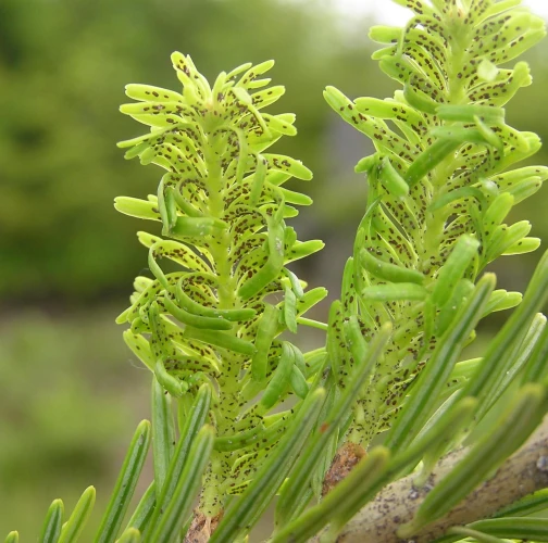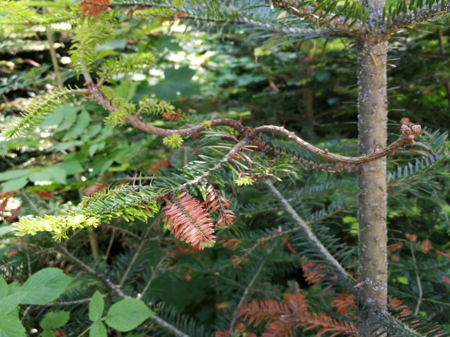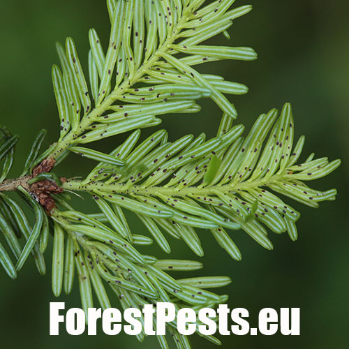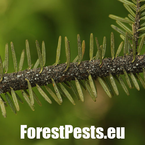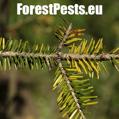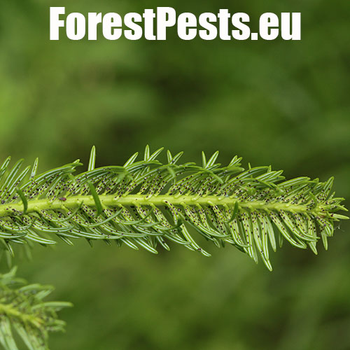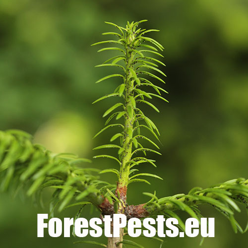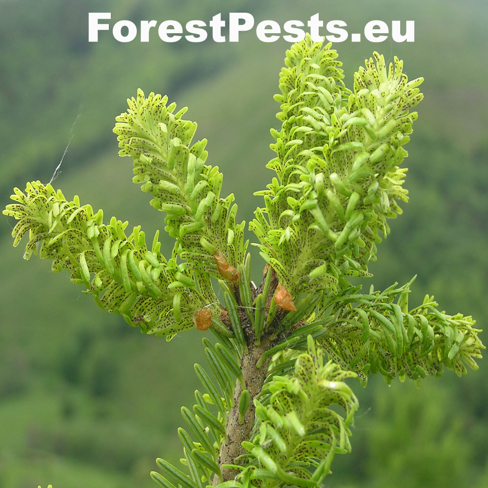 It is an aphid whose larvae are only a few tenths of a millimeter long. For the most part of their development, they are coated with a white wax-like cotton wool. They overwinter on trunks at the stage called sistens. In early spring, the sistens mature and lay eggs from which larvae hatch. A part of them creeps down to the lower side of flushing needles (progrediens) and the other part remains on the trunk. Damage is caused by sucking of young larvae on the needles and young shoots. As a result of sucking, the needles curl down, turn yellow and shorten. Common occurrence of this pest causes the needles to grow only to a length of 0.5–1 cm. The shoots have a bottle-like swelling at the base. It often causes very serious damage to young fir forests stands (up to the age of 20–30 years) in mountainous areas.